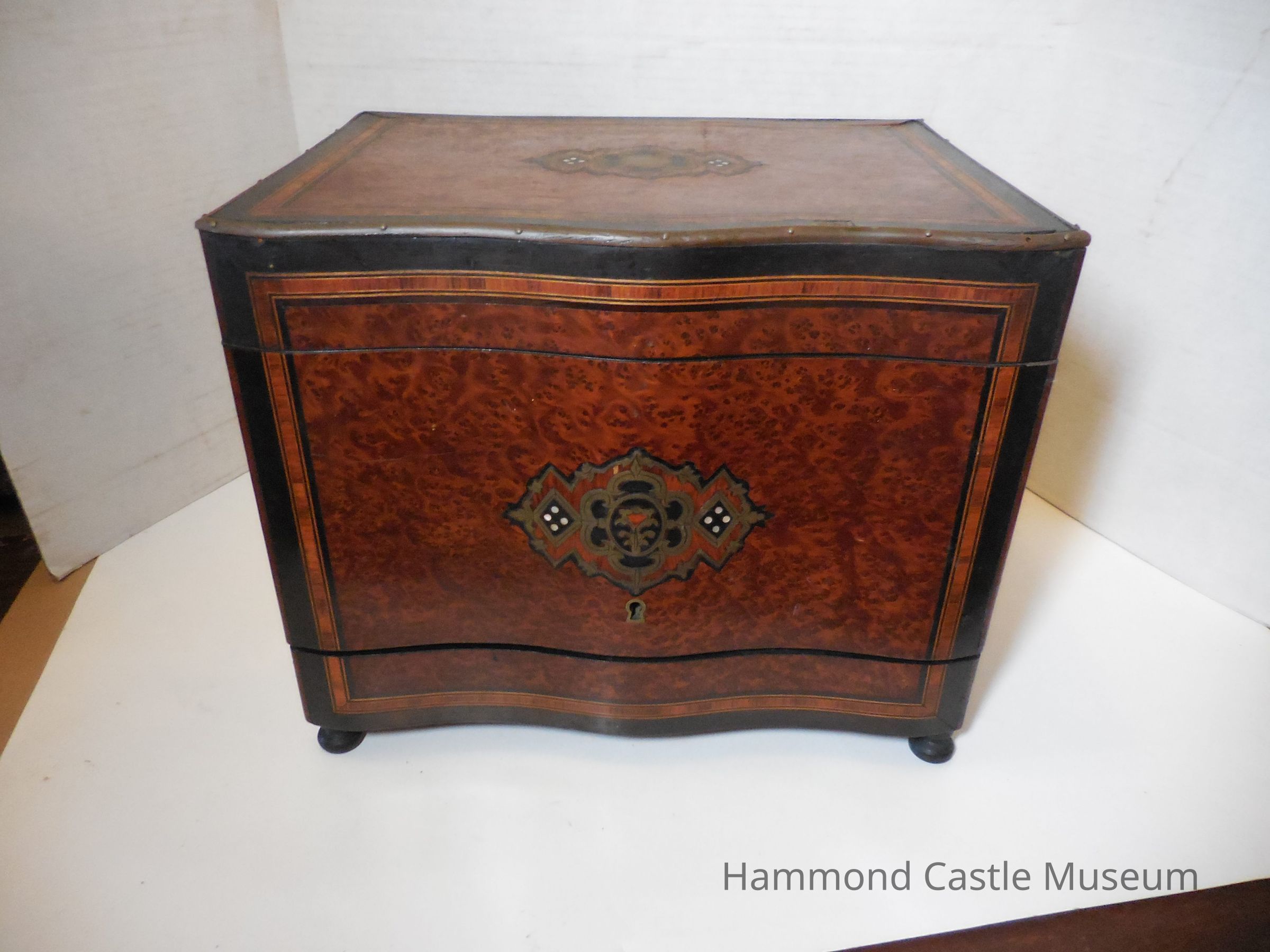 Case (.a) curved front and top slide up and back, sides fold down. Floral and diamond mother-of-pearl and wood inlay design on top and also above lock. Mushroom feet.