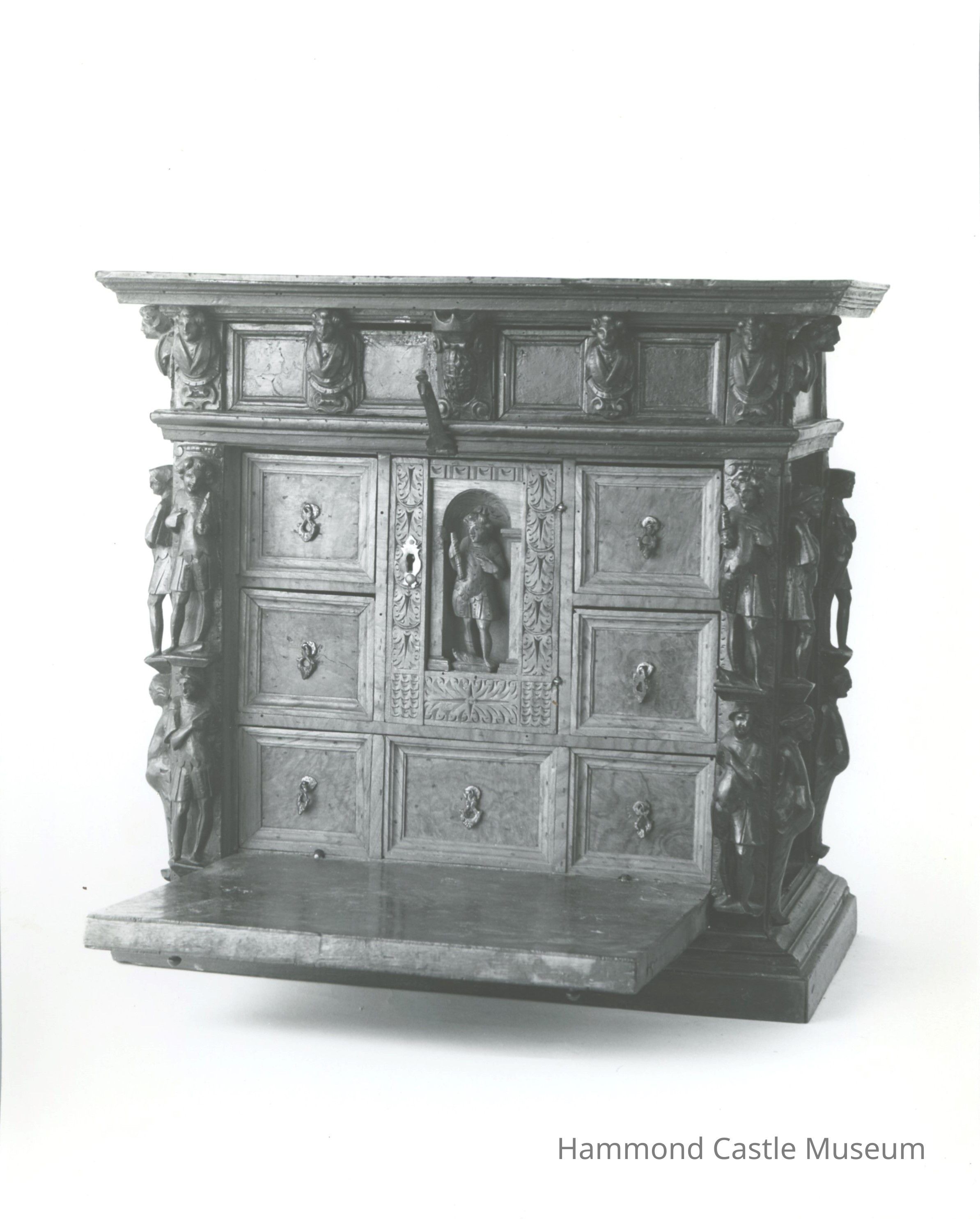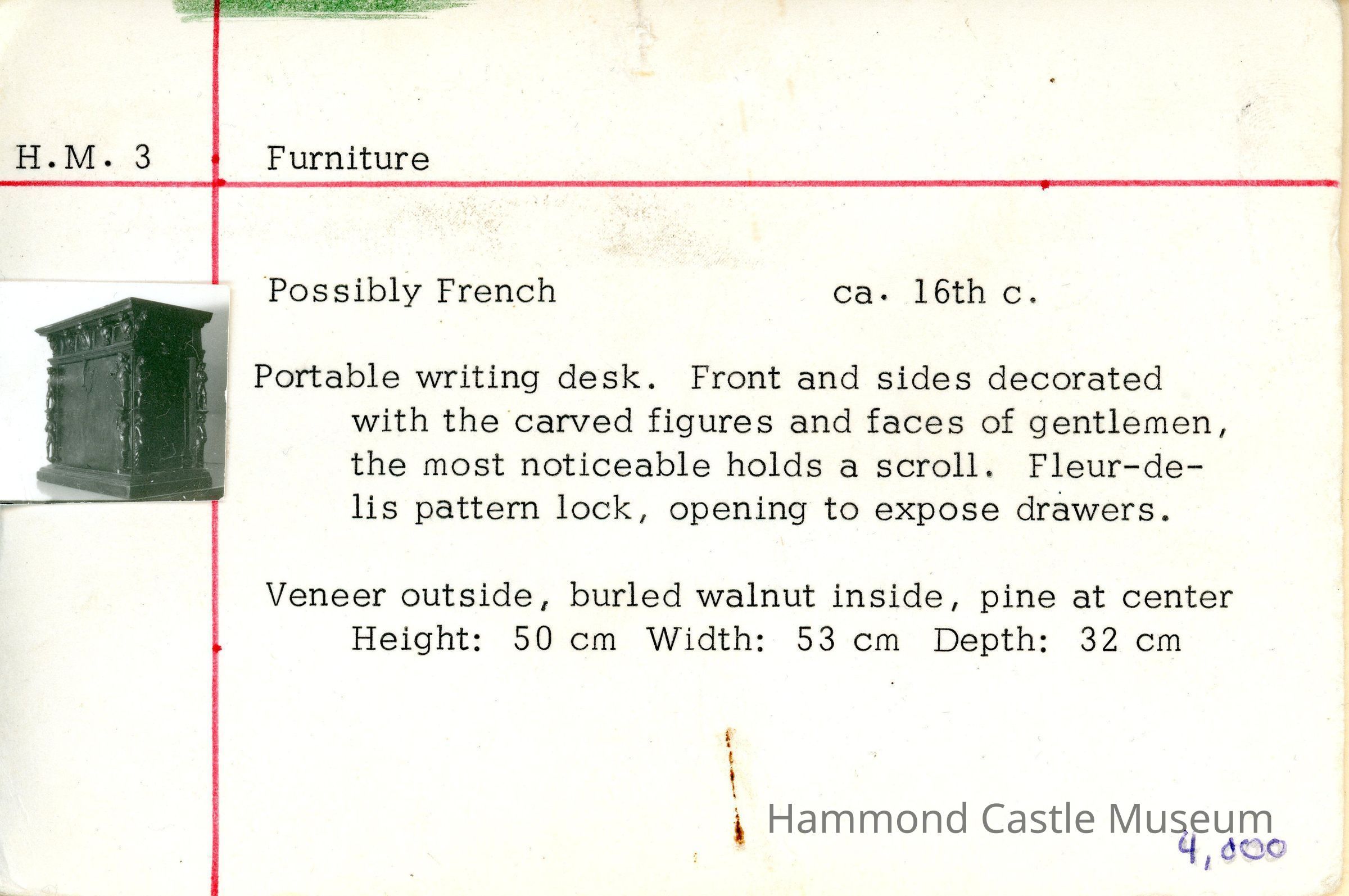 Portable writing desk. Front and sides decorated with the carved figures and faces of gentlemen, the most noticeable holds a scroll. Fleur-de-lis pattern lock, opens to expose drawers.