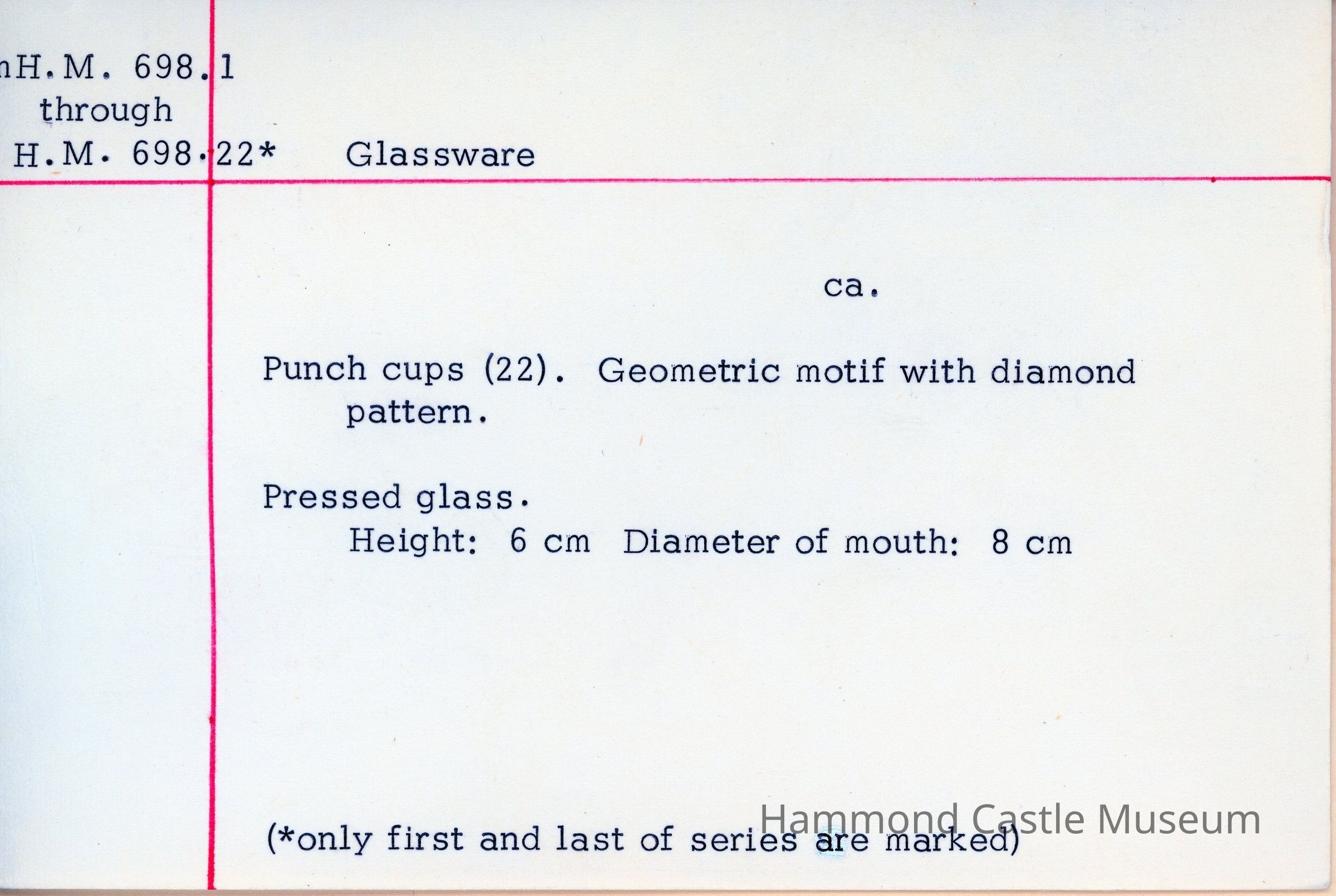 Set of 22. Geometric motif with diamond pattern. Pressed glass.