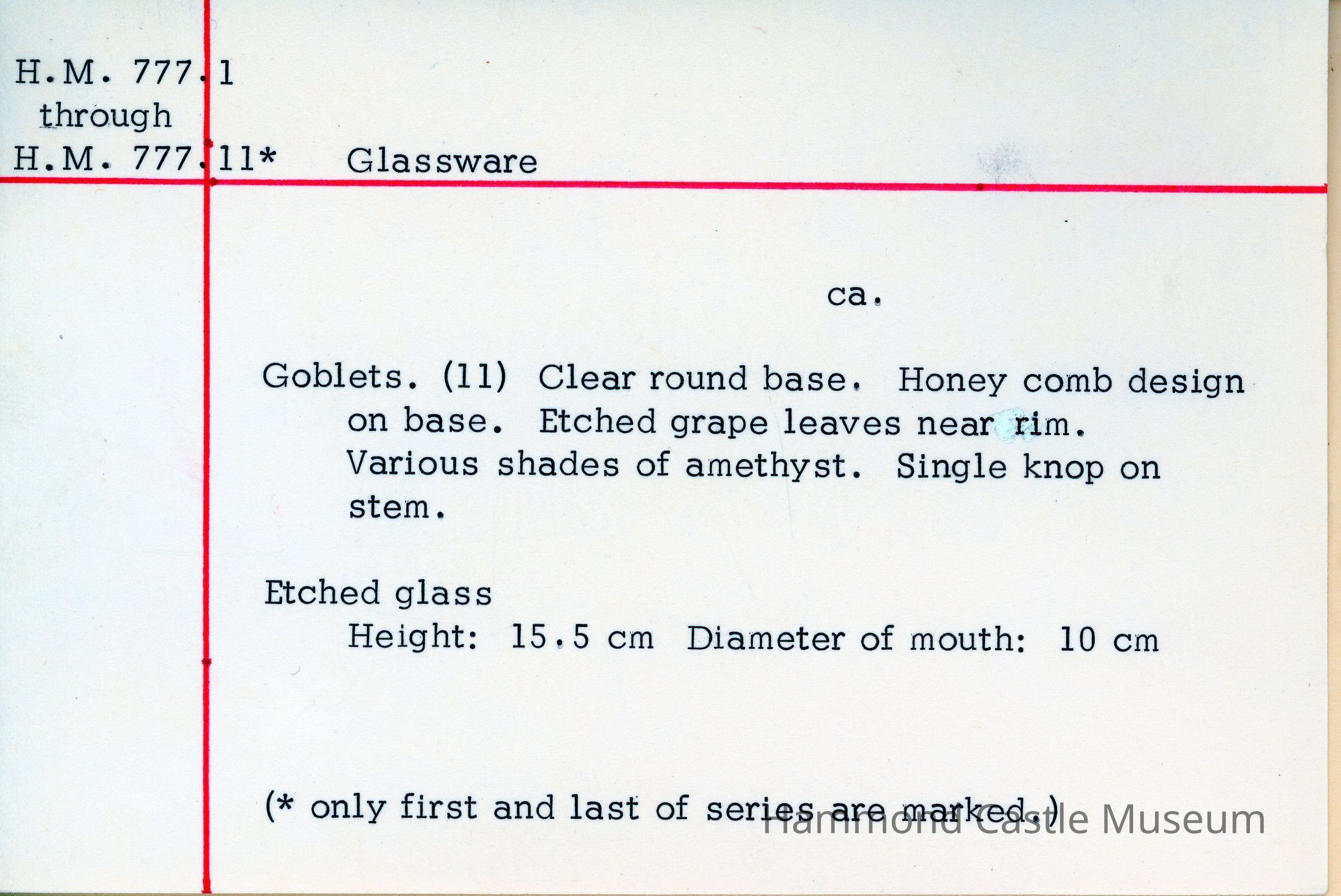 Set of 11 goblets. Clear round base. Honey comb design on base. Etched grape leaves near rim. Various shades of amethyst. Single knop on stem.