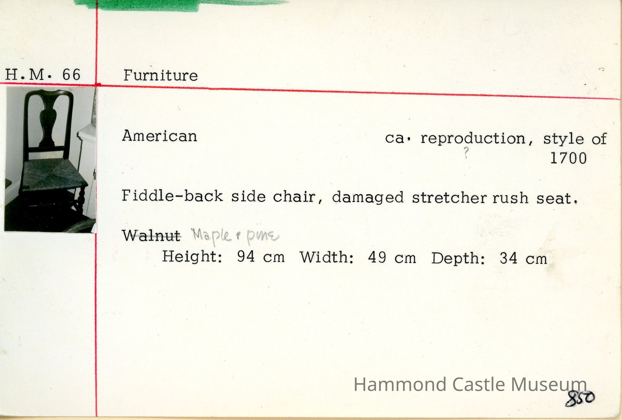 Reproduction, style of Queen Anne (ca. 1700). Fiddle-back side chair, damaged stretcher rush seat. Matches HM-65