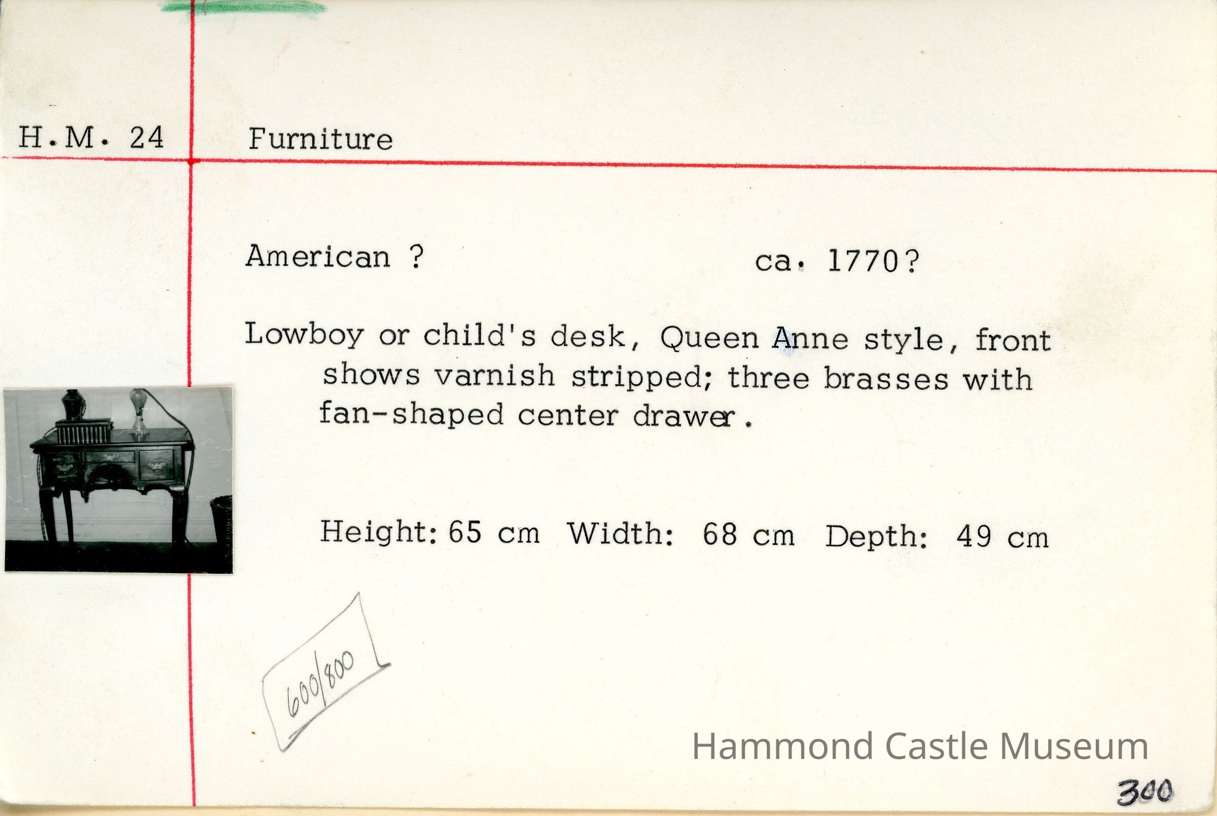 Lowboy or child's desk, Queen Anne style. Front shows varnish stripped; three brasses with fan-shaped center drawer.