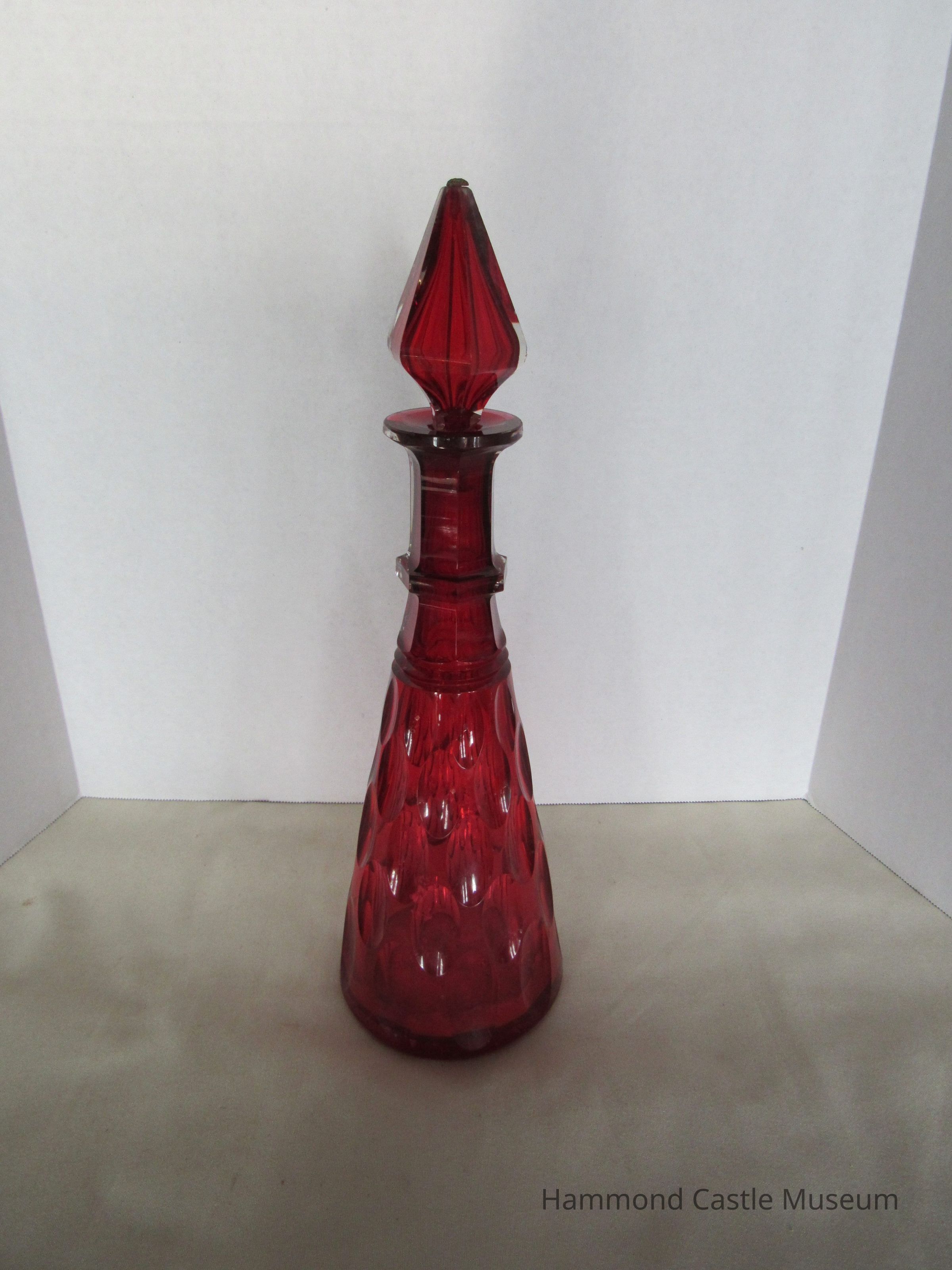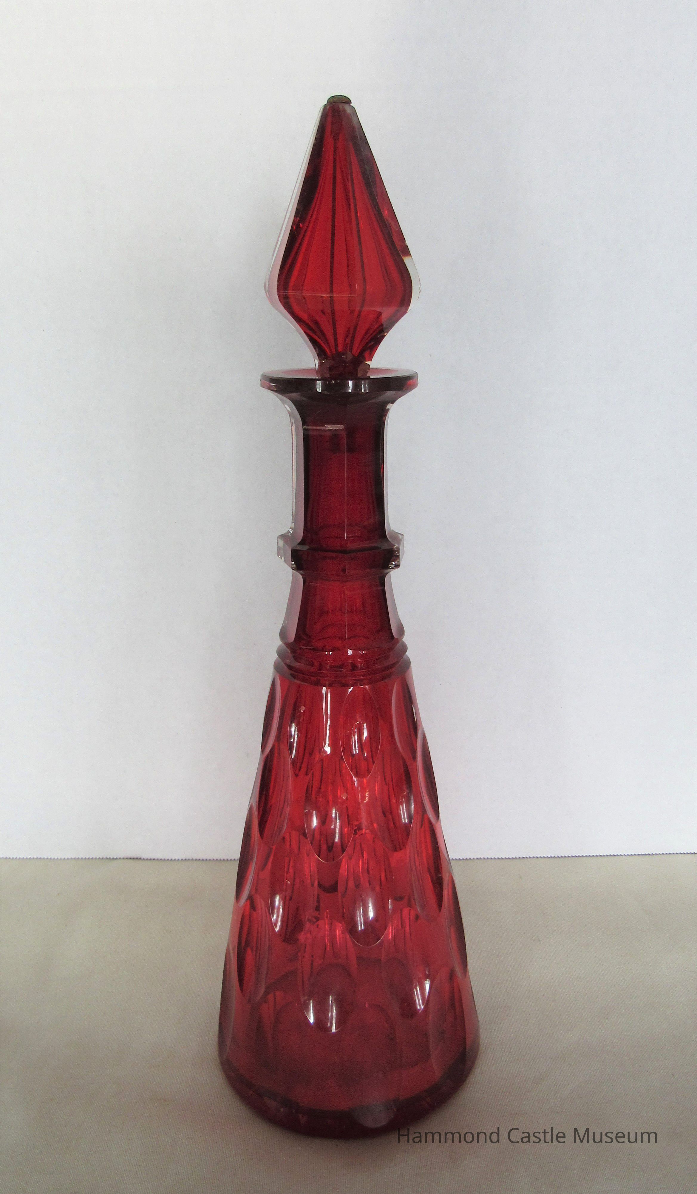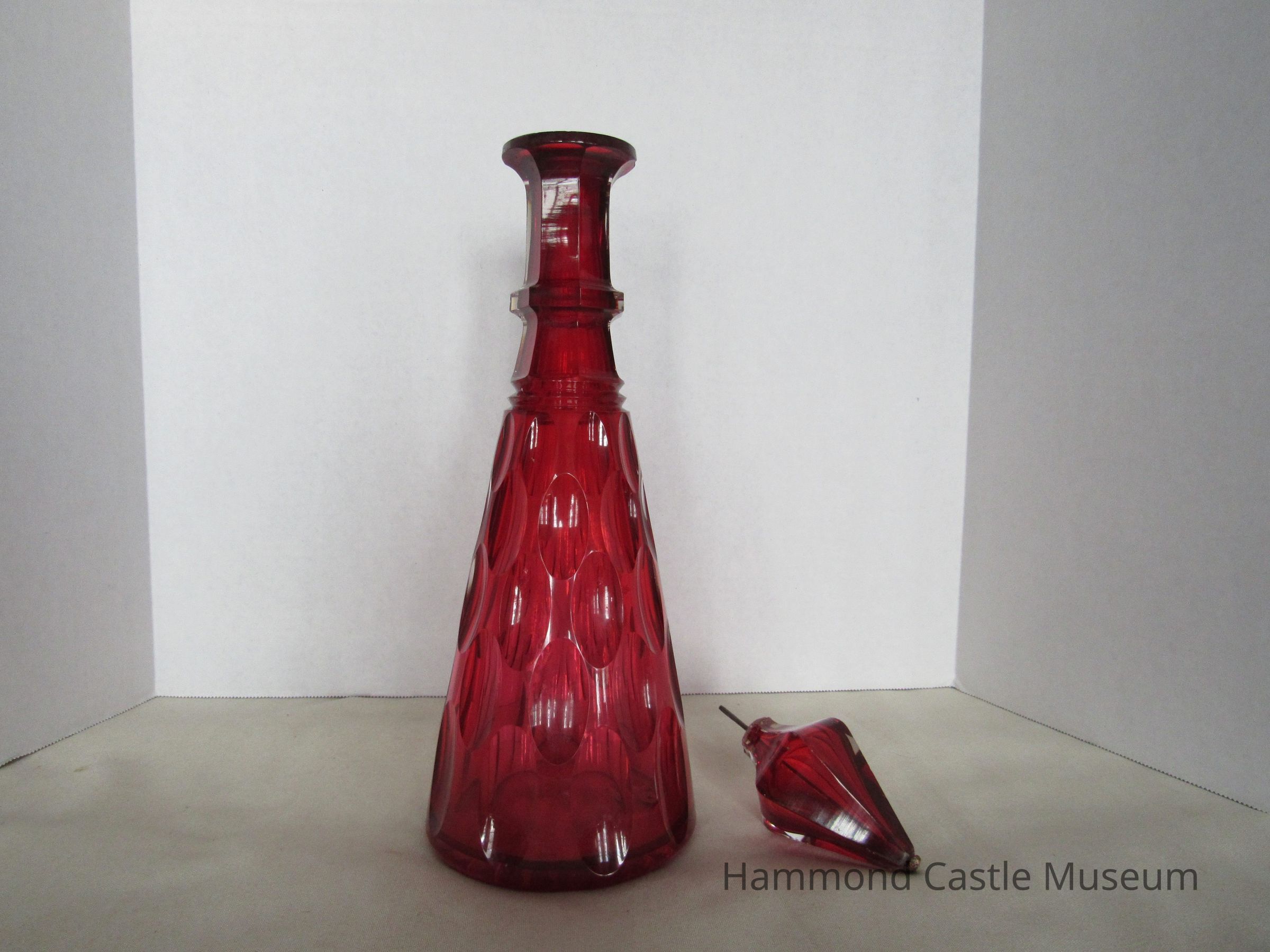 Decanter and stopple. Trumpet shaped with teardrop pattern on side. Condensation visible on inside. Pear-shaped stopple. Red. Stopple is broken