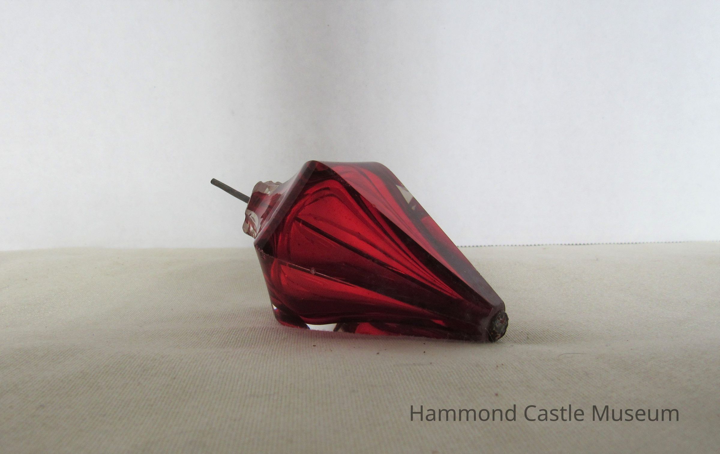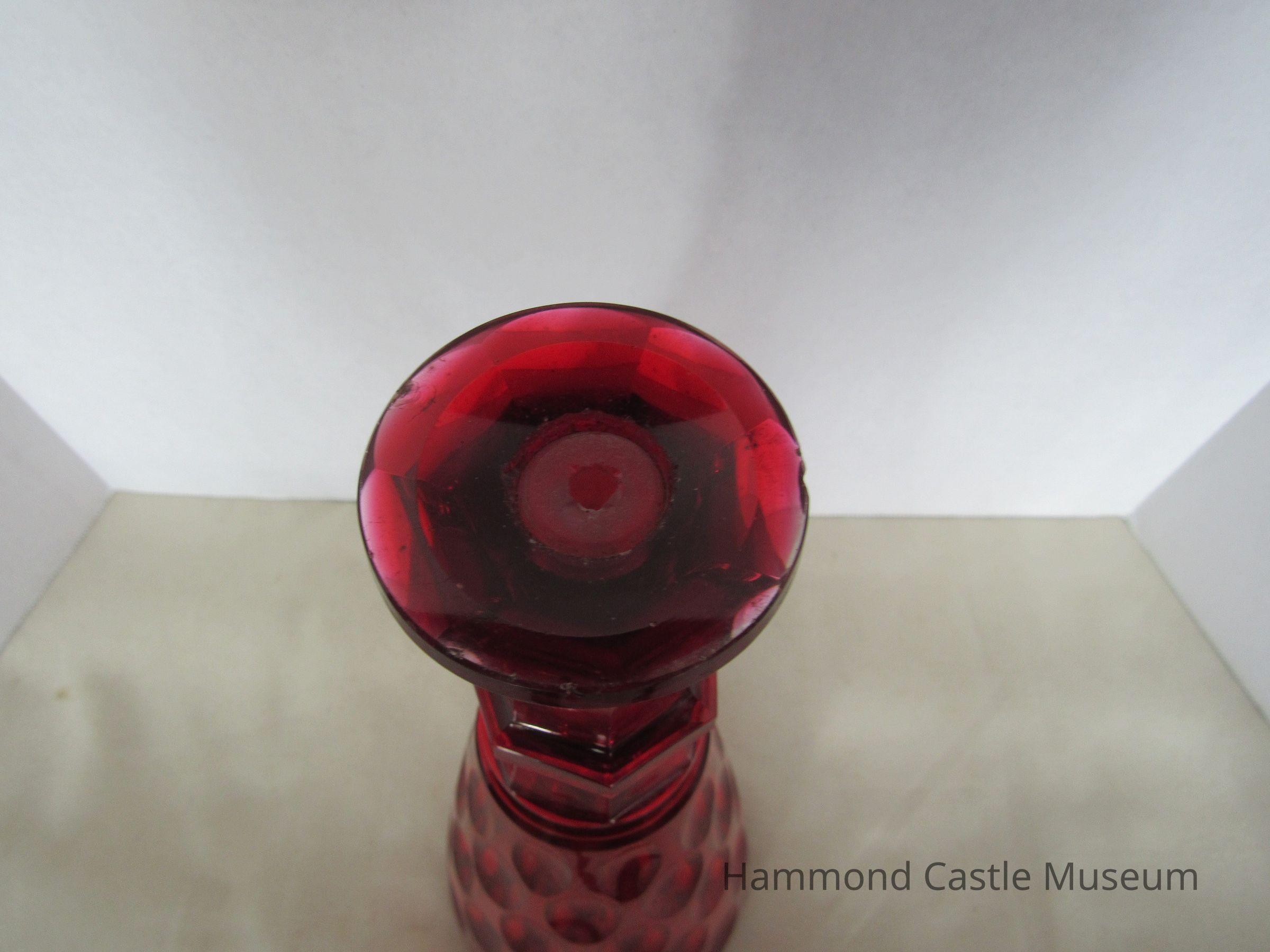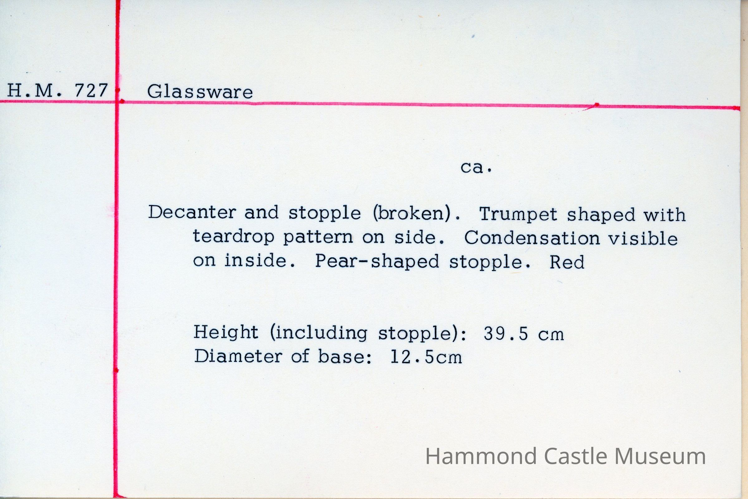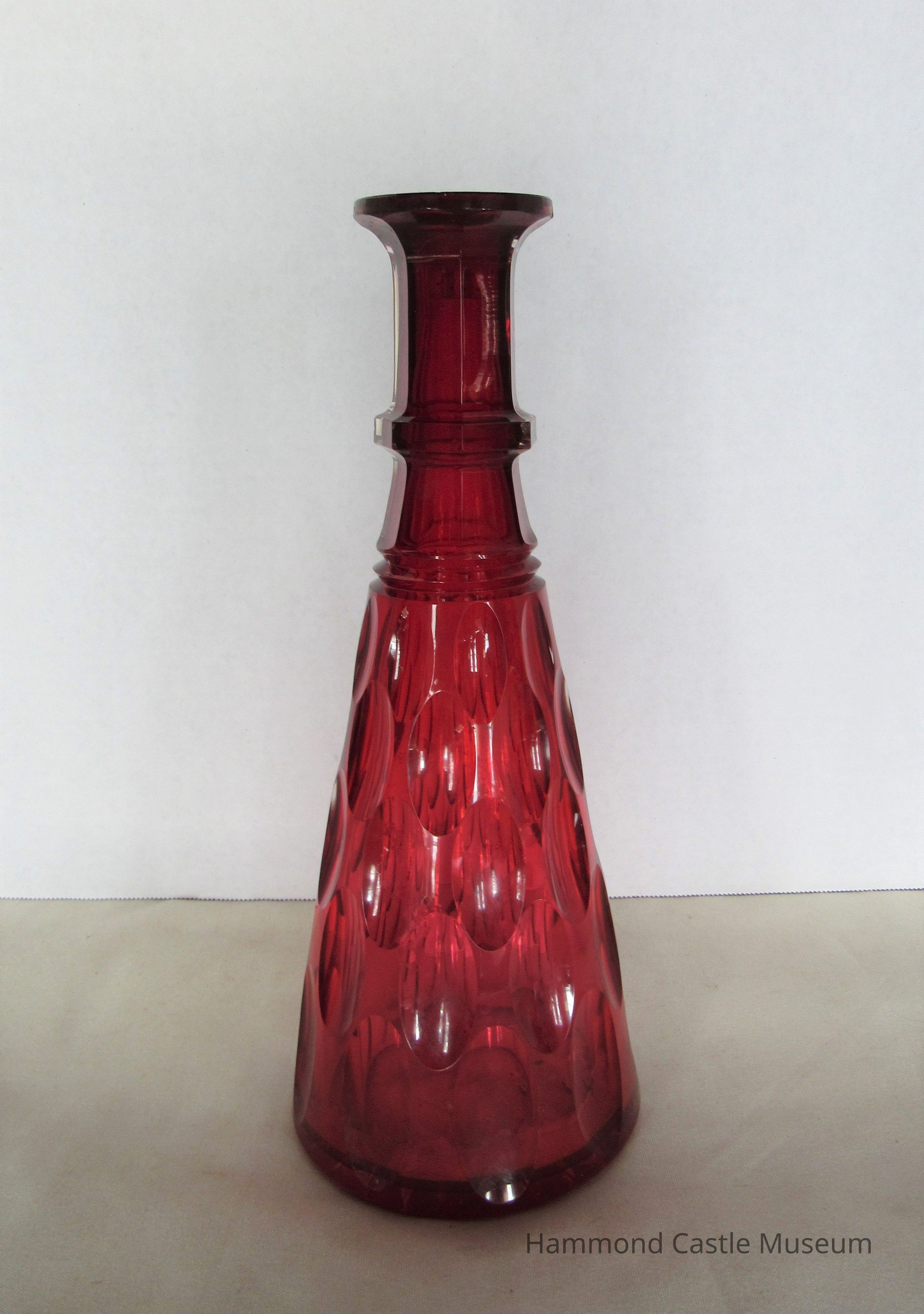 Decanter and stopple. Trumpet shaped with teardrop pattern on side. Condensation visible on inside. Pear-shaped stopple. Red. Stopple is broken