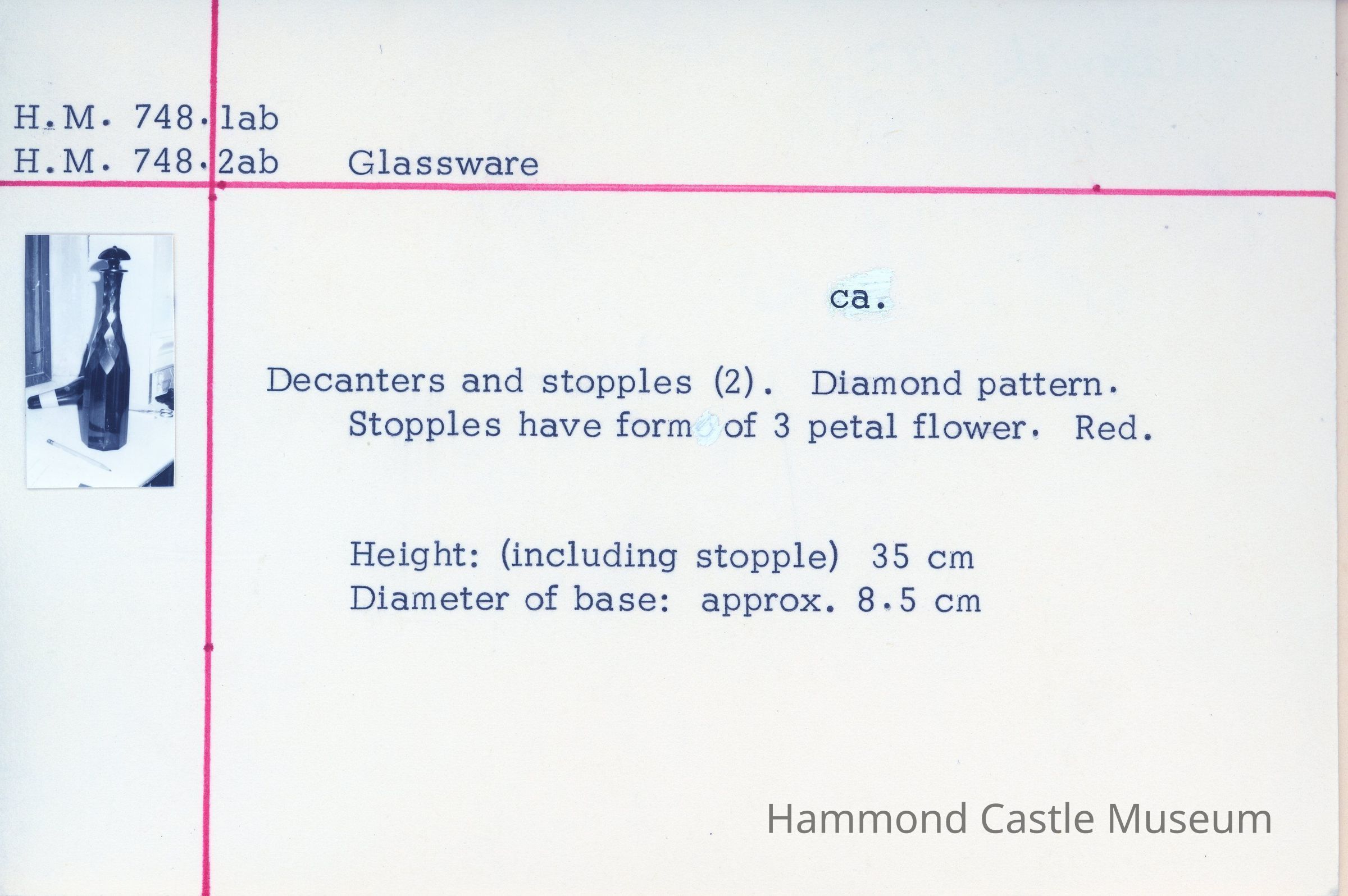 Set of two decanters and stopples. Diamond pattern. Stopples have form of 3 petal flowers. Red.