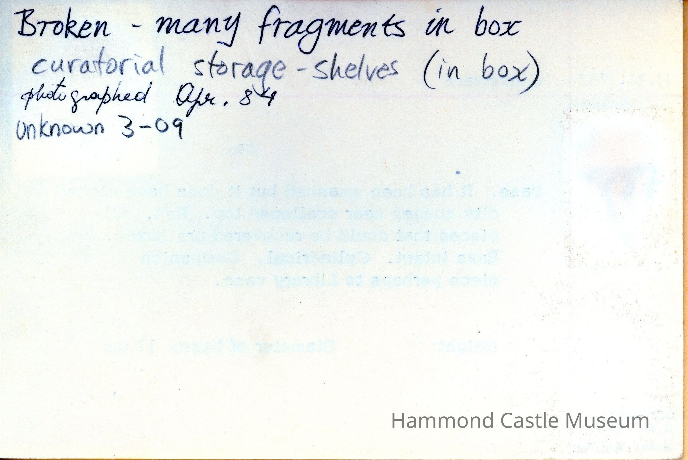 Vase. It has been smashed but it does have etched city scenes near scalloped top. Red. All pieces that could be recovered are boxed. Base intact. Cylindrical. Companion piece perhaps to Library vase. See H.M.710 and H.M.813ab.