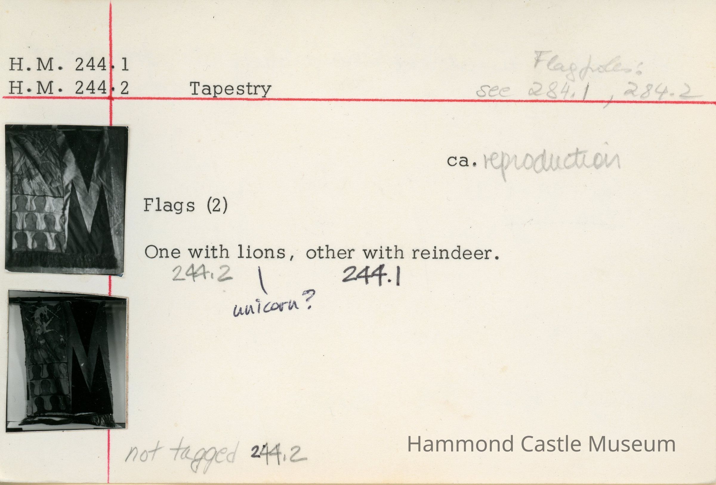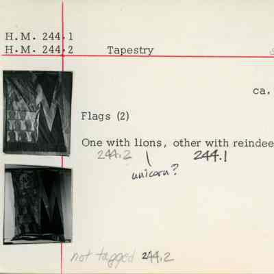 Pair of two flags: one depicts reindeer (244.1) and one depicts either lions or unicorns (244.2).