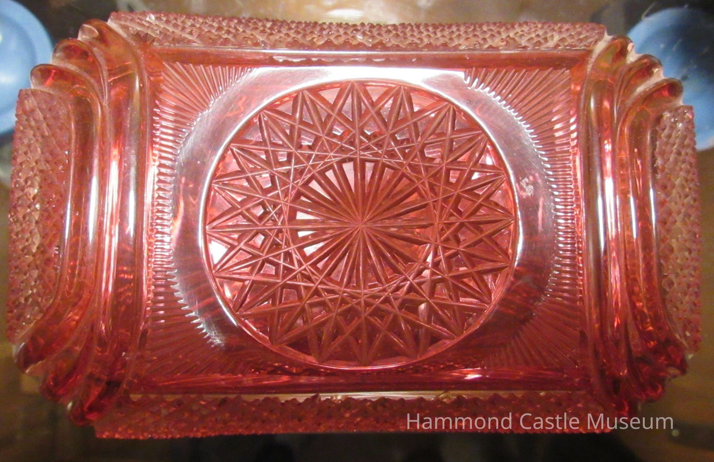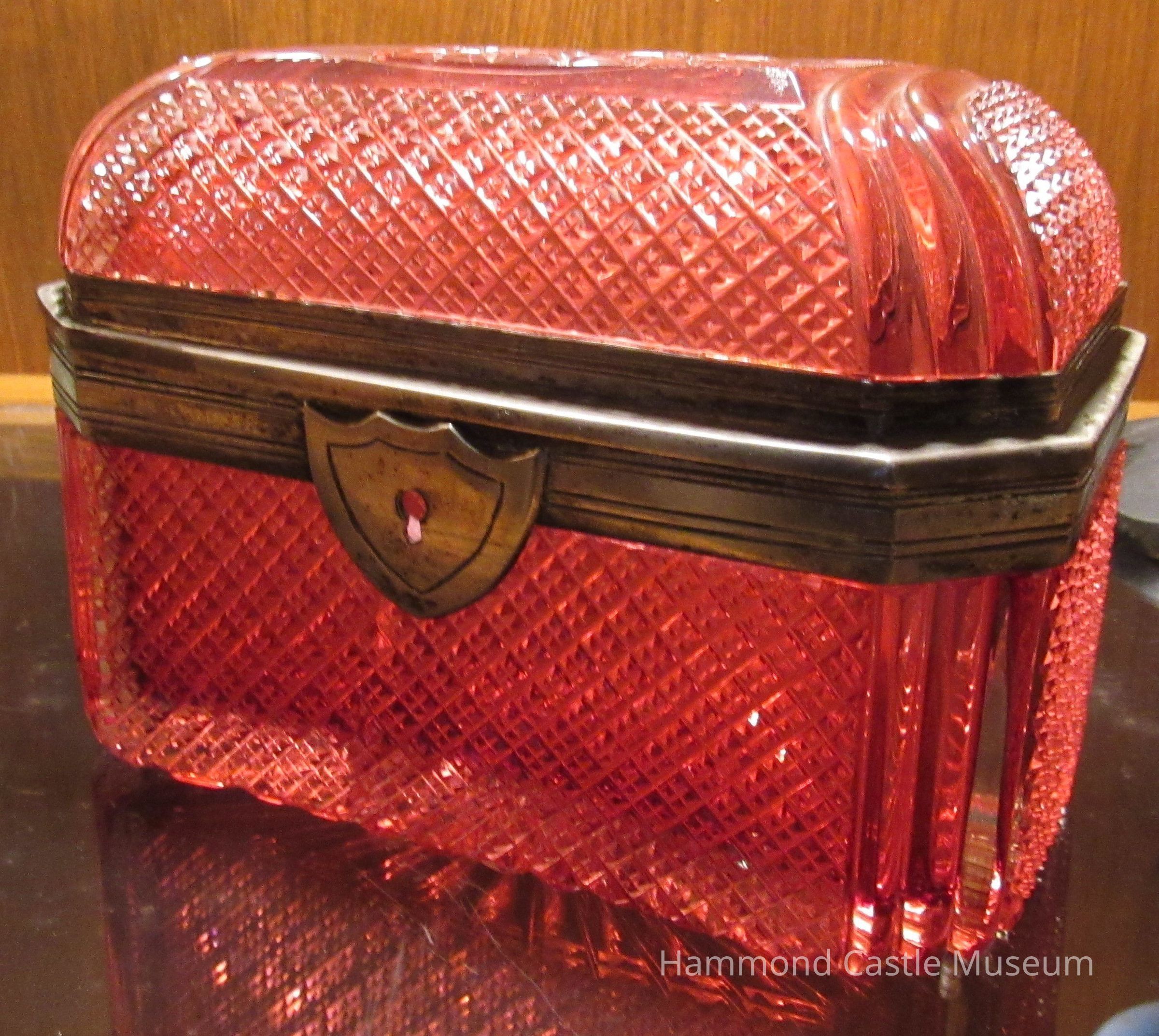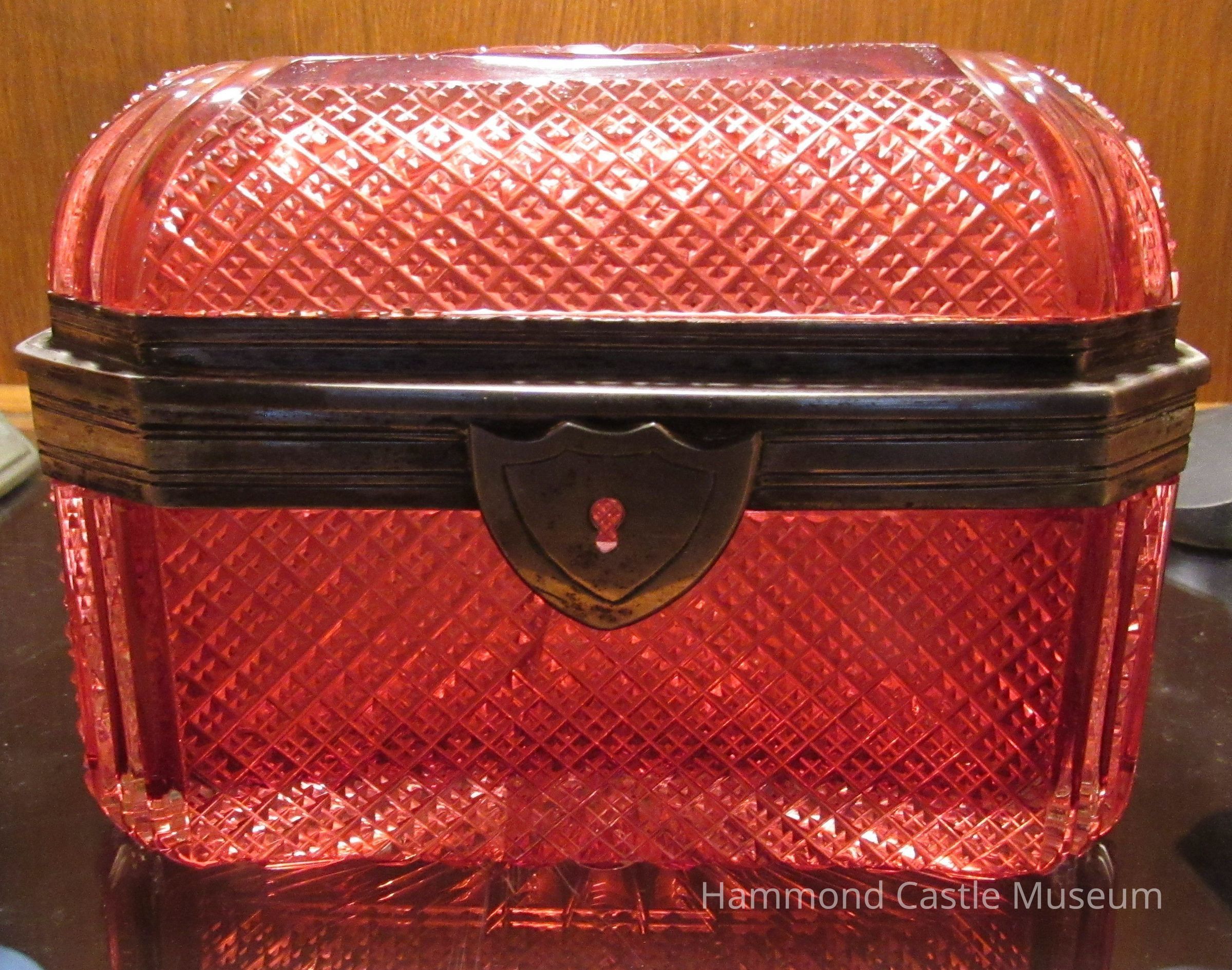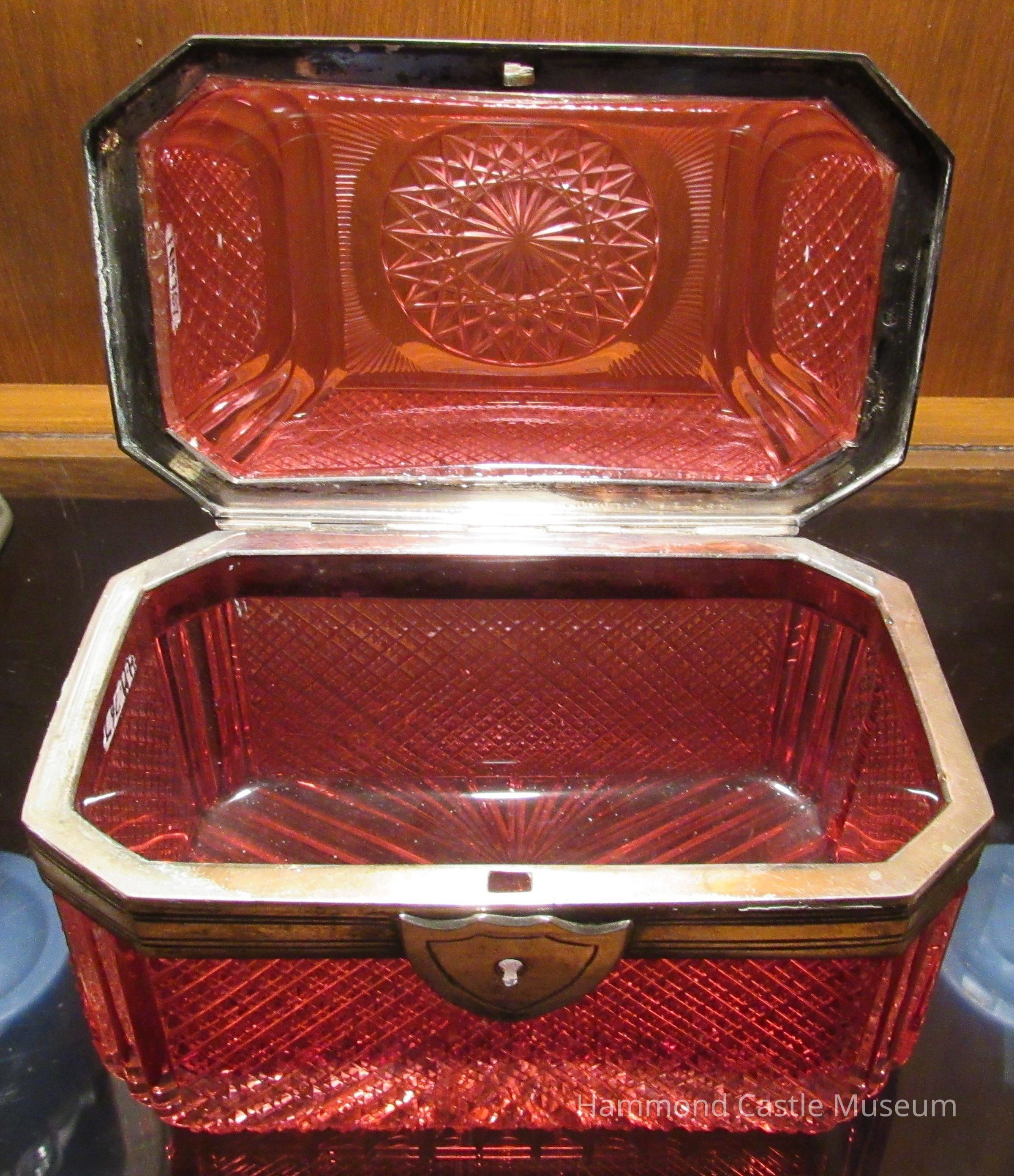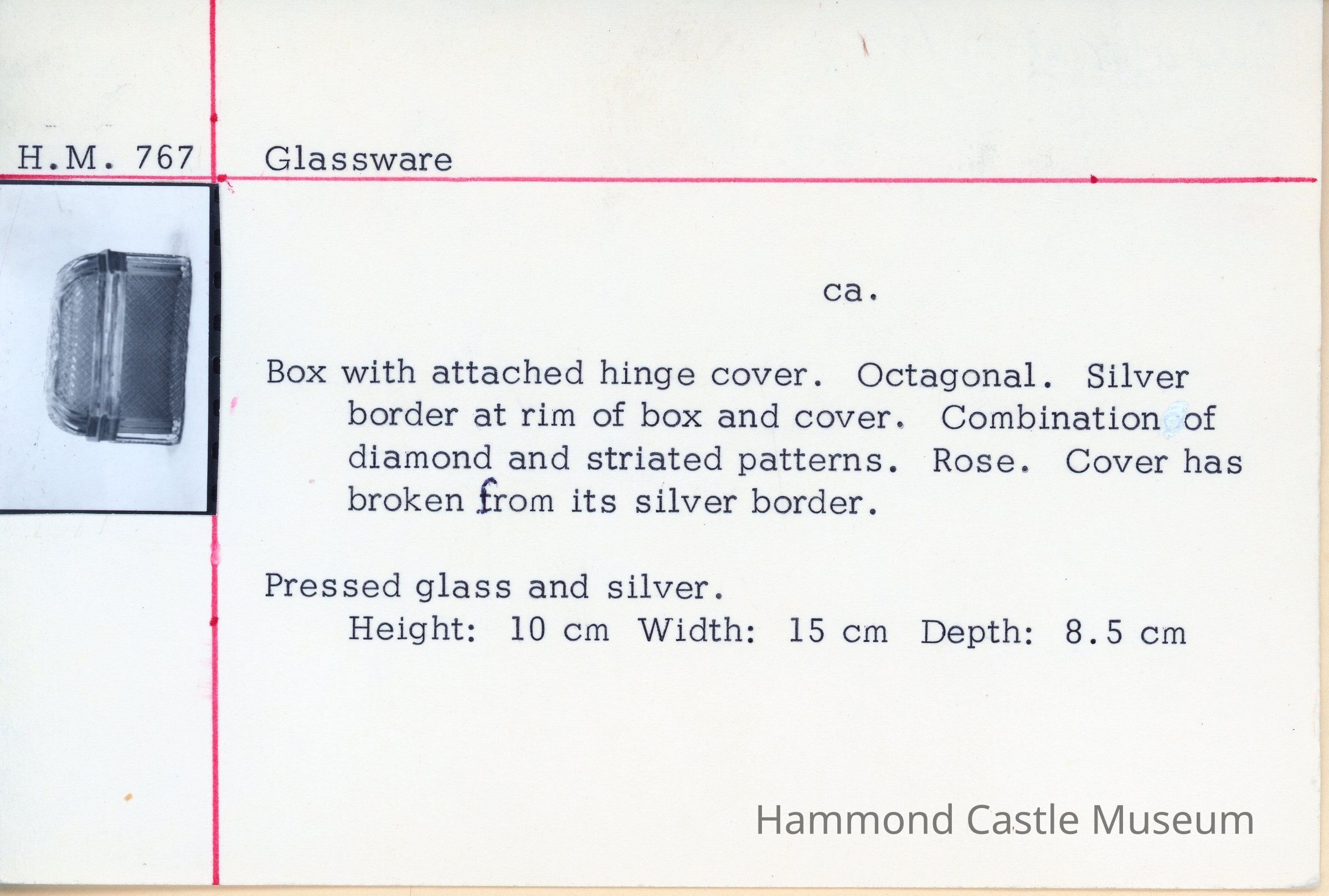 Box with attached hinge cover. Octagonal. Silver border at rim of box and cover. Combination of diamond and striated patterns. Rose. Cover has broken from its silver border. Pressed glass and silver.
