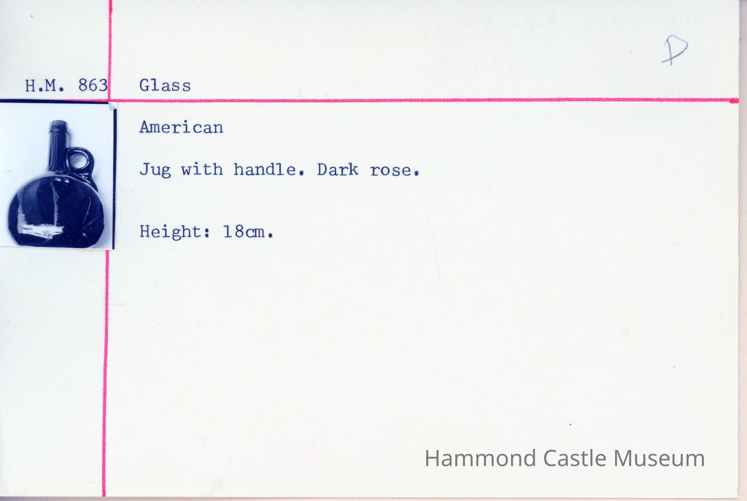rose glass jug w handle DEACCESSIONED 6-28-1991