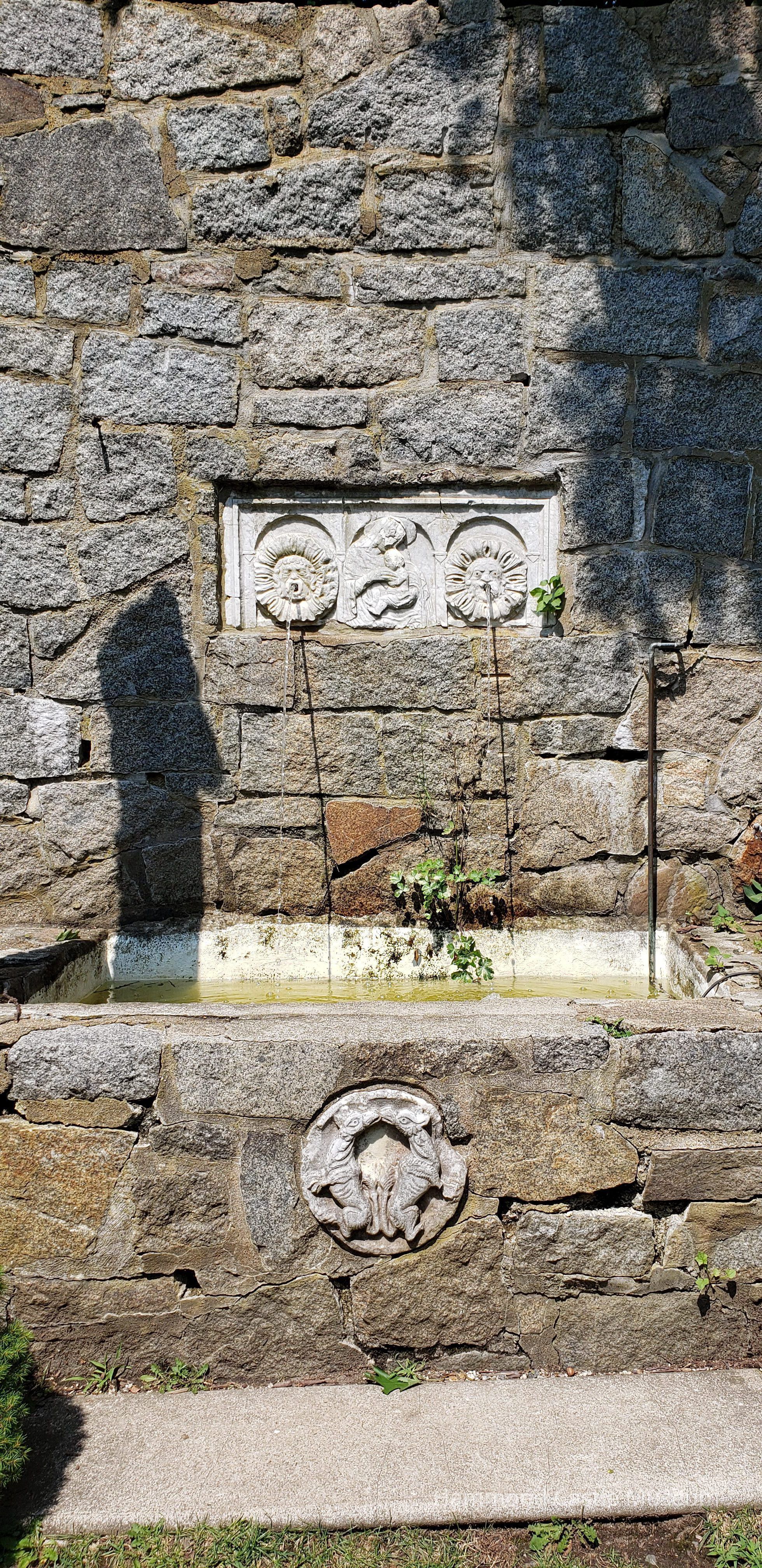 roundel of 2 kissing animals on north side of cat garden on lower part of fountain