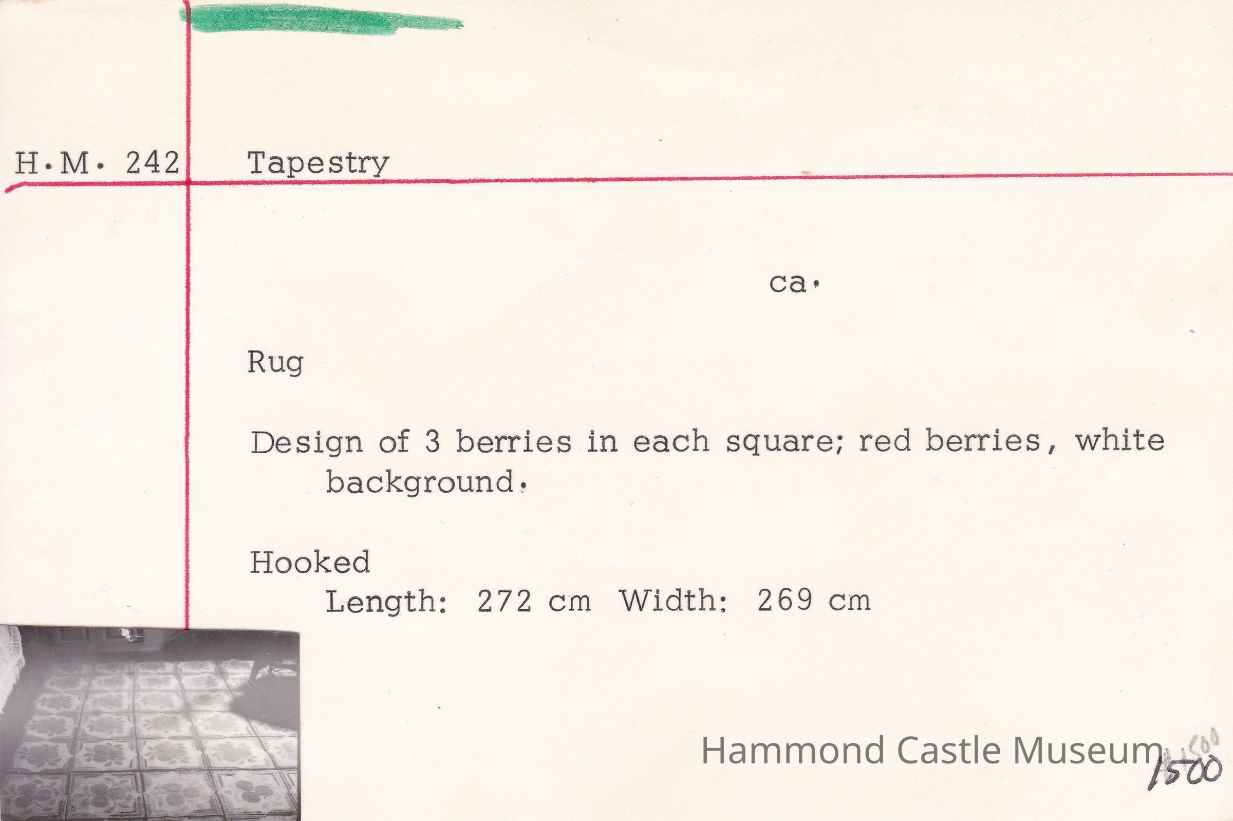 Hooked rug 9' X 9' Design of 3 berries in each square; red berries, white background In Lower Guestroom at Hammond's death in 1965