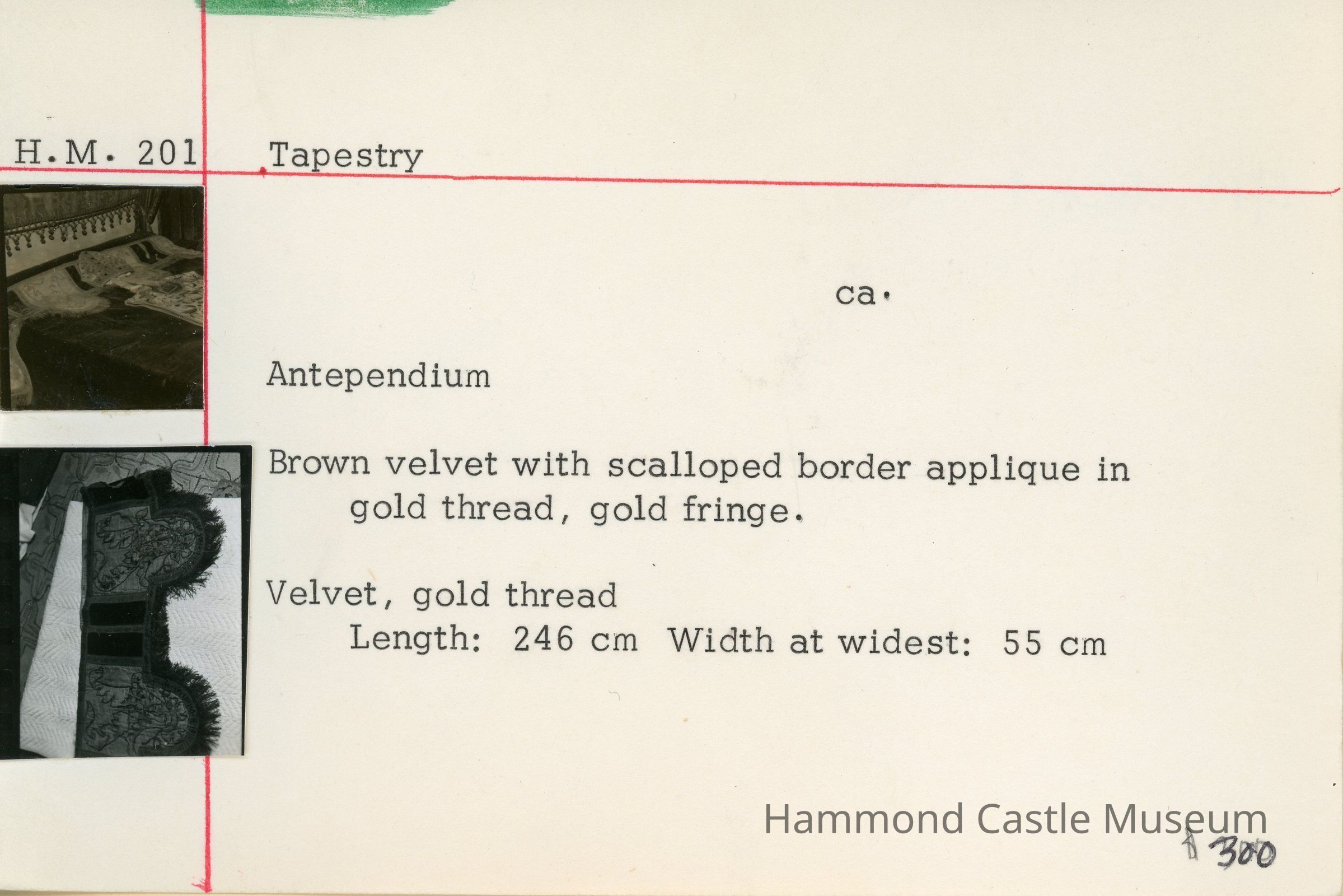 Brown velvet antependium (also known as a parament or hanging) with scalloped border applique in gold thread, gold fringe.
