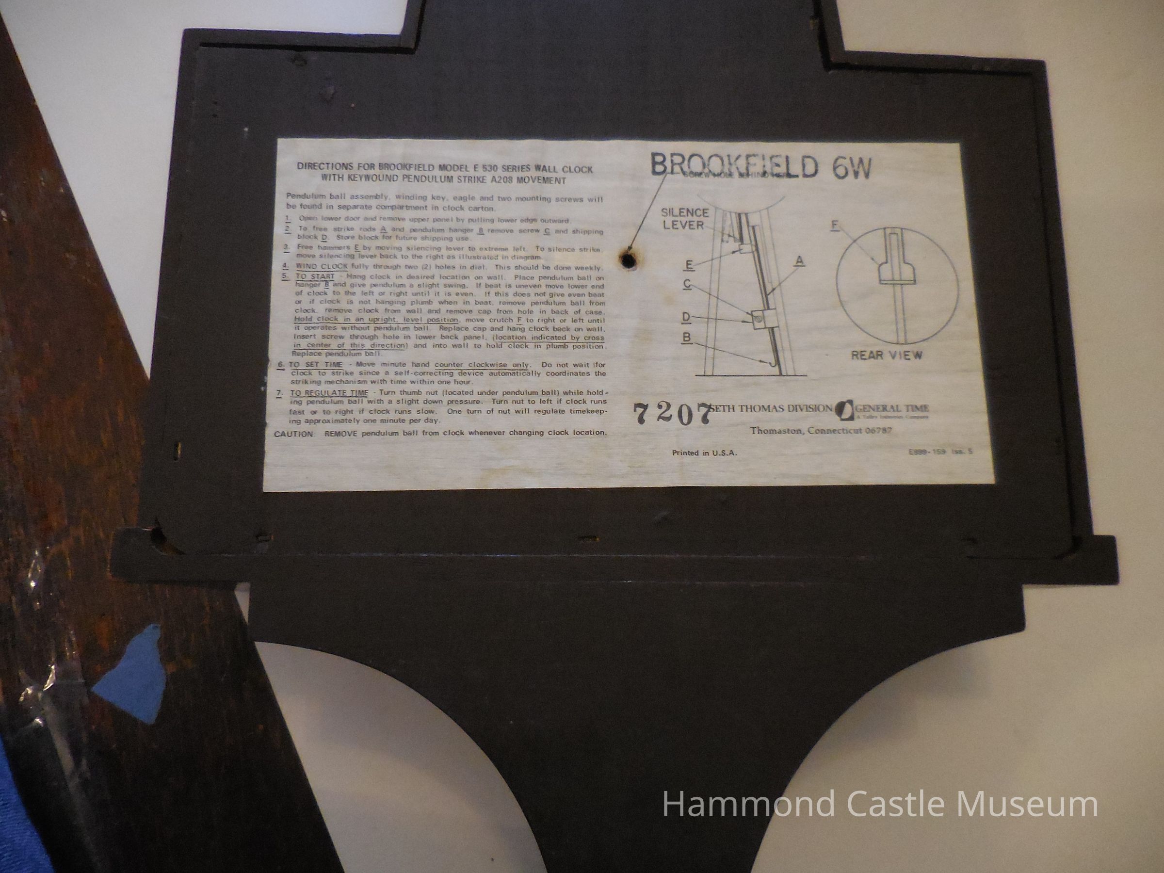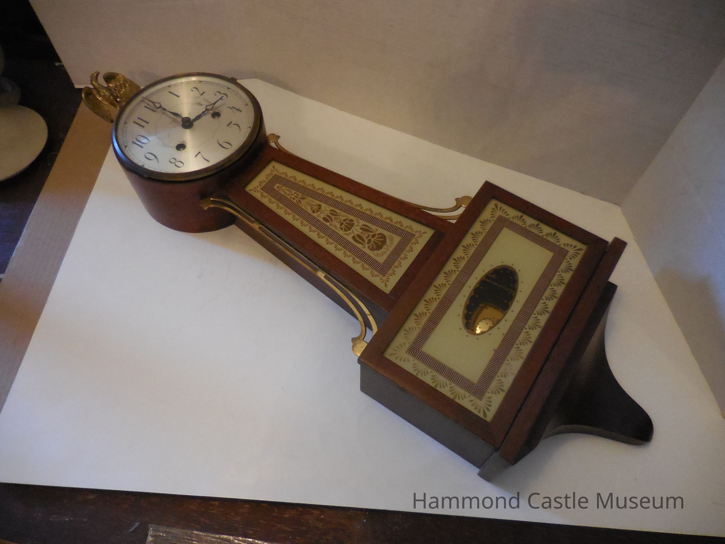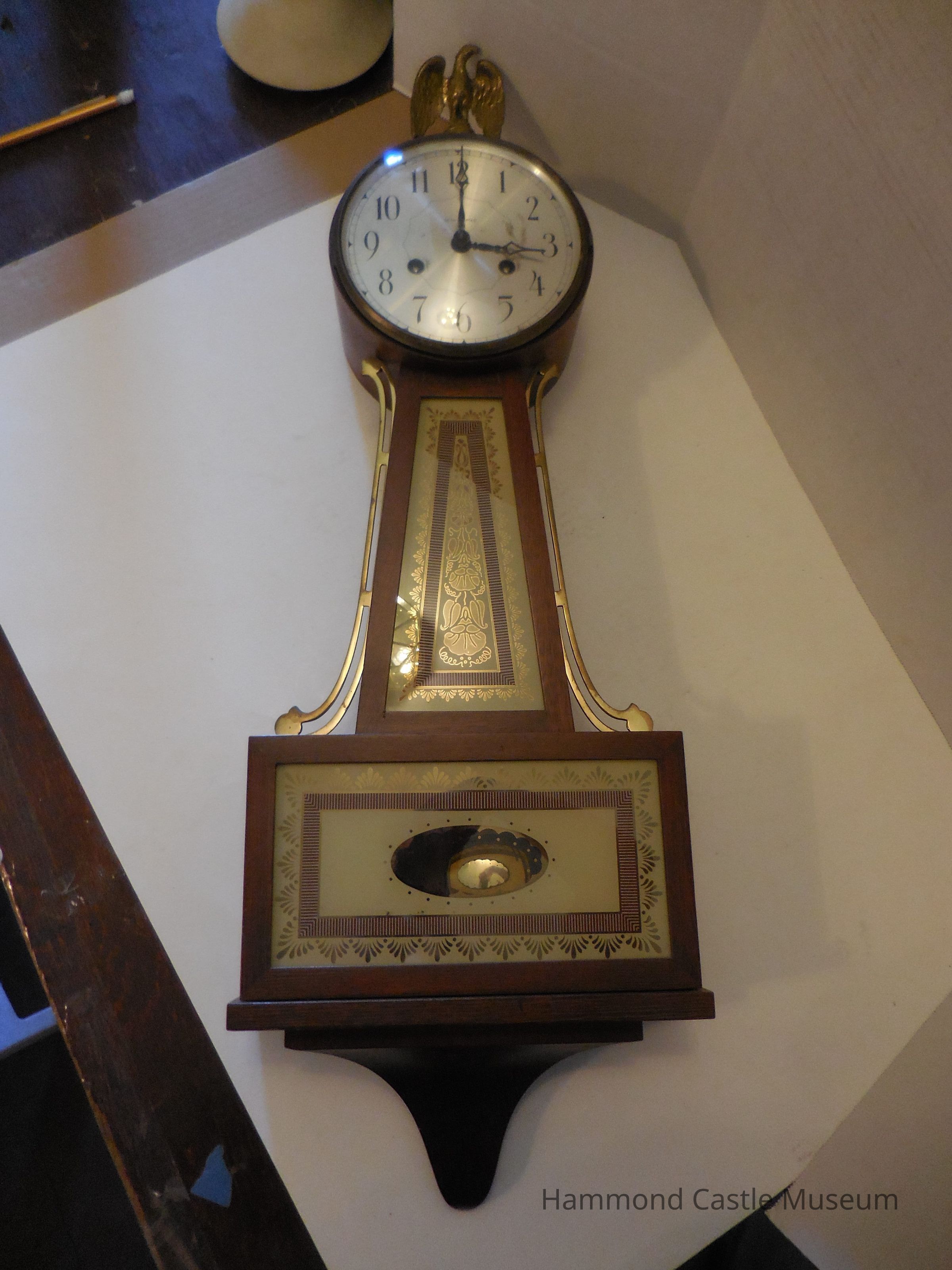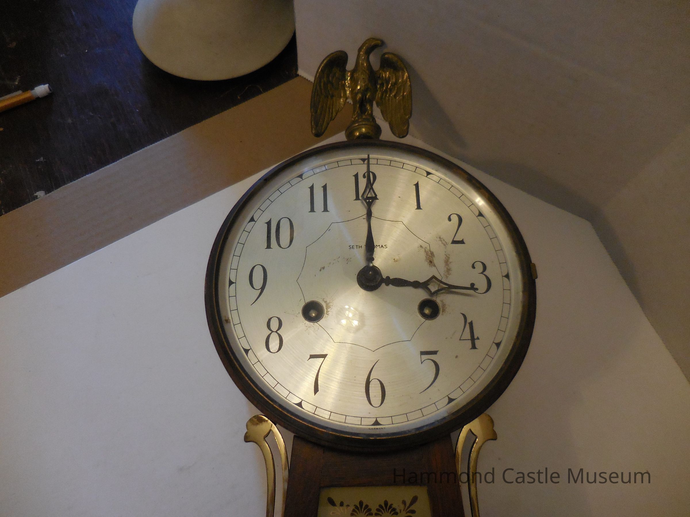 Seth Thomas wall-mounted banjo clock. Thought to be from the 1940s. Brookfield 6W E530 series. Mahogany case, eagle ornament, side trim.