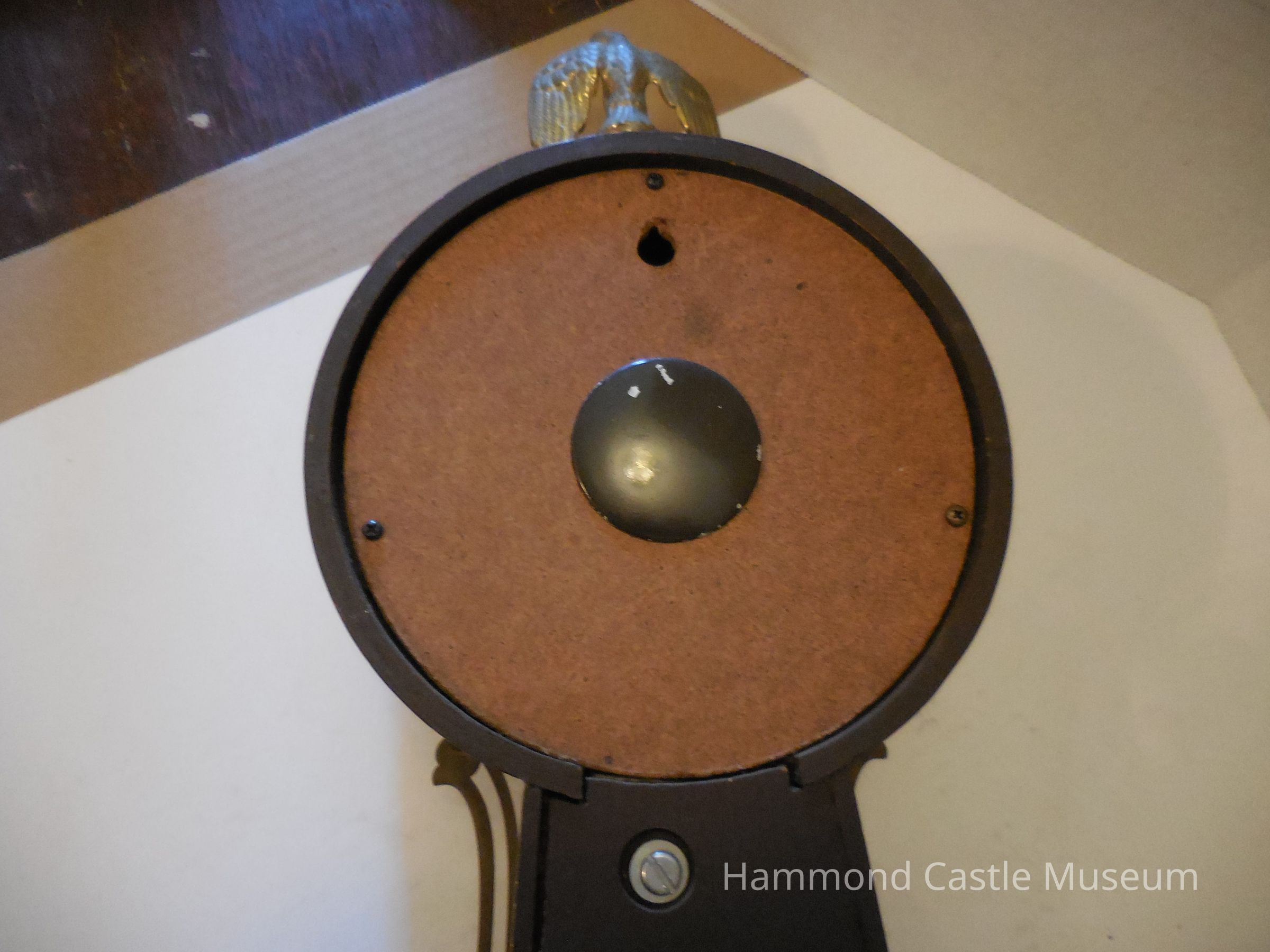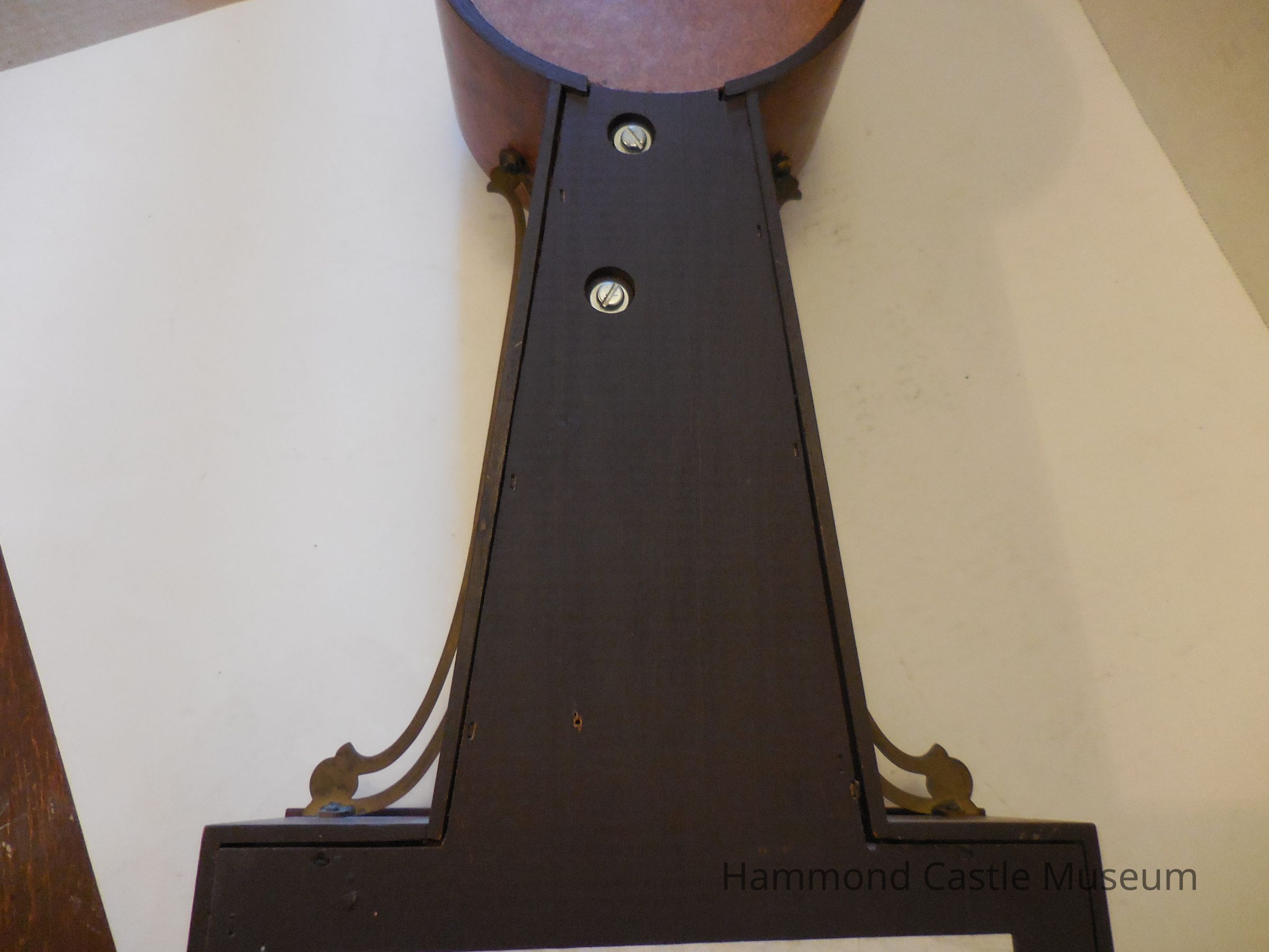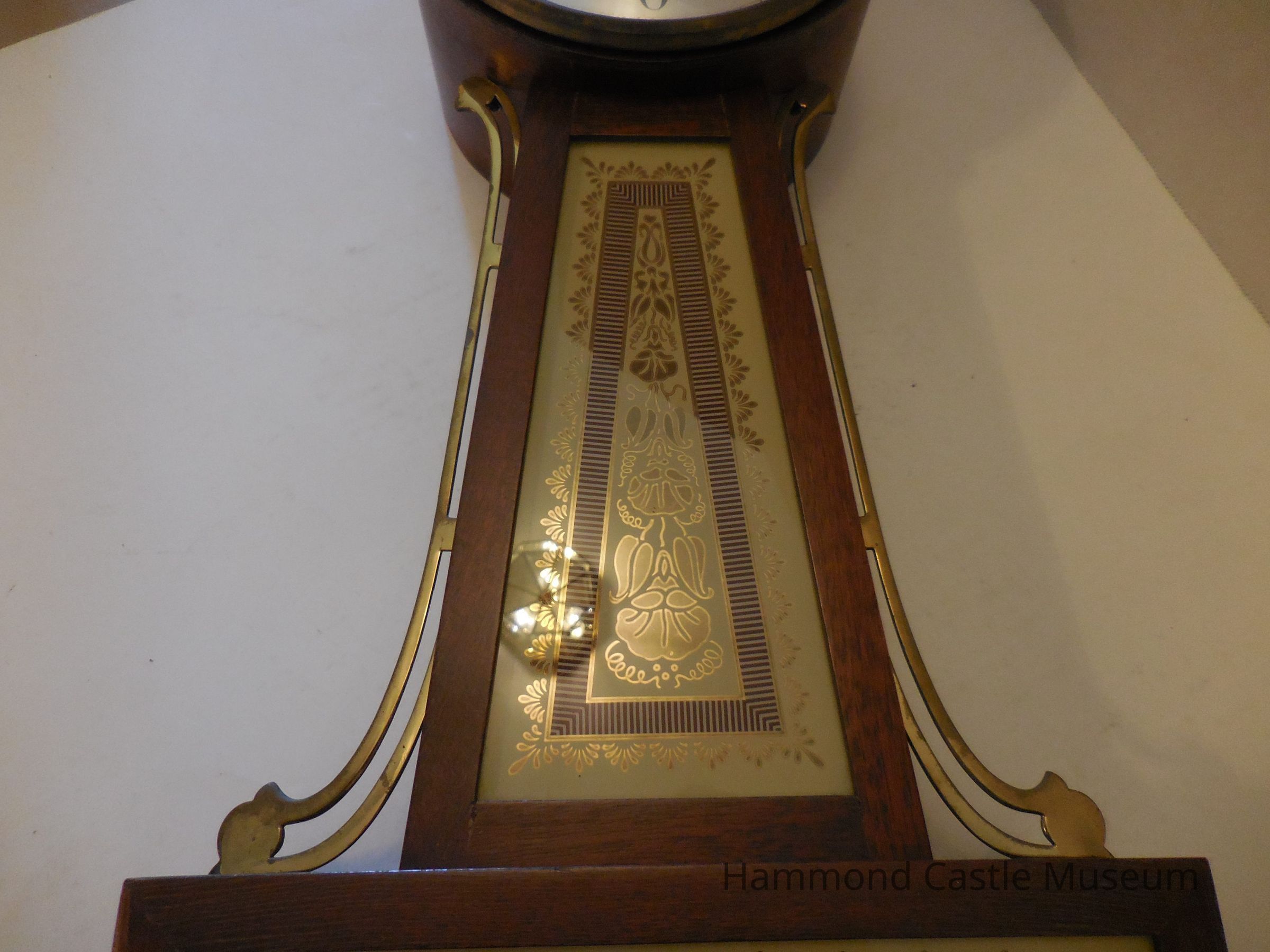 Seth Thomas wall-mounted banjo clock. Thought to be from the 1940s. Brookfield 6W E530 series. Mahogany case, eagle ornament, side trim.