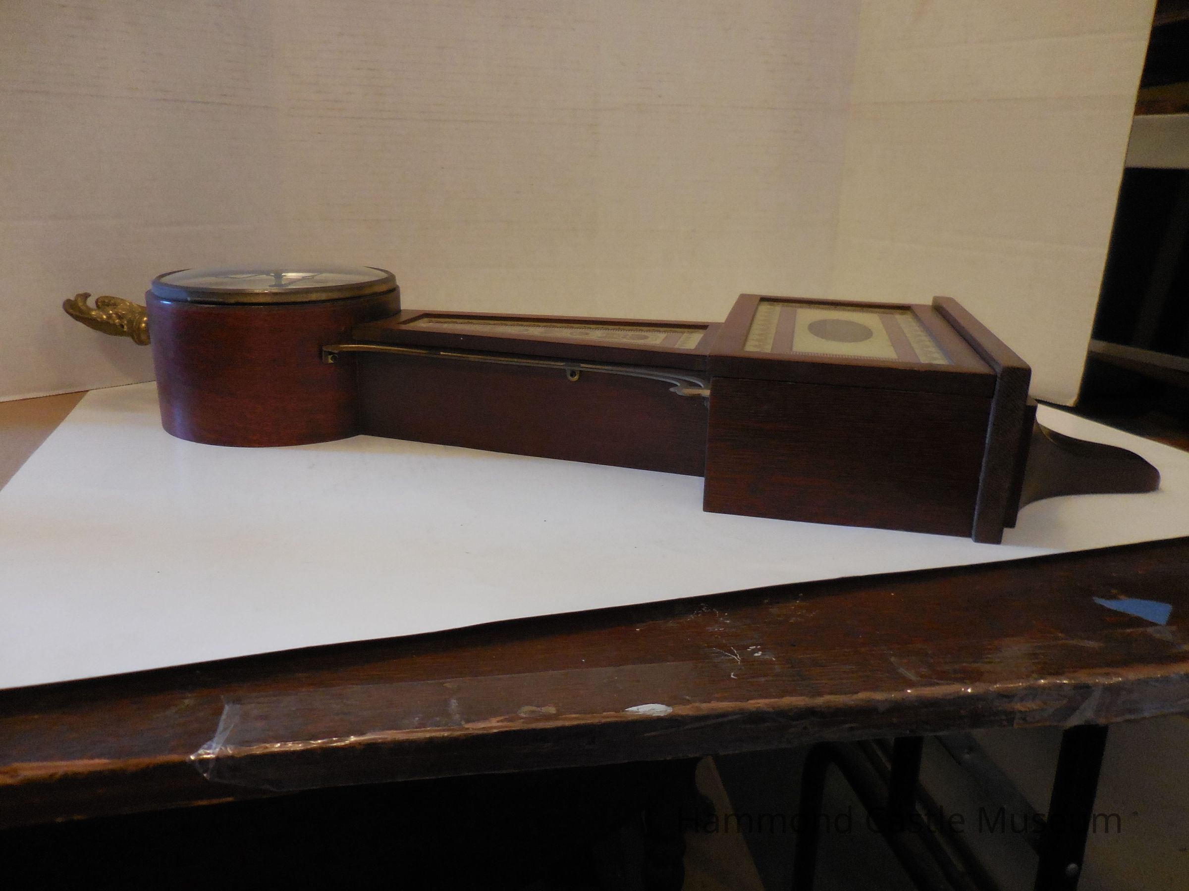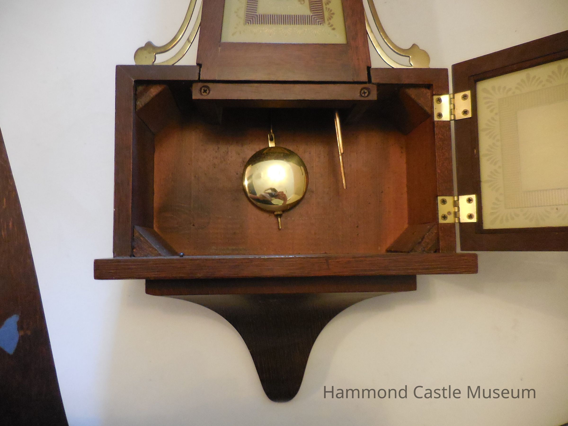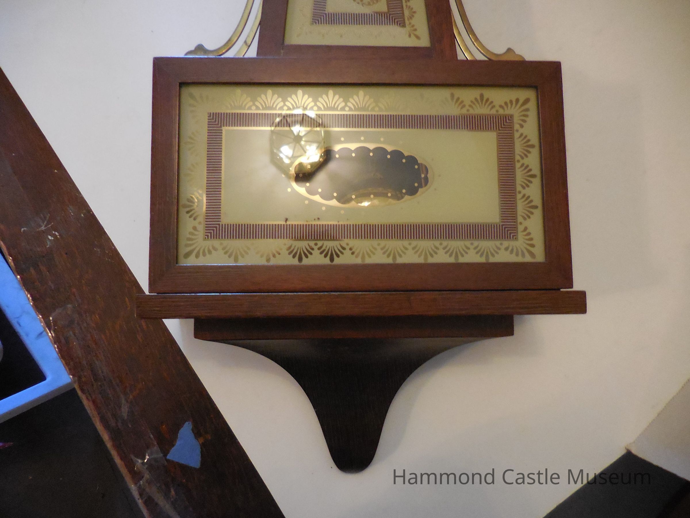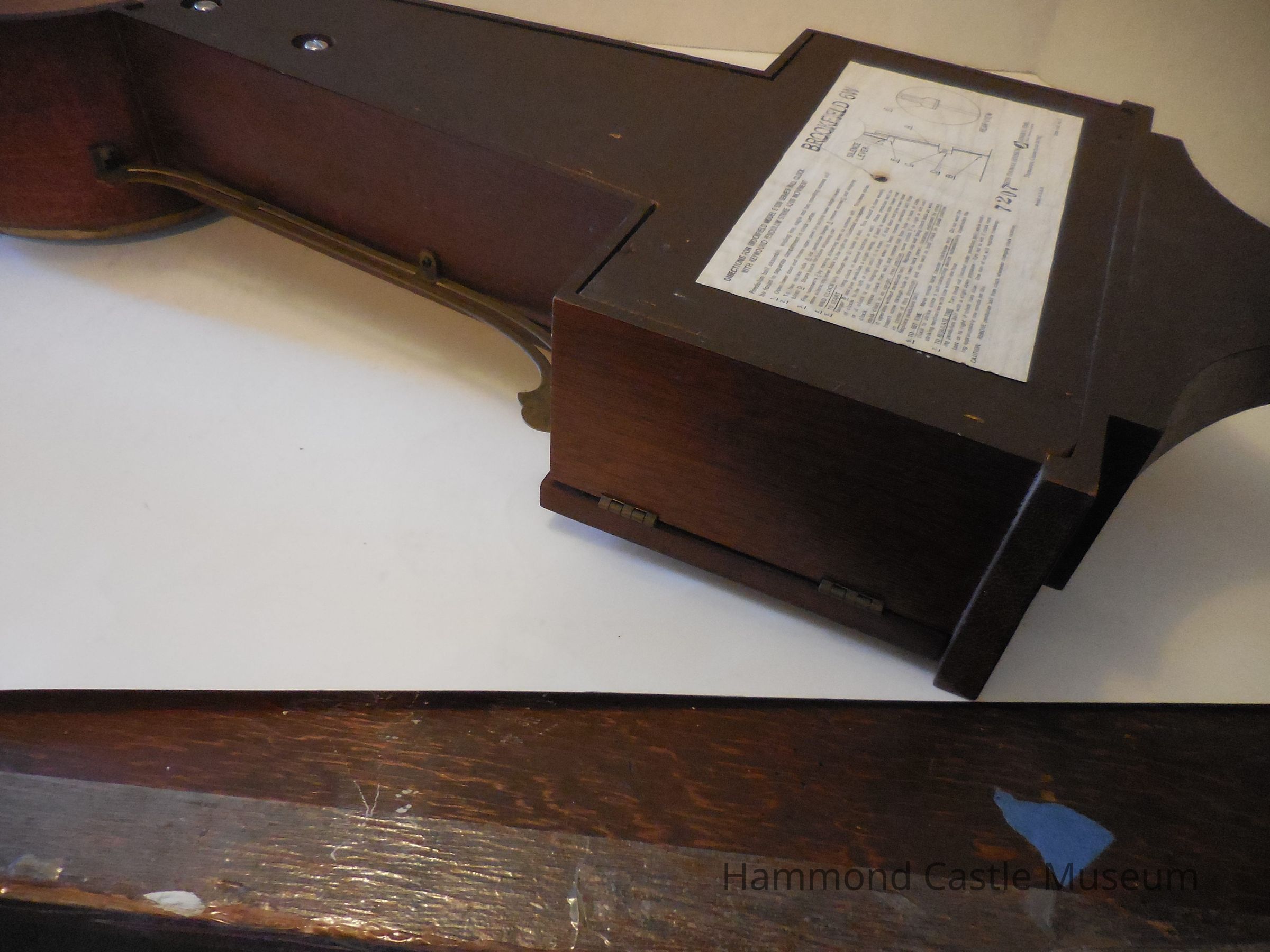 Seth Thomas wall-mounted banjo clock. Thought to be from the 1940s. Brookfield 6W E530 series. Mahogany case, eagle ornament, side trim.