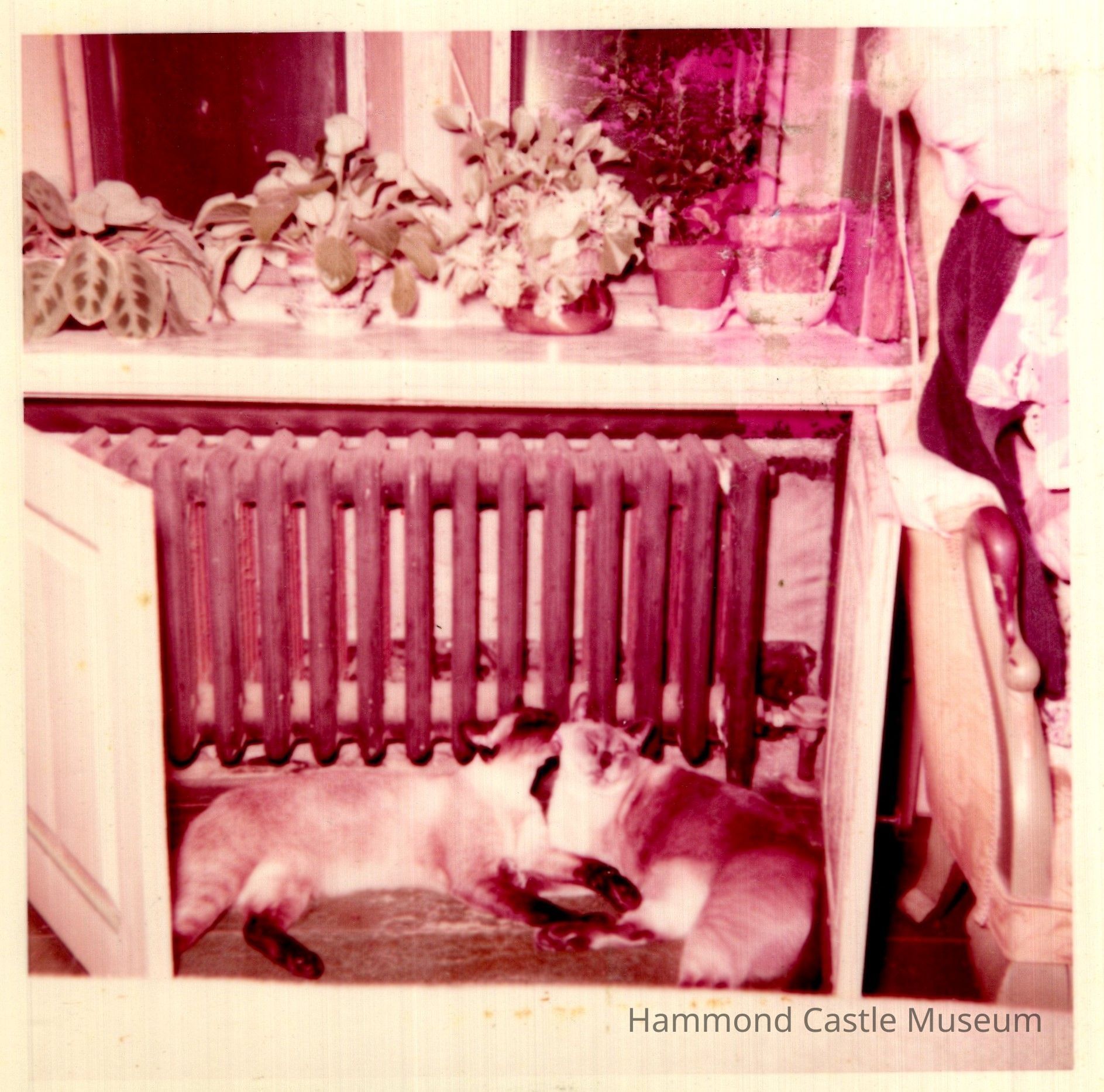 Photo of Siamese cats with older Irene in front of radiator in her bedroom