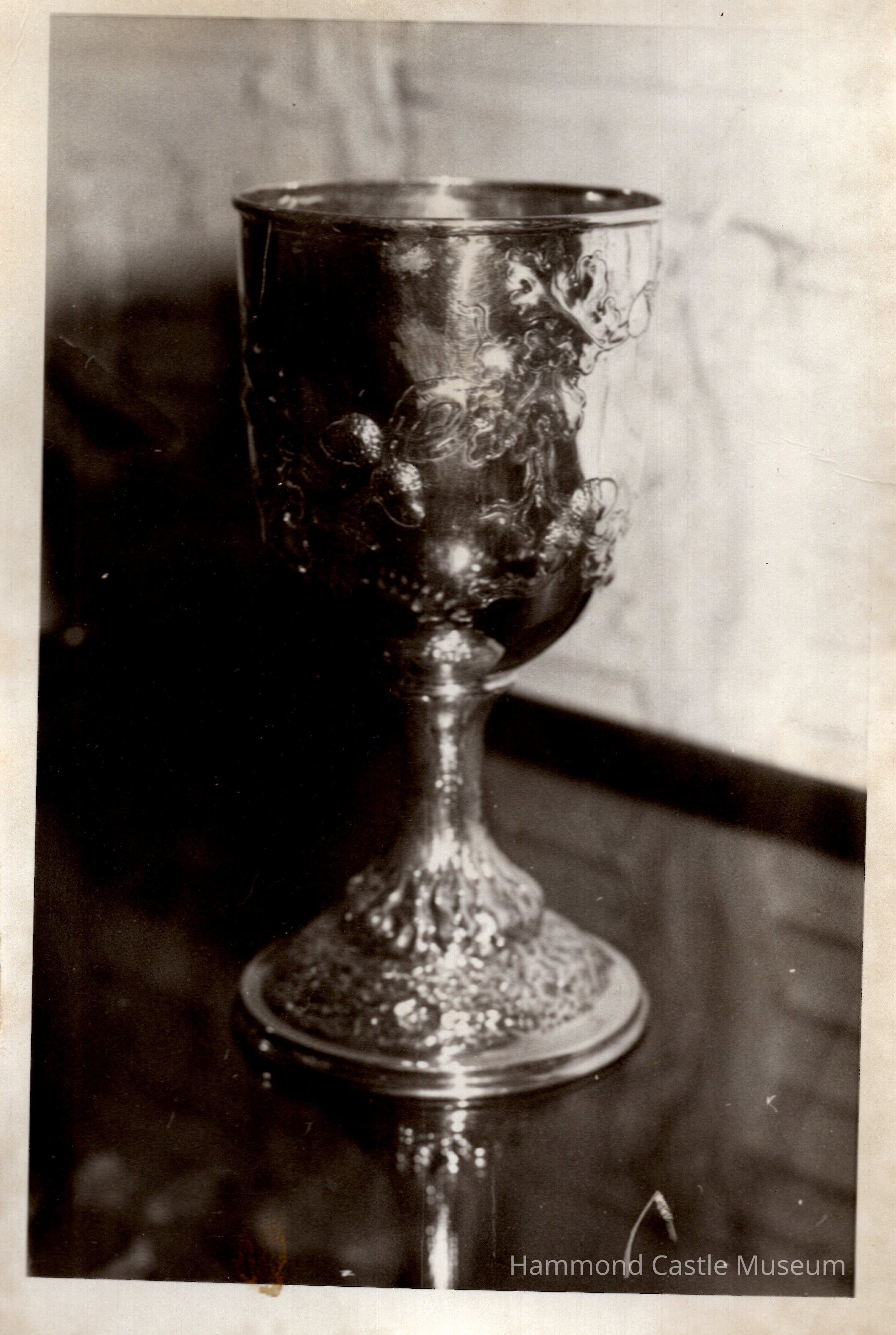 Chalice; leaf and acorn decoration on cup; hammered base and stem; stem of chalice intended to resemble trunk of tree with bark-like hammer marks; root design on lower stem near base. "18978" scratched on inner base.