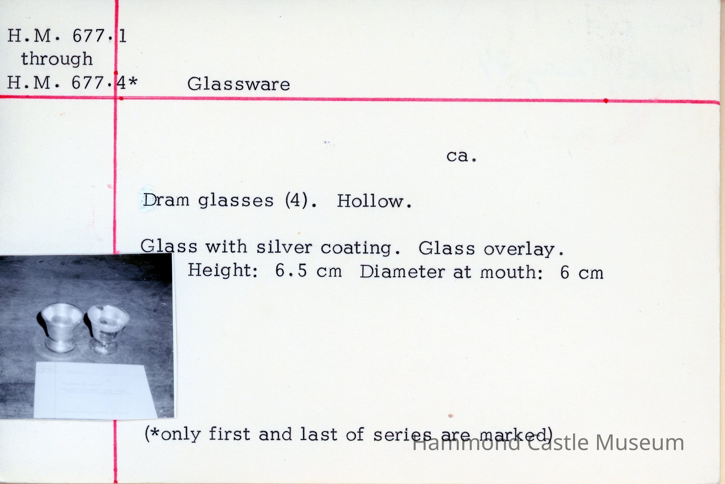 Set of 4 dram glasses. Hollow. Glass with silver coating. Glass overlay. Only first and last of series are marked. Possibly Mercury Glass. Use caution!