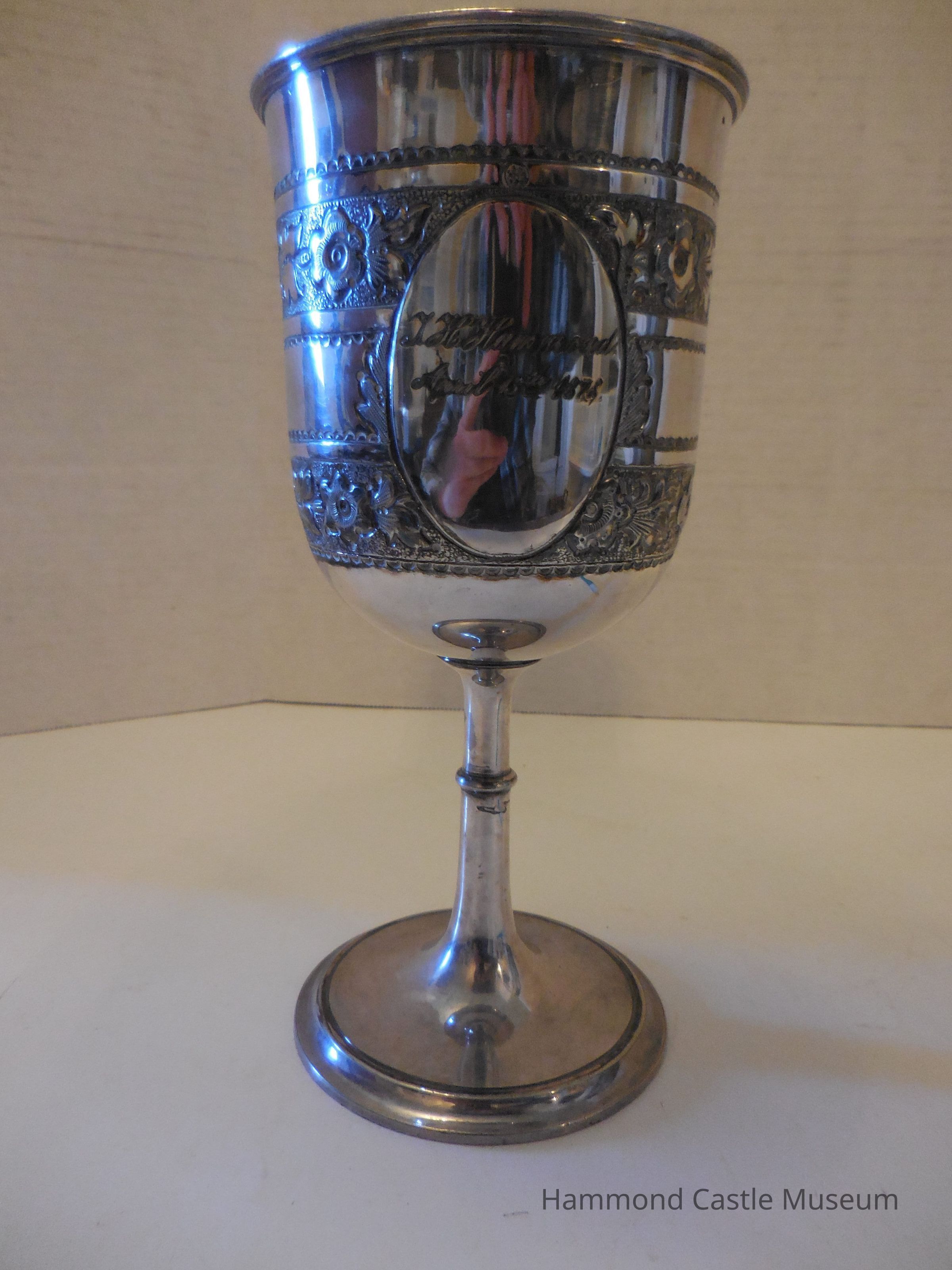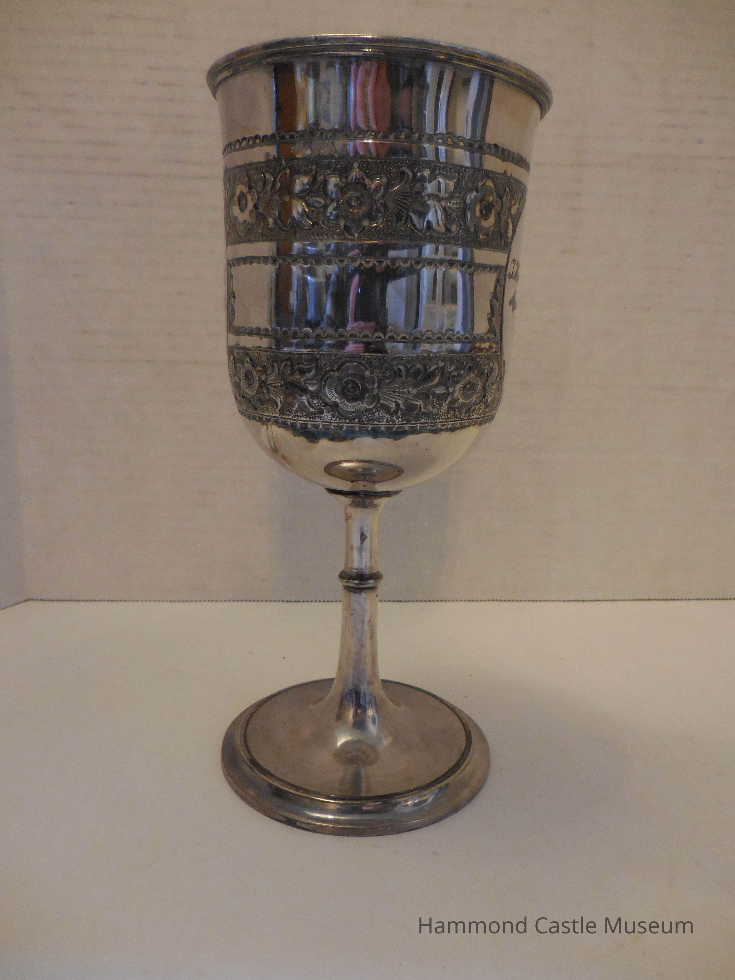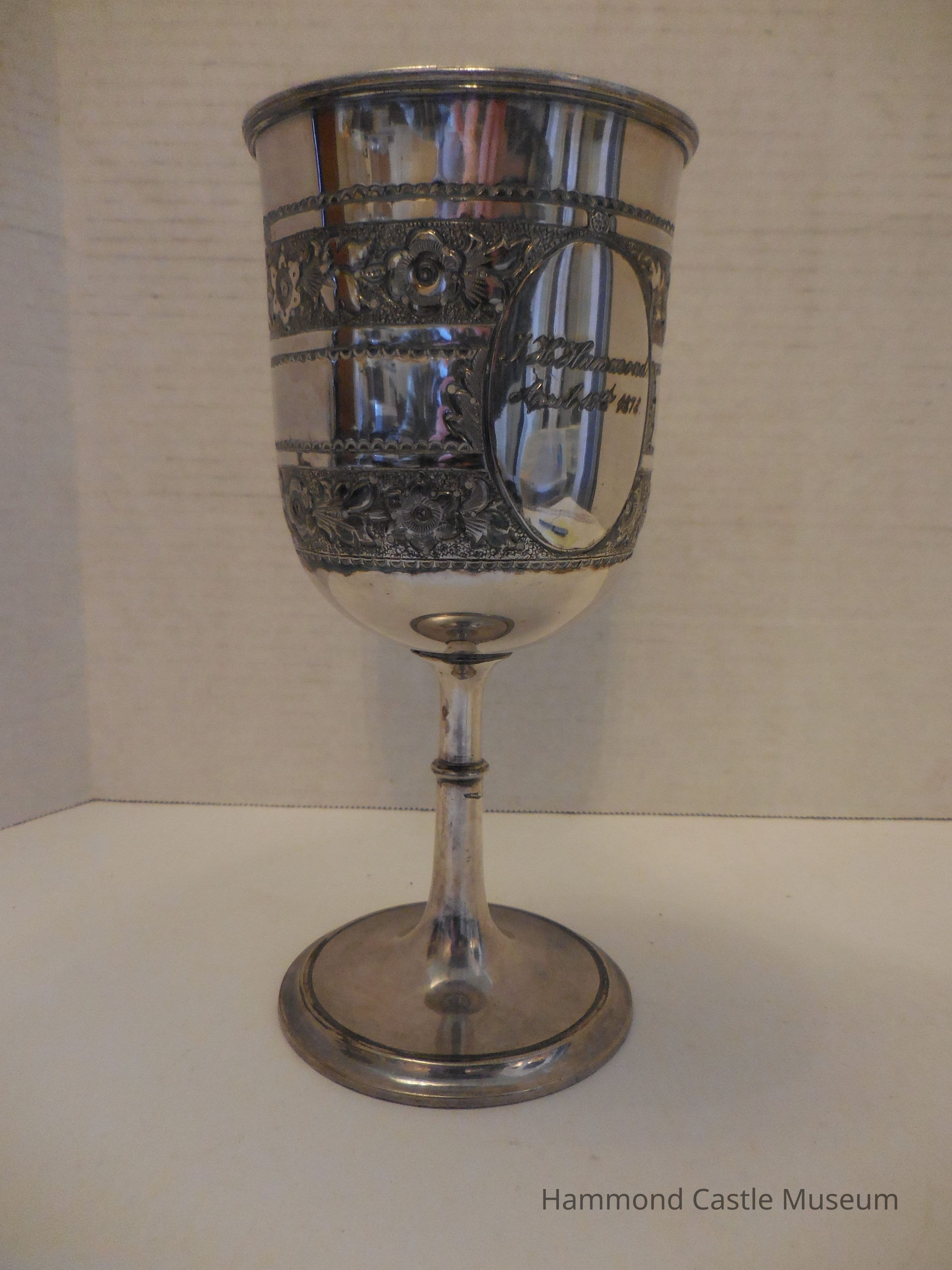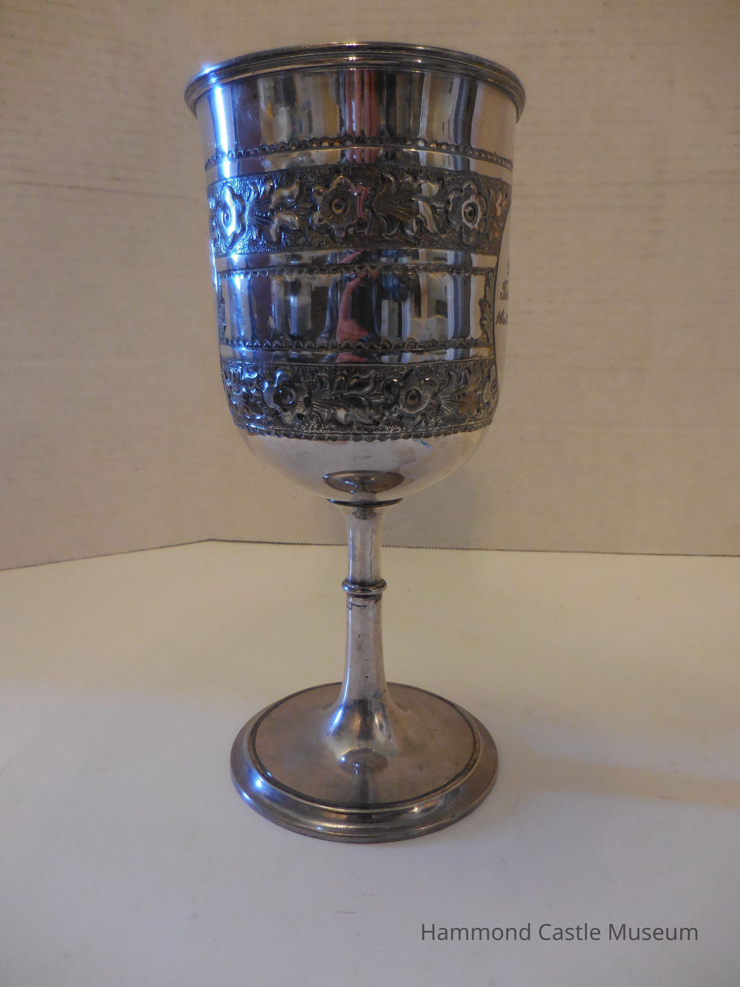 Inscriptions are surrounded by ovals. Floral etchings around the cup.