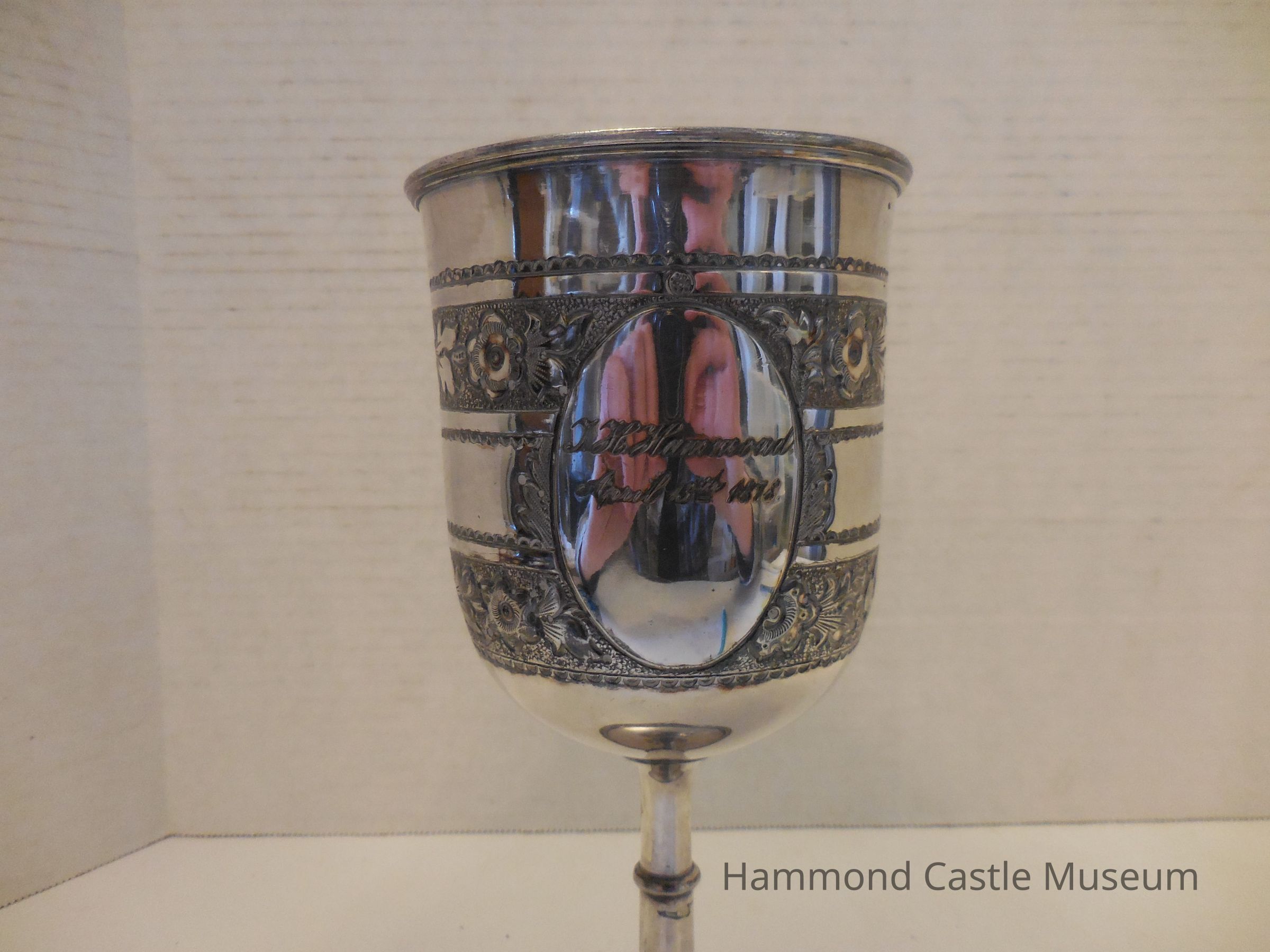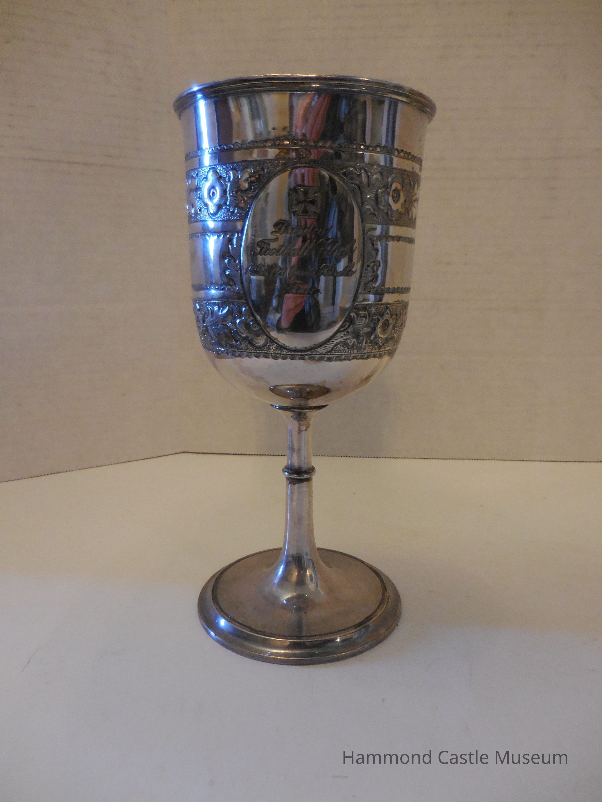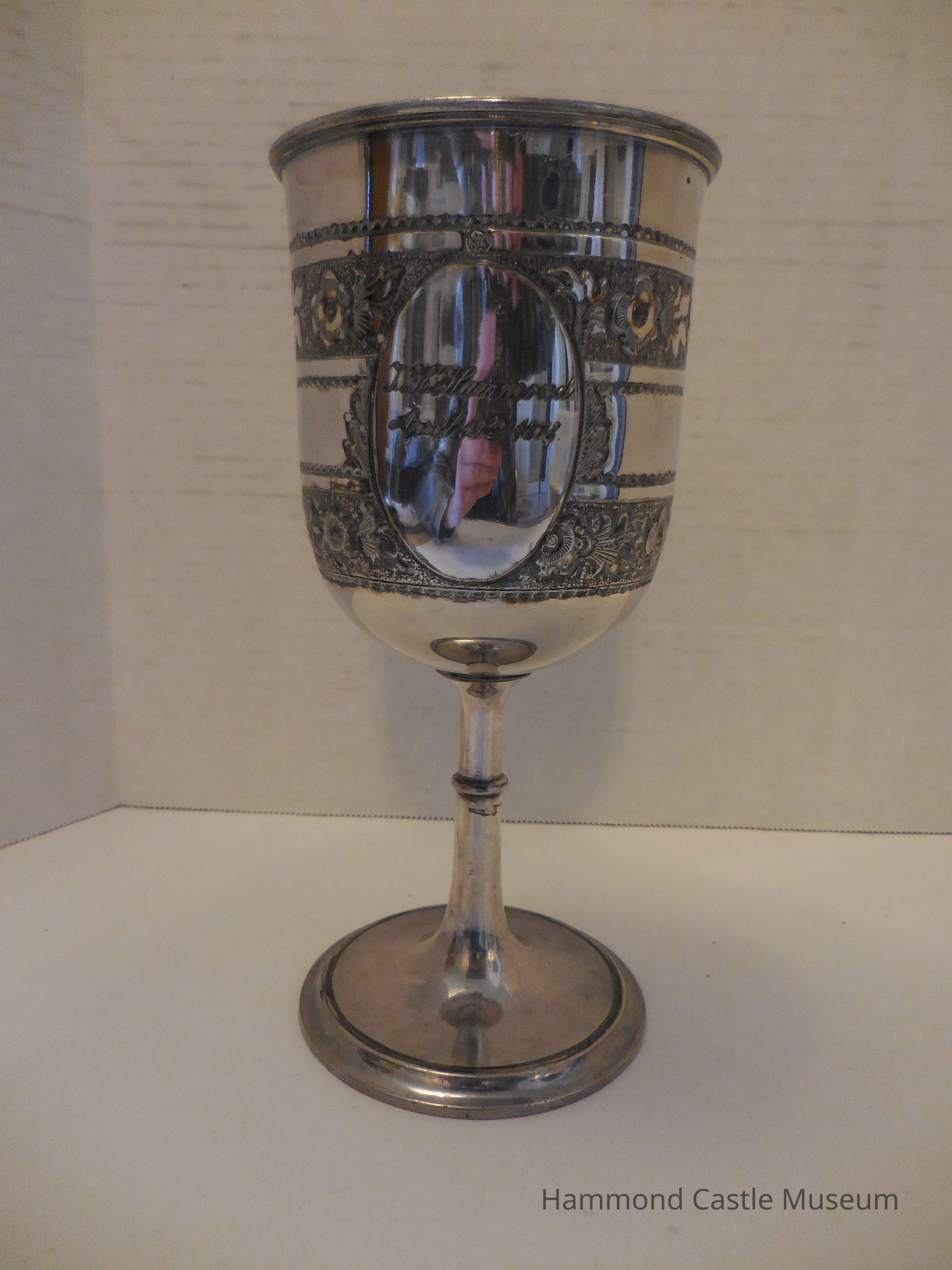 Inscriptions are surrounded by ovals. Floral etchings around the cup.