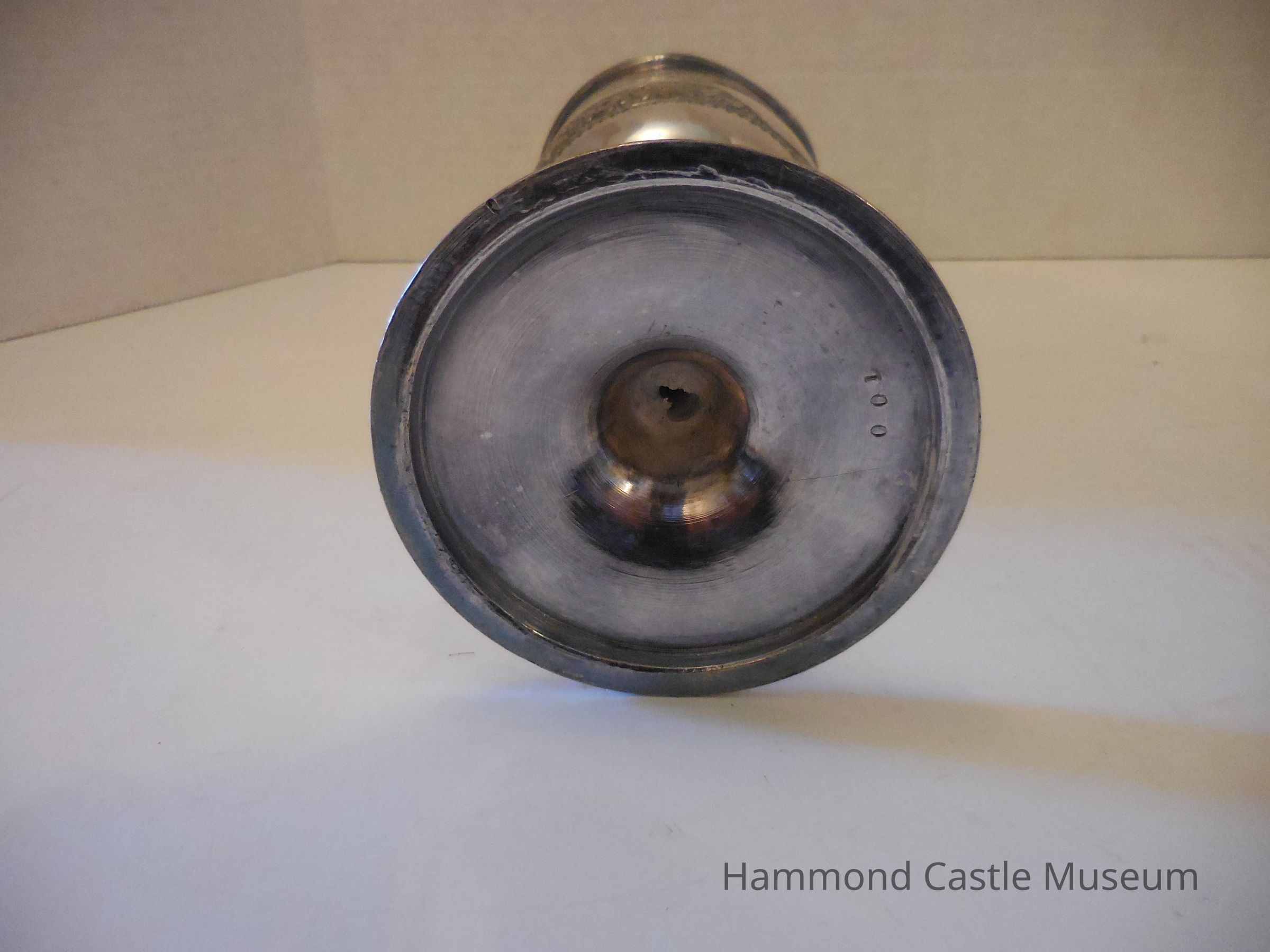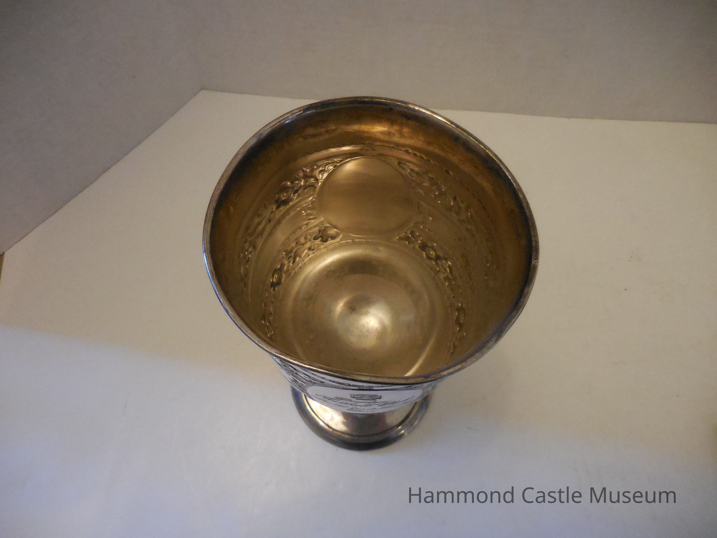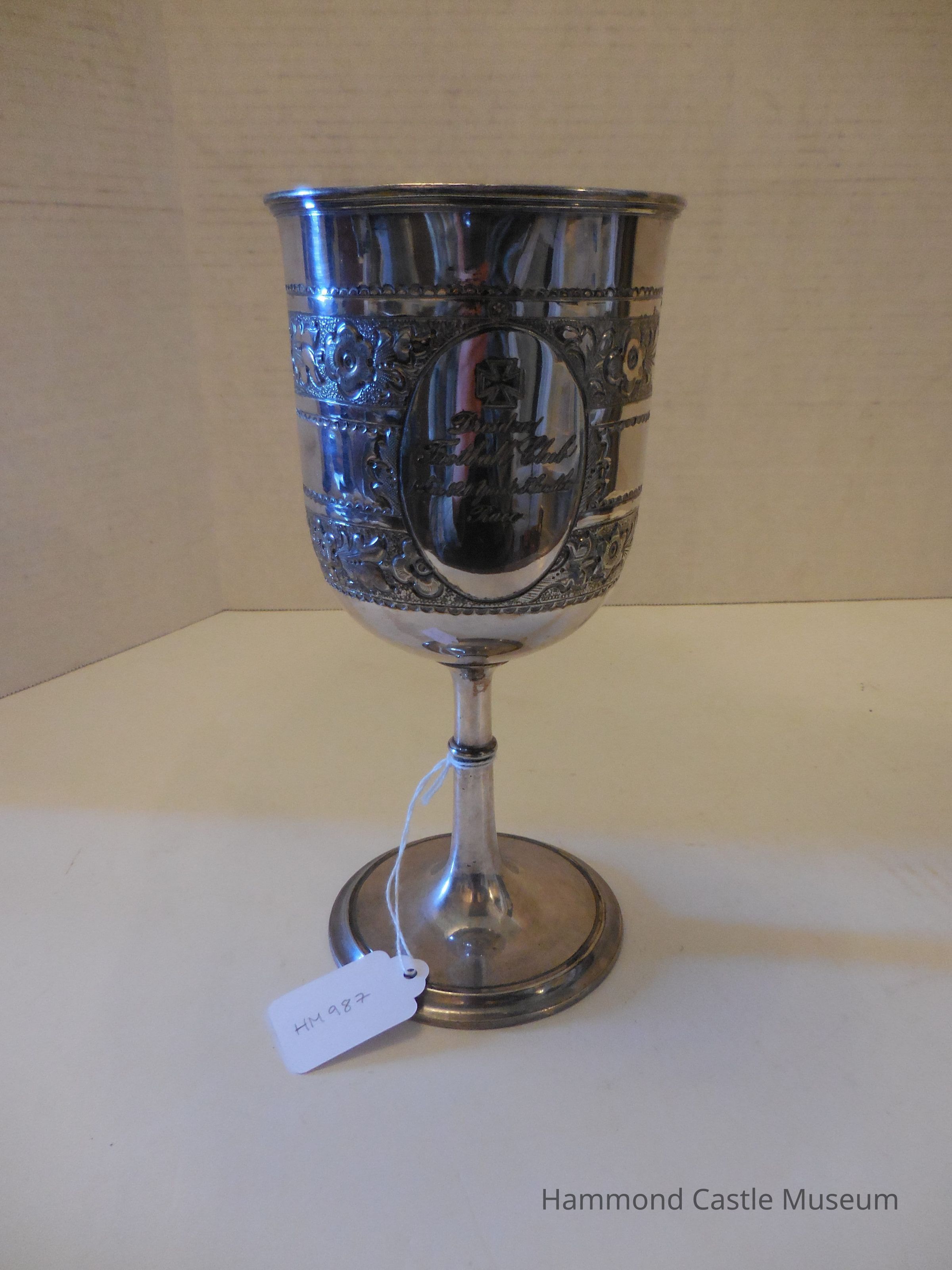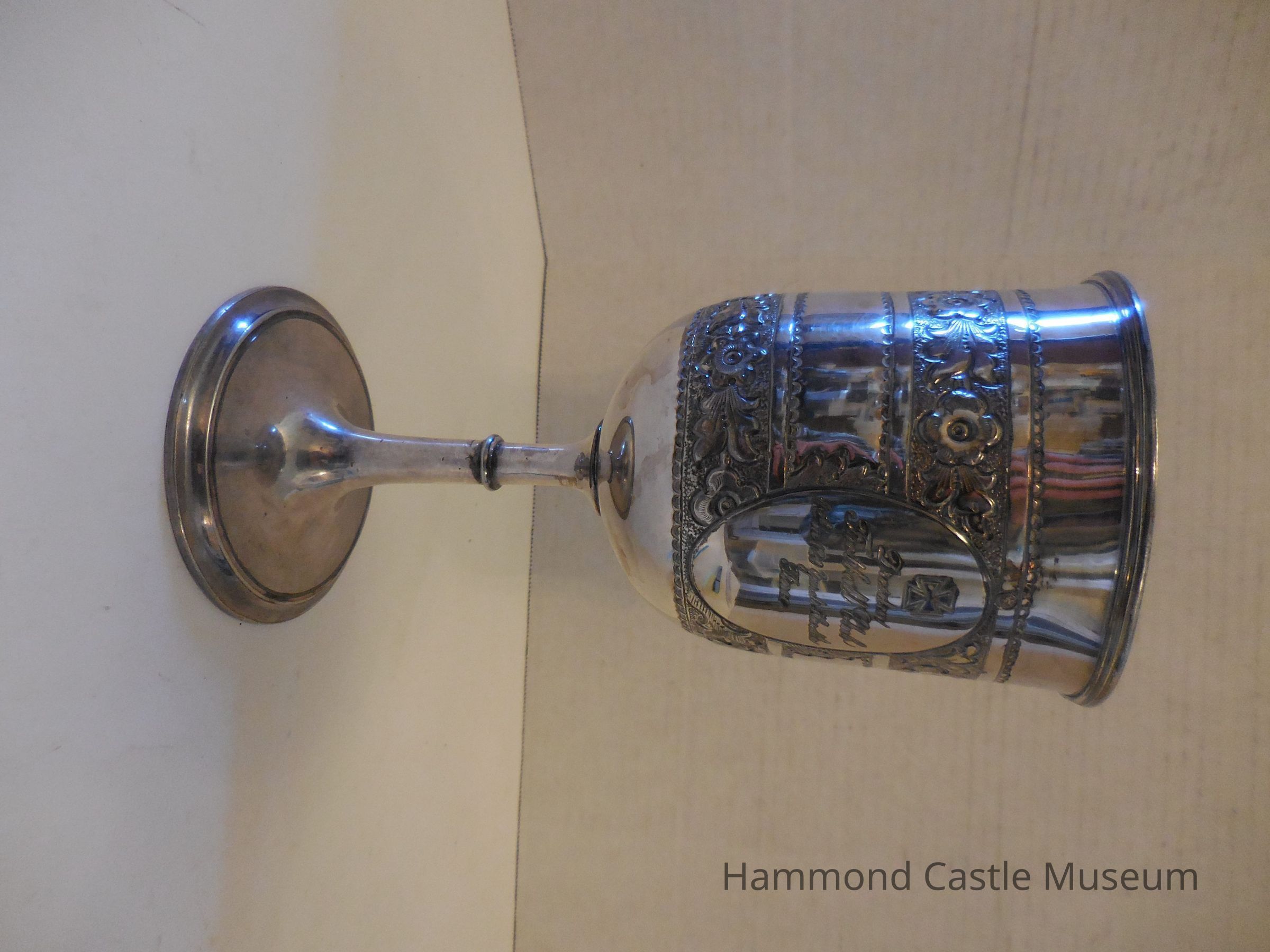 Inscriptions are surrounded by ovals. Floral etchings around the cup.