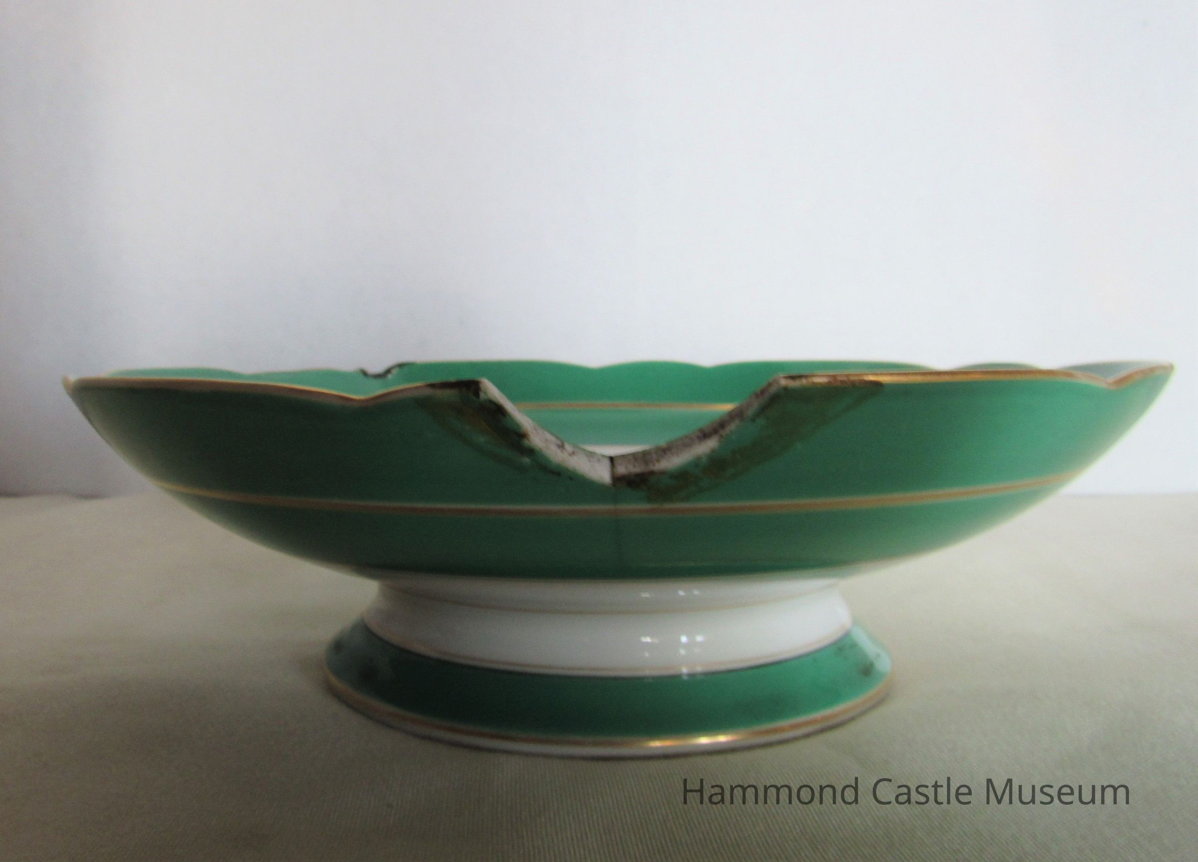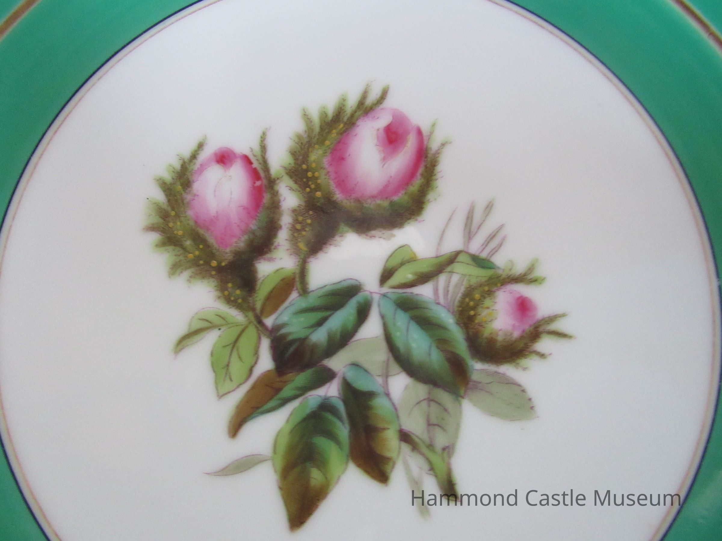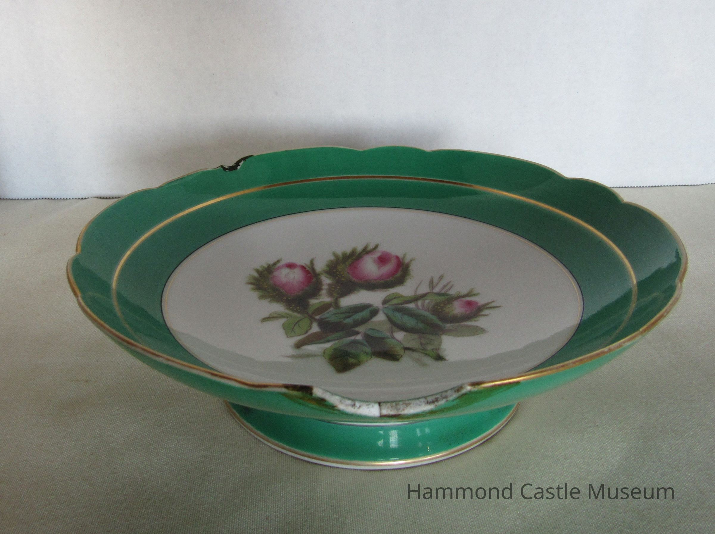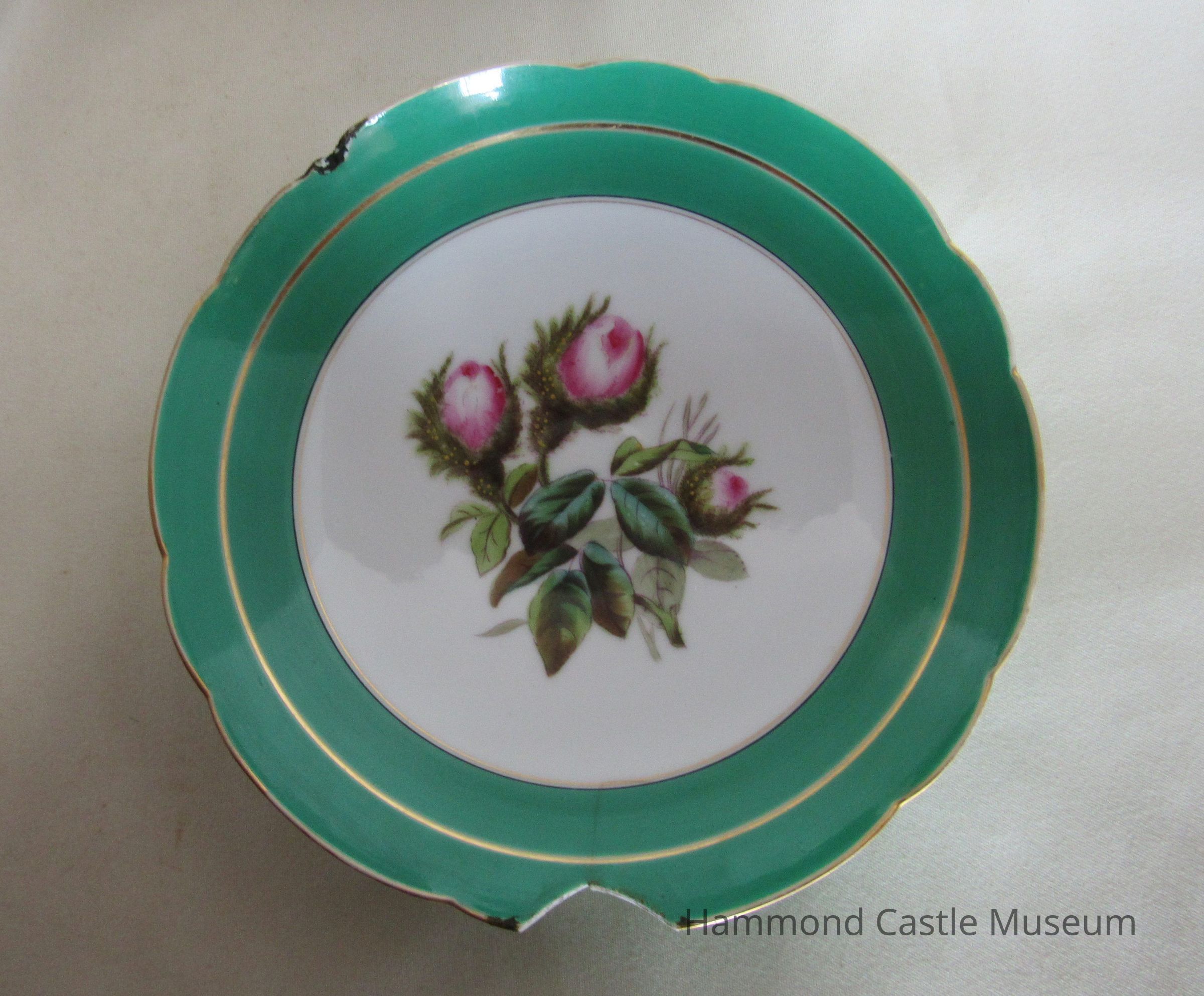 Soup bowl. Slight scallop at green/gold border. Three pink flowers at center of each bowl. Repair work done on two plates.