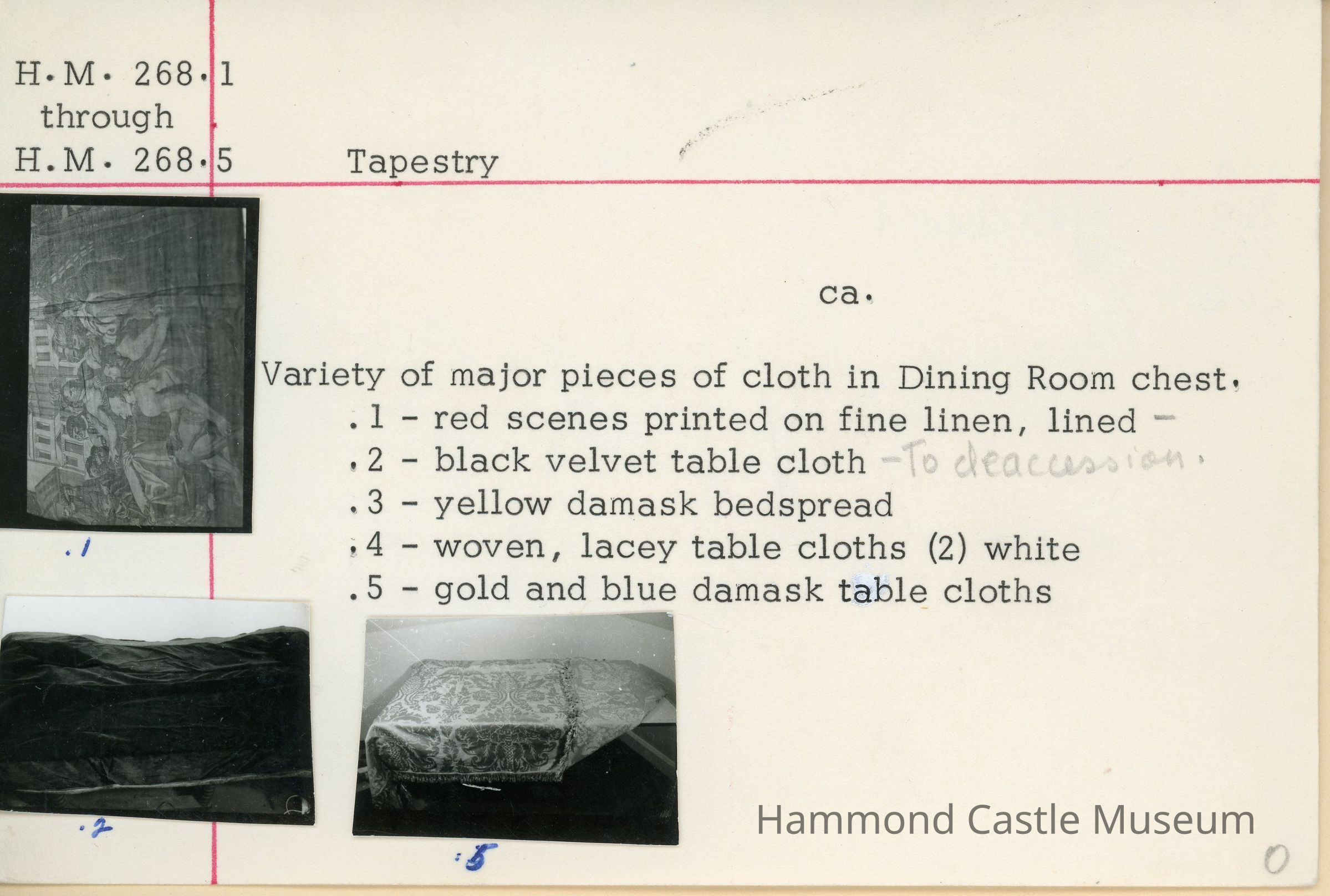 Variety of major pieces of cloth 5) Gold and blue damask table cloths