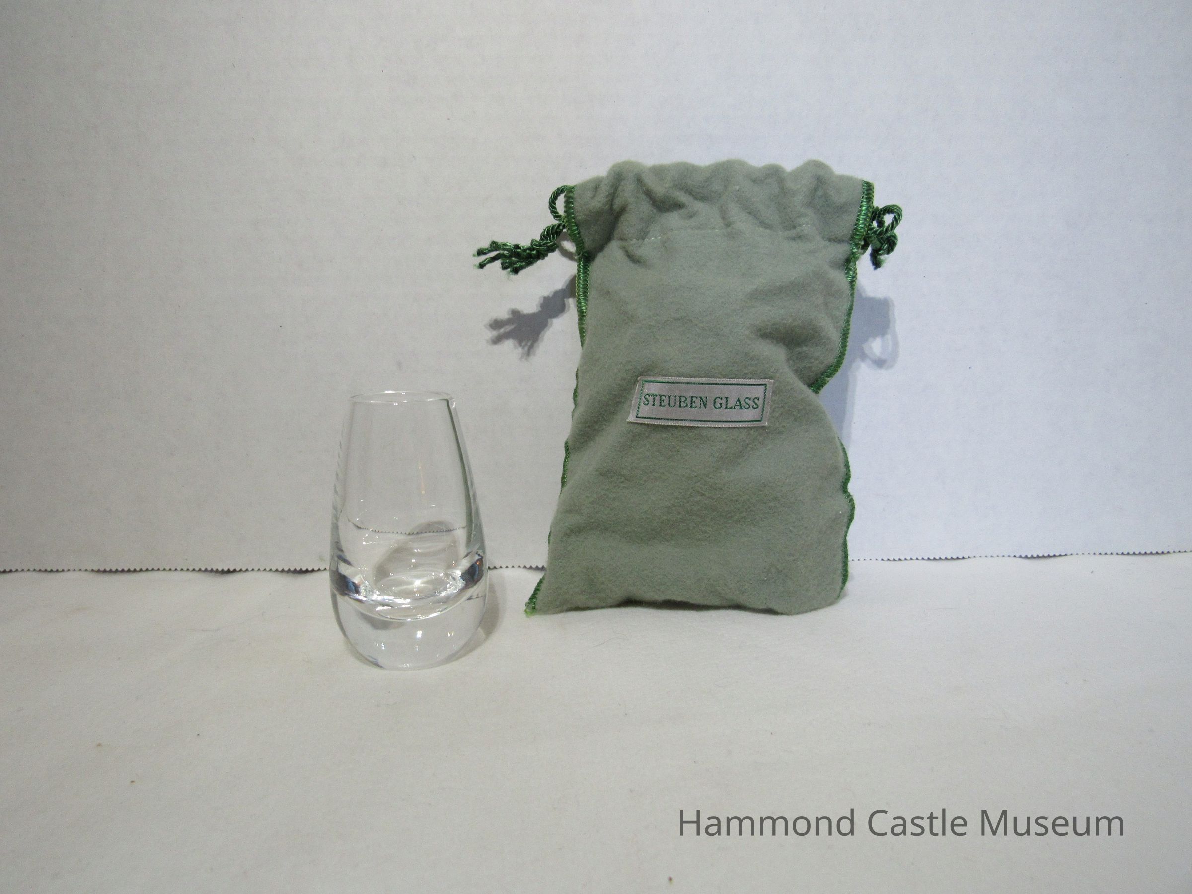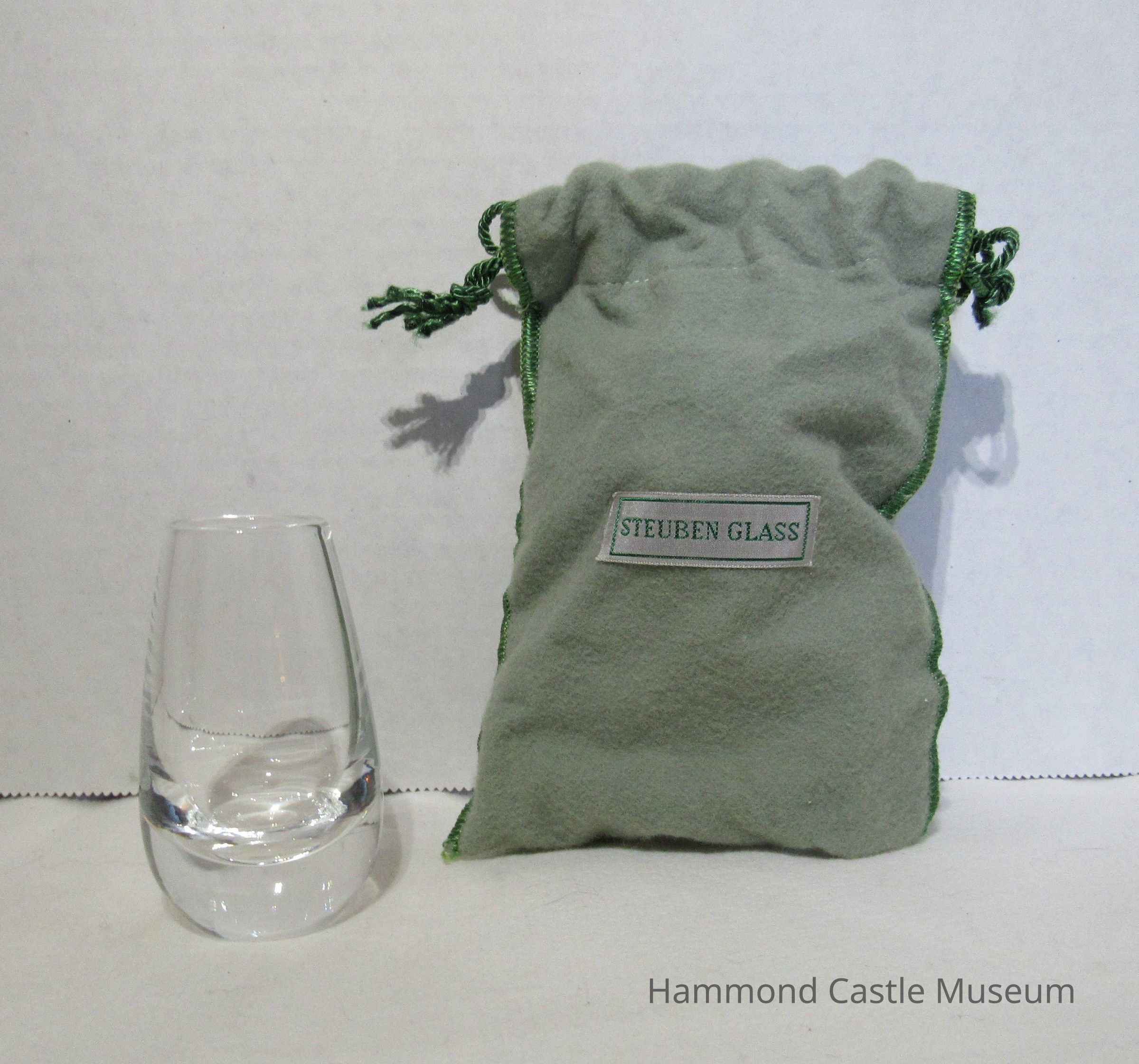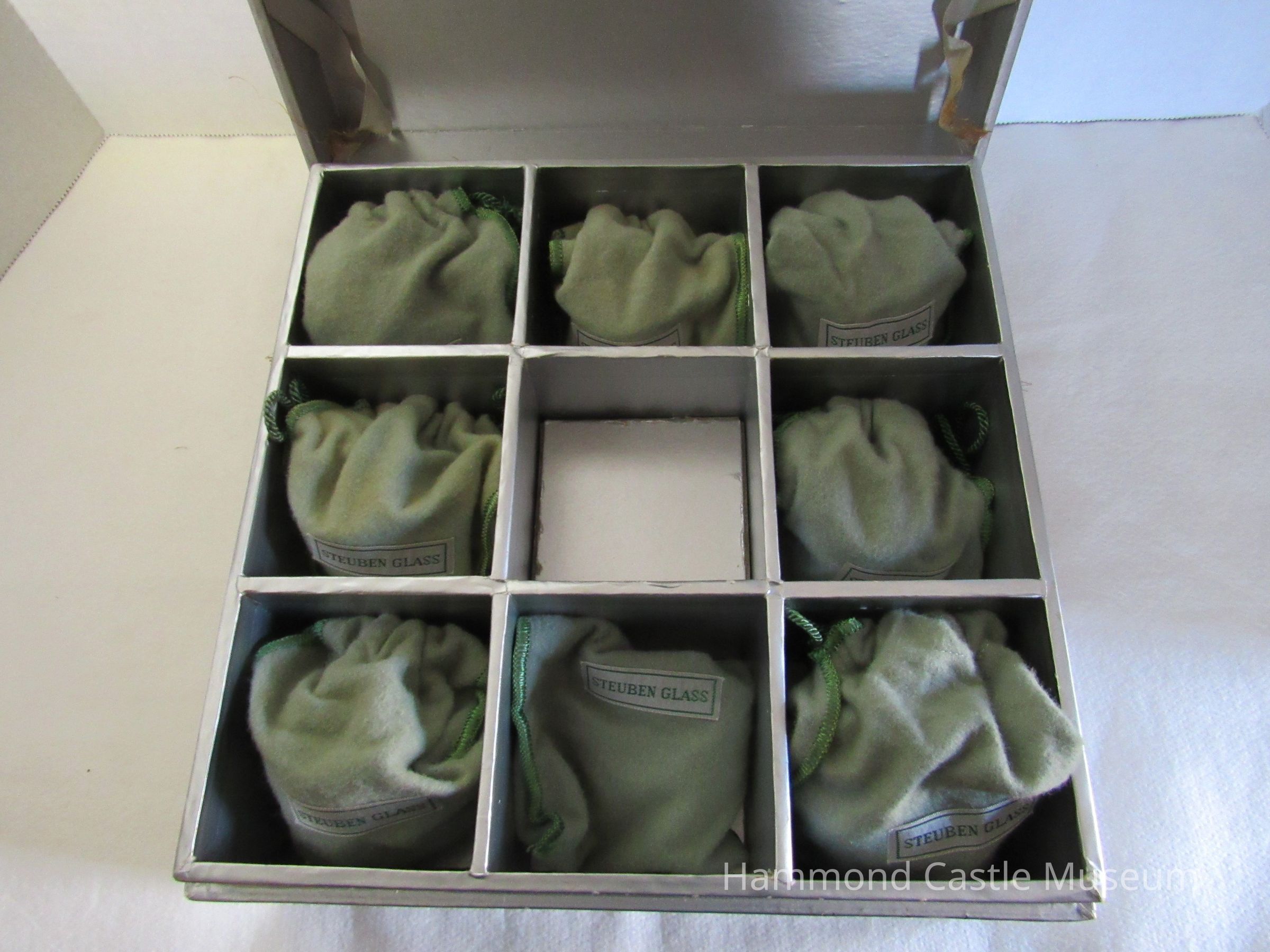 Steuben Glass Shot Glasses Boxed Set 16 pieces total: NN060.1 = the box NN060.2 - NN060.8 = 7 shot glasses NN060.9 - NN060.16 = 8 velvet bags