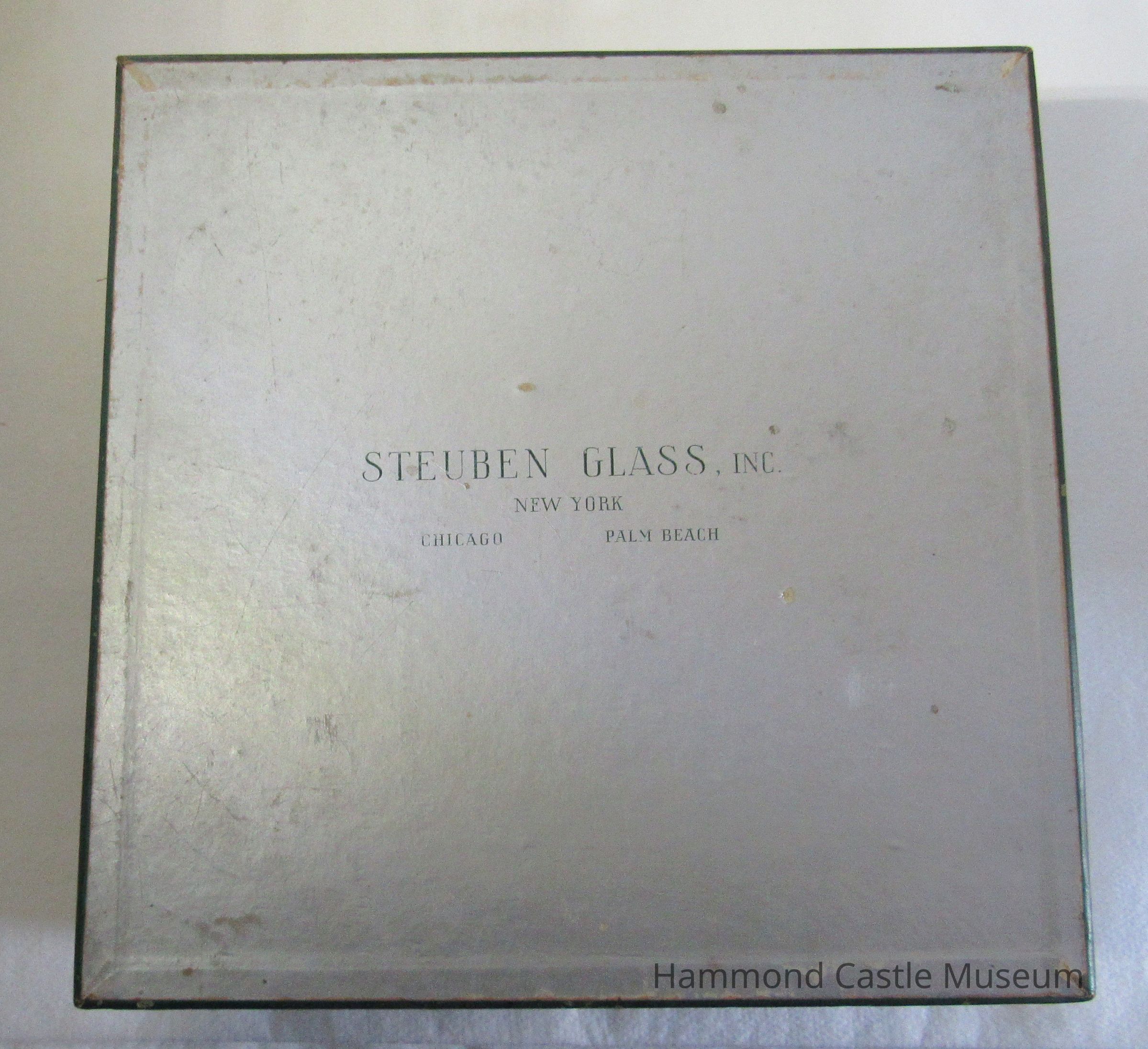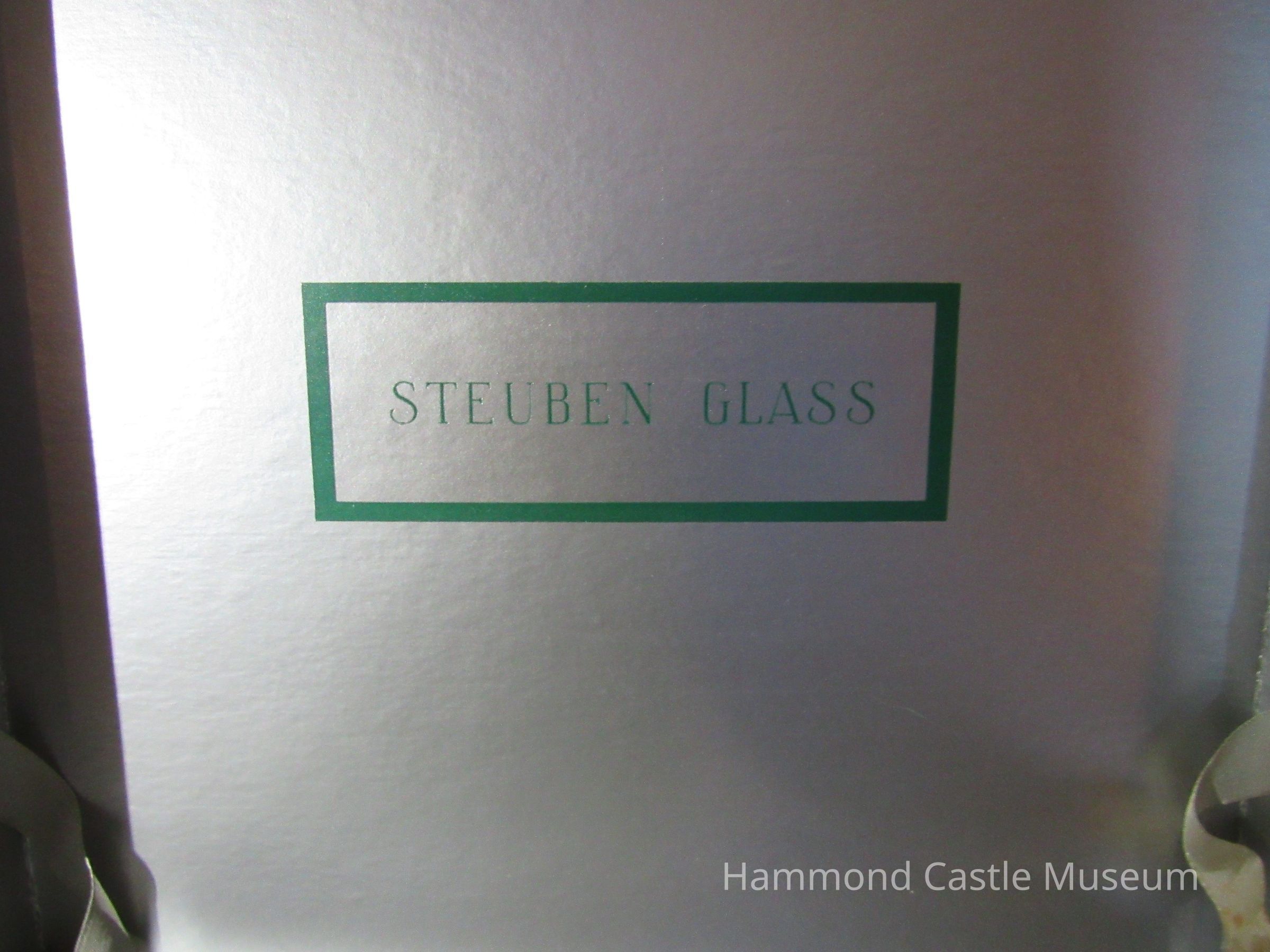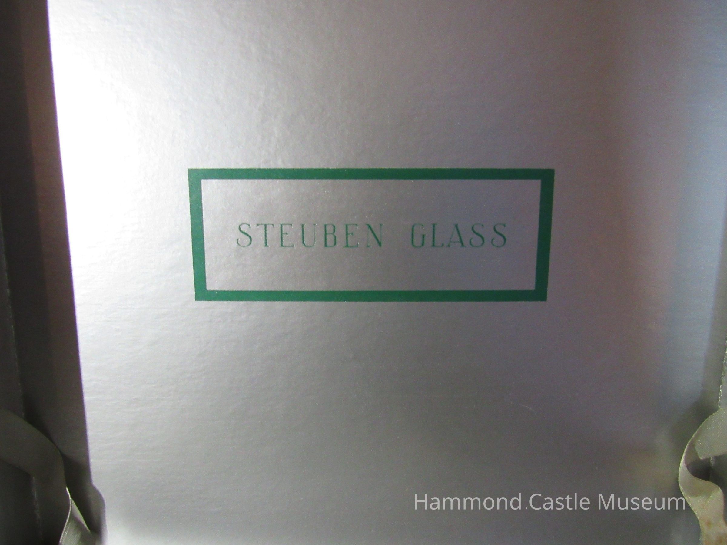 Steuben Glass Shot Glasses Boxed Set 16 pieces total: NN060.1 = the box NN060.2 - NN060.8 = 7 shot glasses NN060.9 - NN060.16 = 8 velvet bags