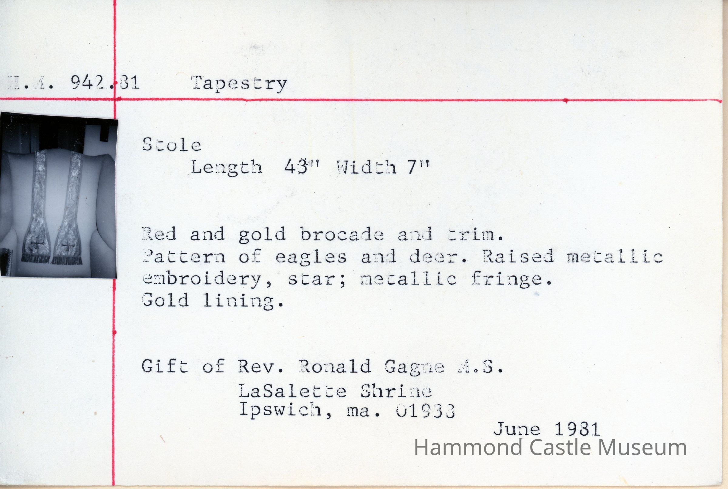 Red and gold brocade and trim. Pattern of eagles and deer. Raised metallic embroidery, star; metallic fringe. Gold lining. Gift of Rev. Ronald Gagne M.S. LaSalette Shrine Ipswich, MA 01938 June 1981