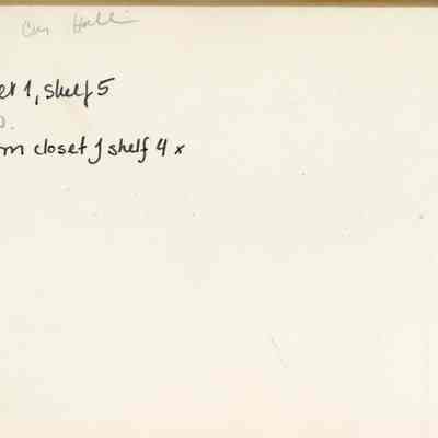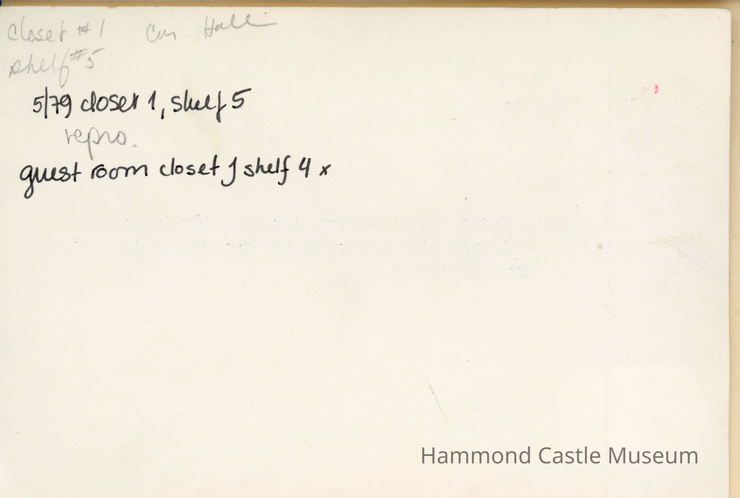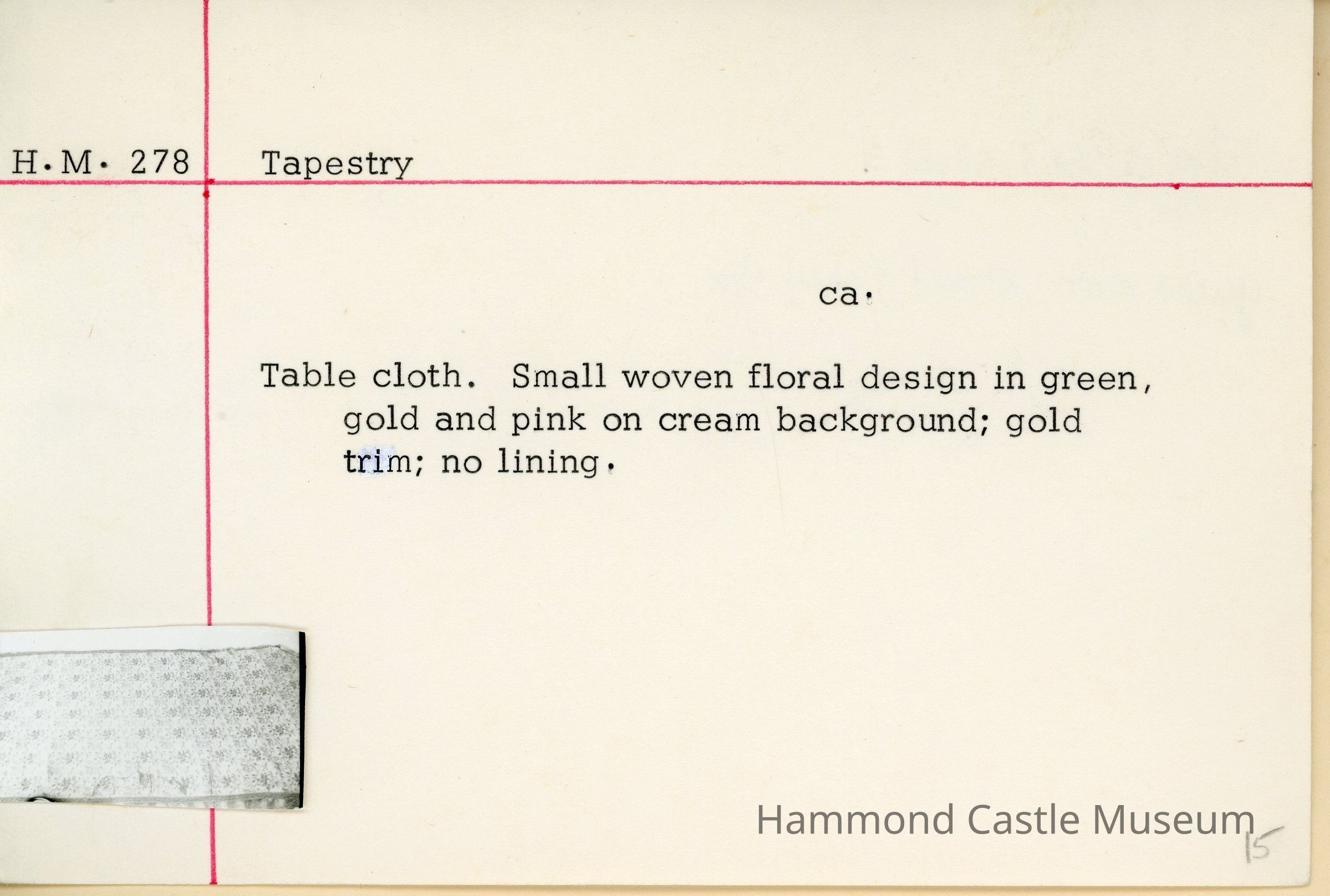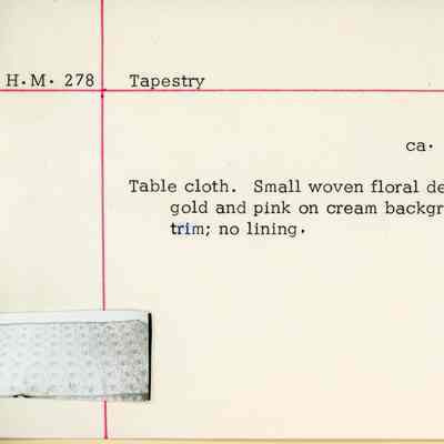 Small woven floral design in green, gold, and pink on cream background; gold trim; no lining (Located in Guest Closet?)