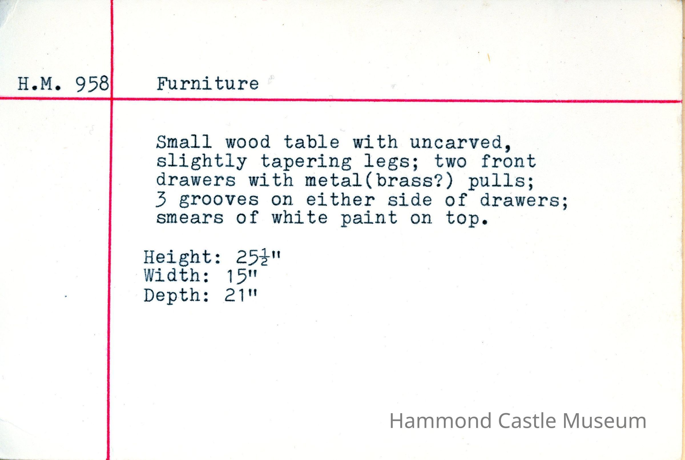 Small wood table with uncarved, slightly tapering legs; two front drawers with metal (possibly brass) pulls; 3 grooves on either side of drawers; smears of white paint on top.