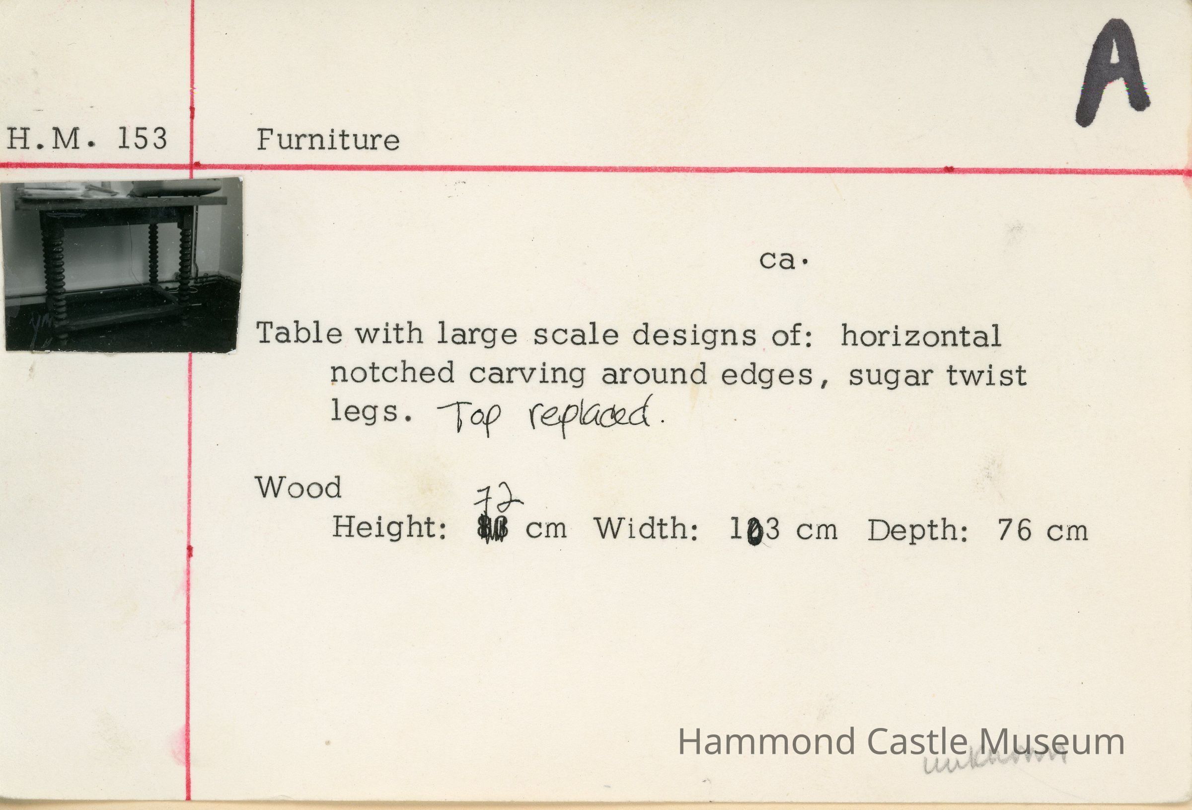 Table with large scale designs of: horizontal notched carving around edges, sugar twist legs. Top replaced.