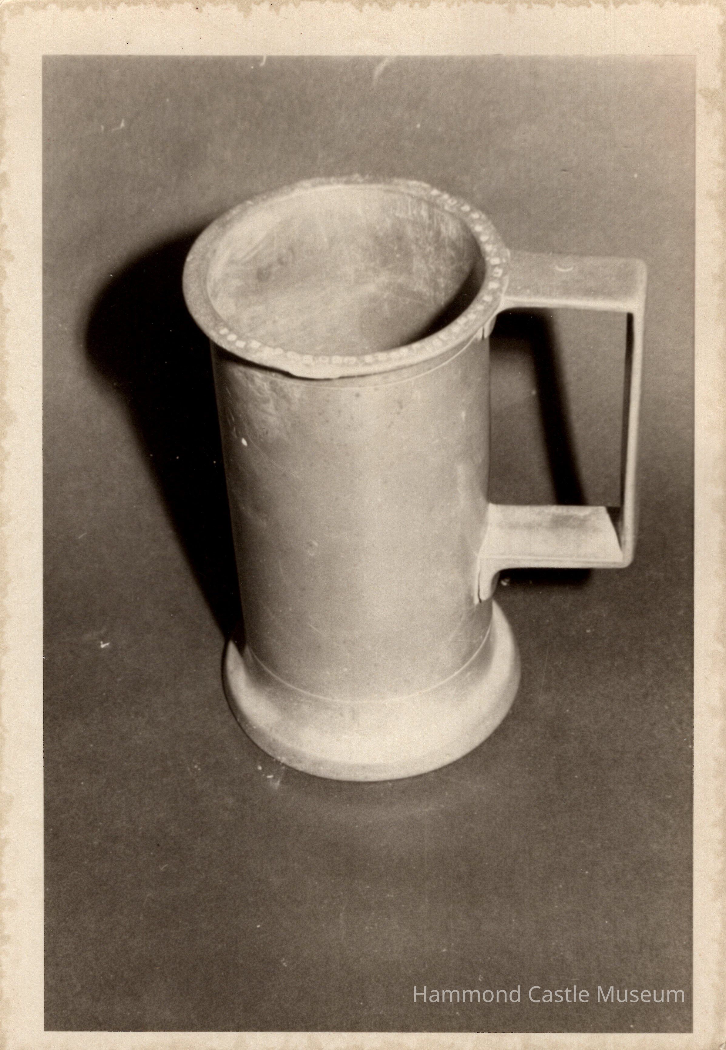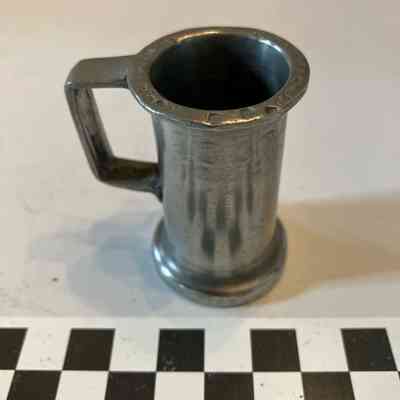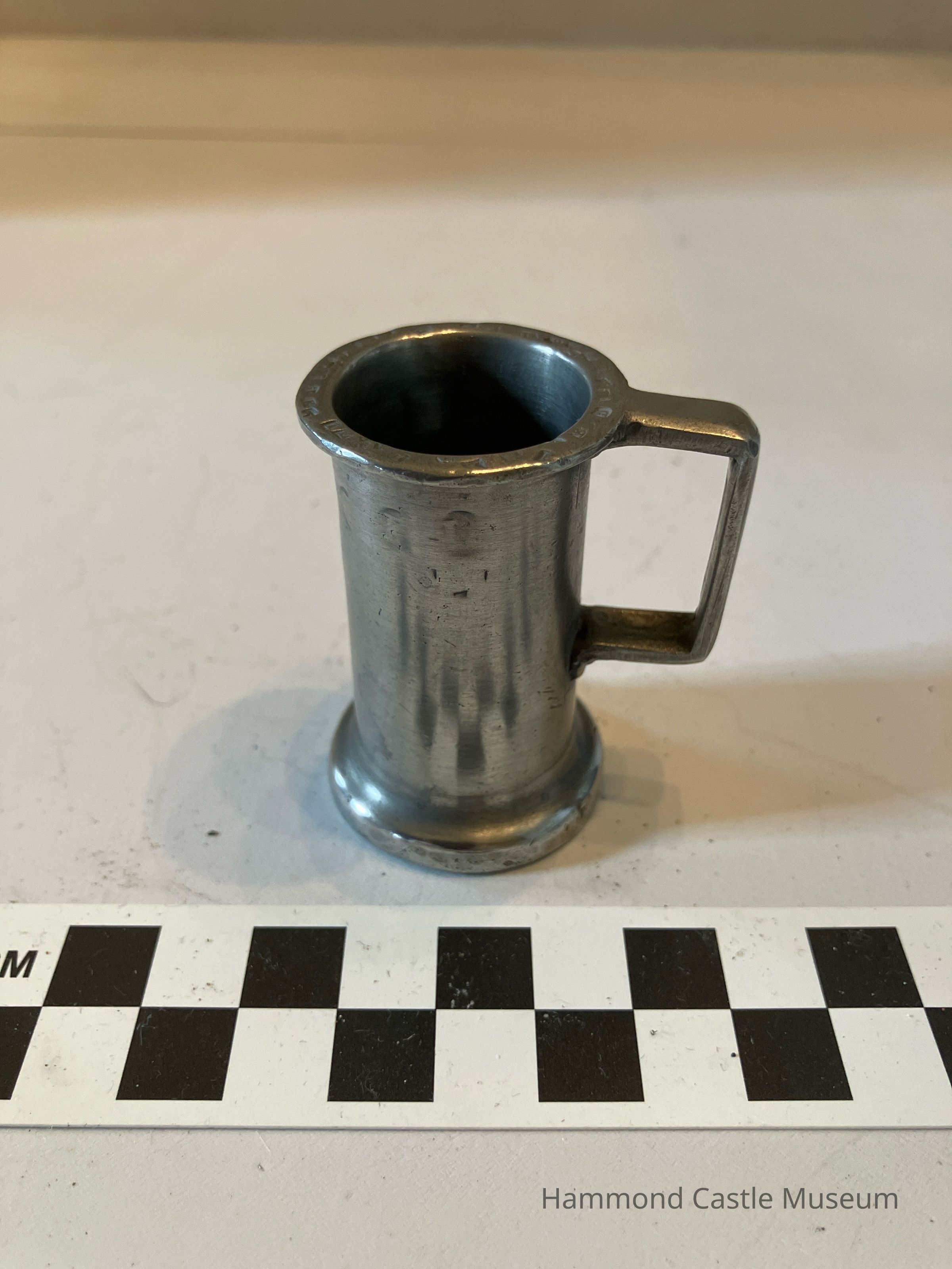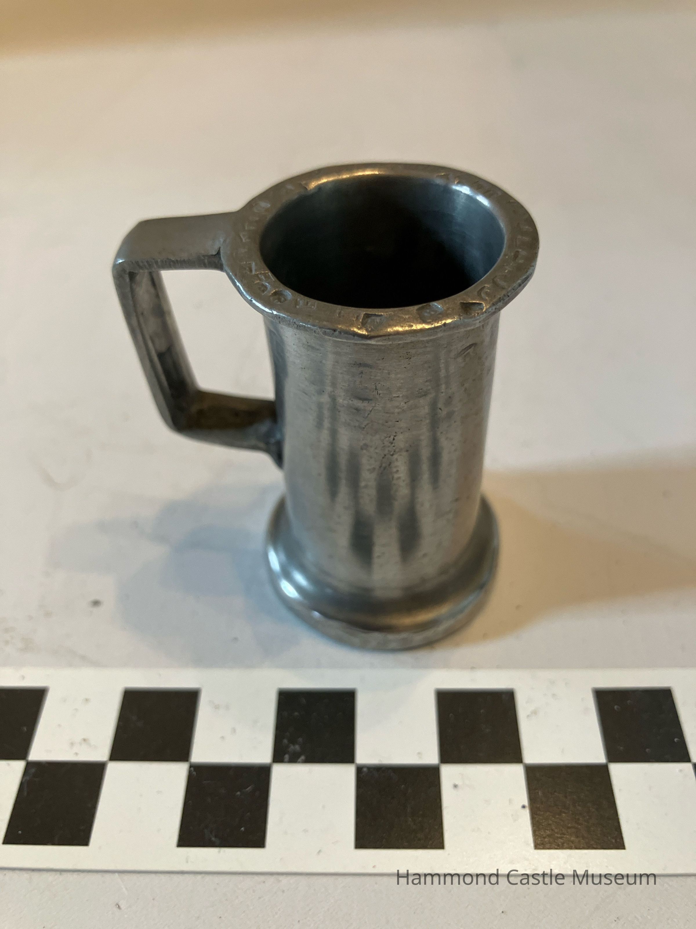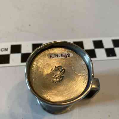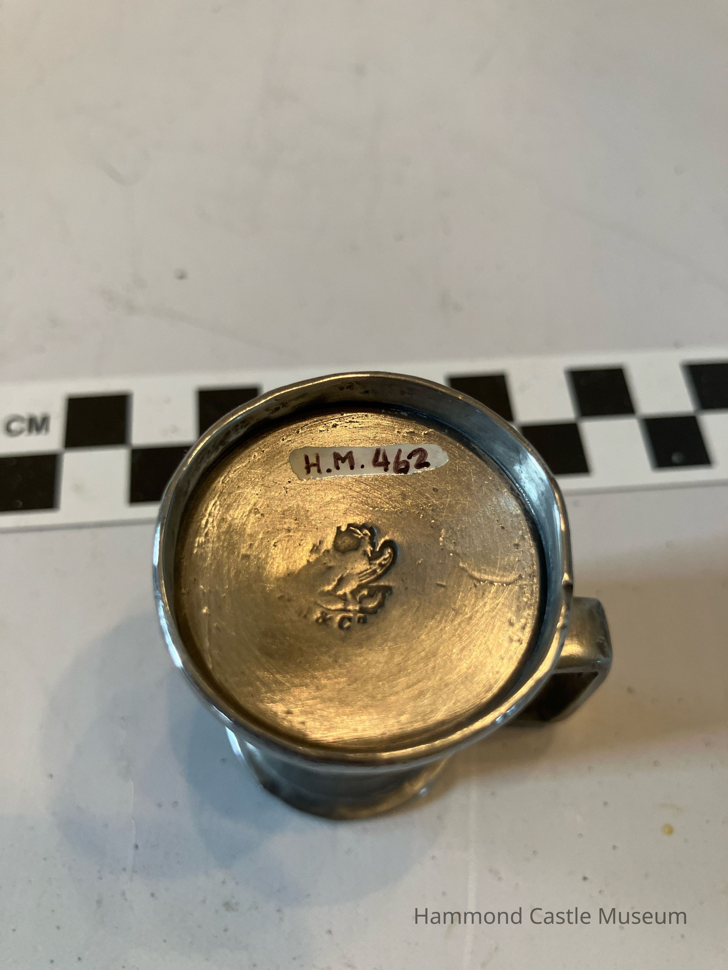 French centiliter measure, squared-off handle. Markings: numerous stamped capital letters on lip. On bottom, particularly obscured: see catalogue card.