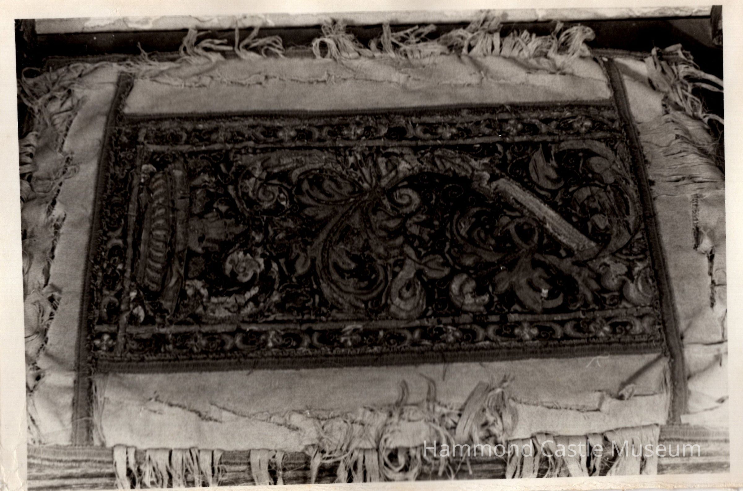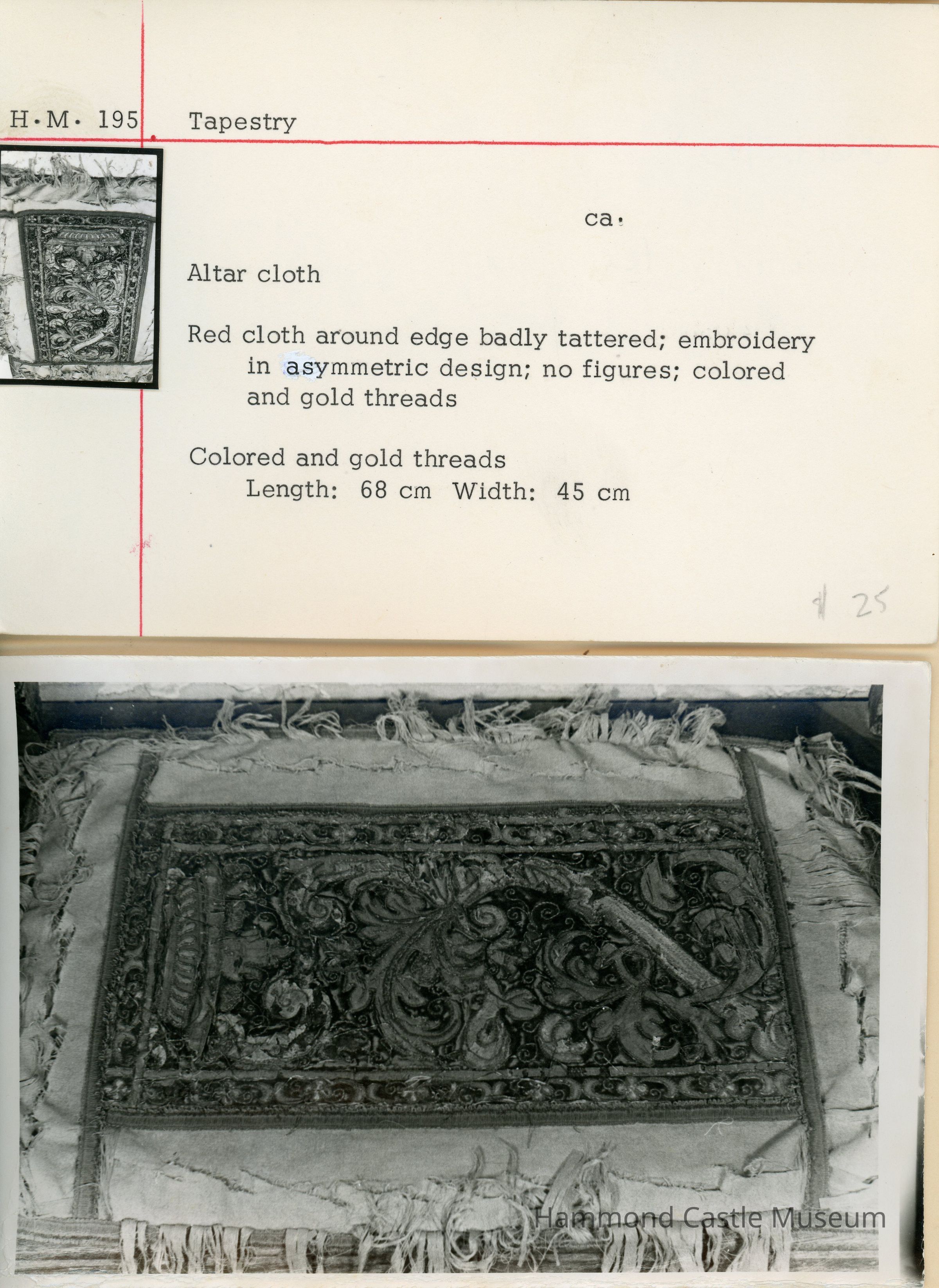 Red altar cloth - around edge badly tattered; embroidery in asymmetric floral design; no figures; colored and gold threads.