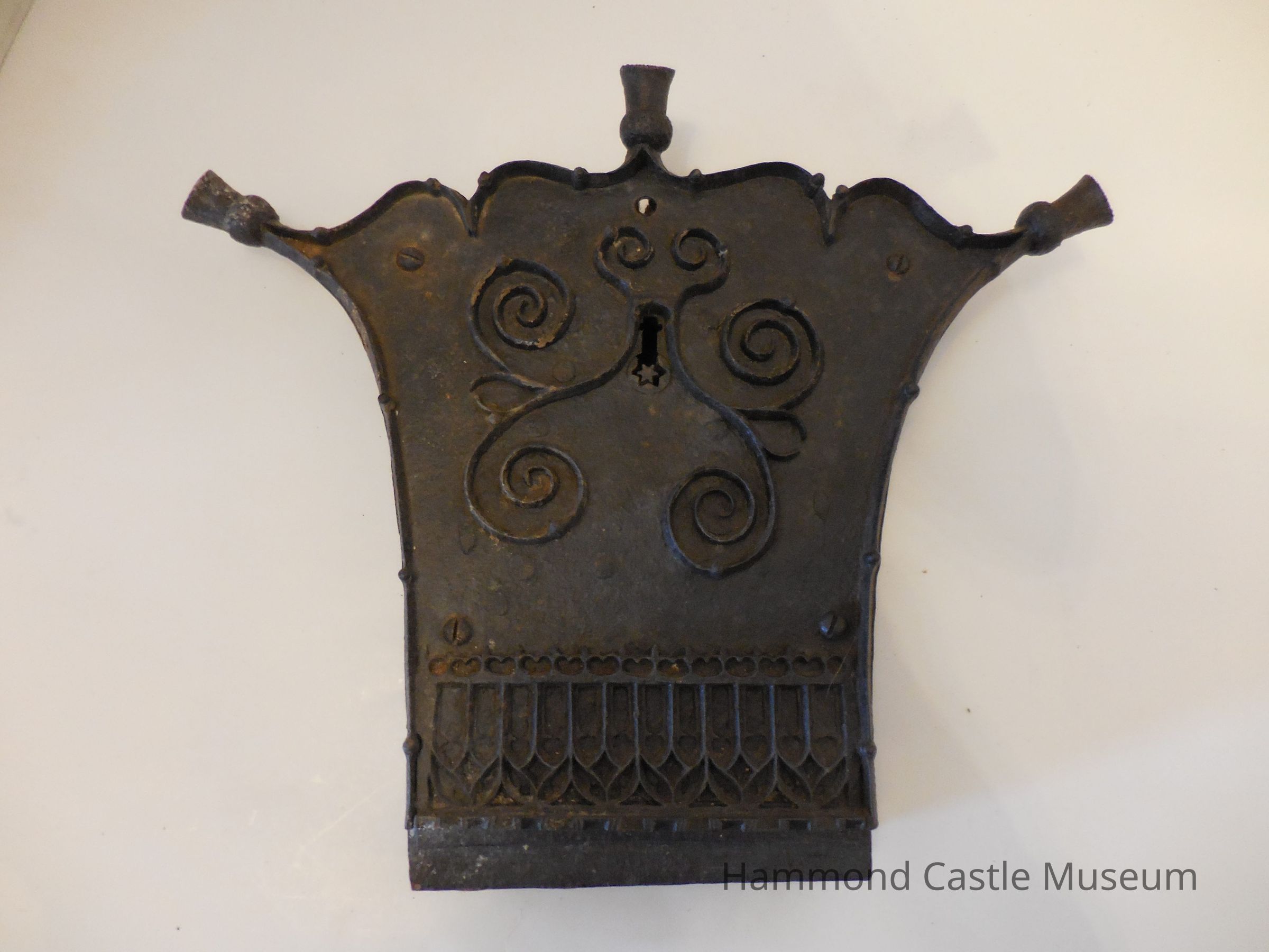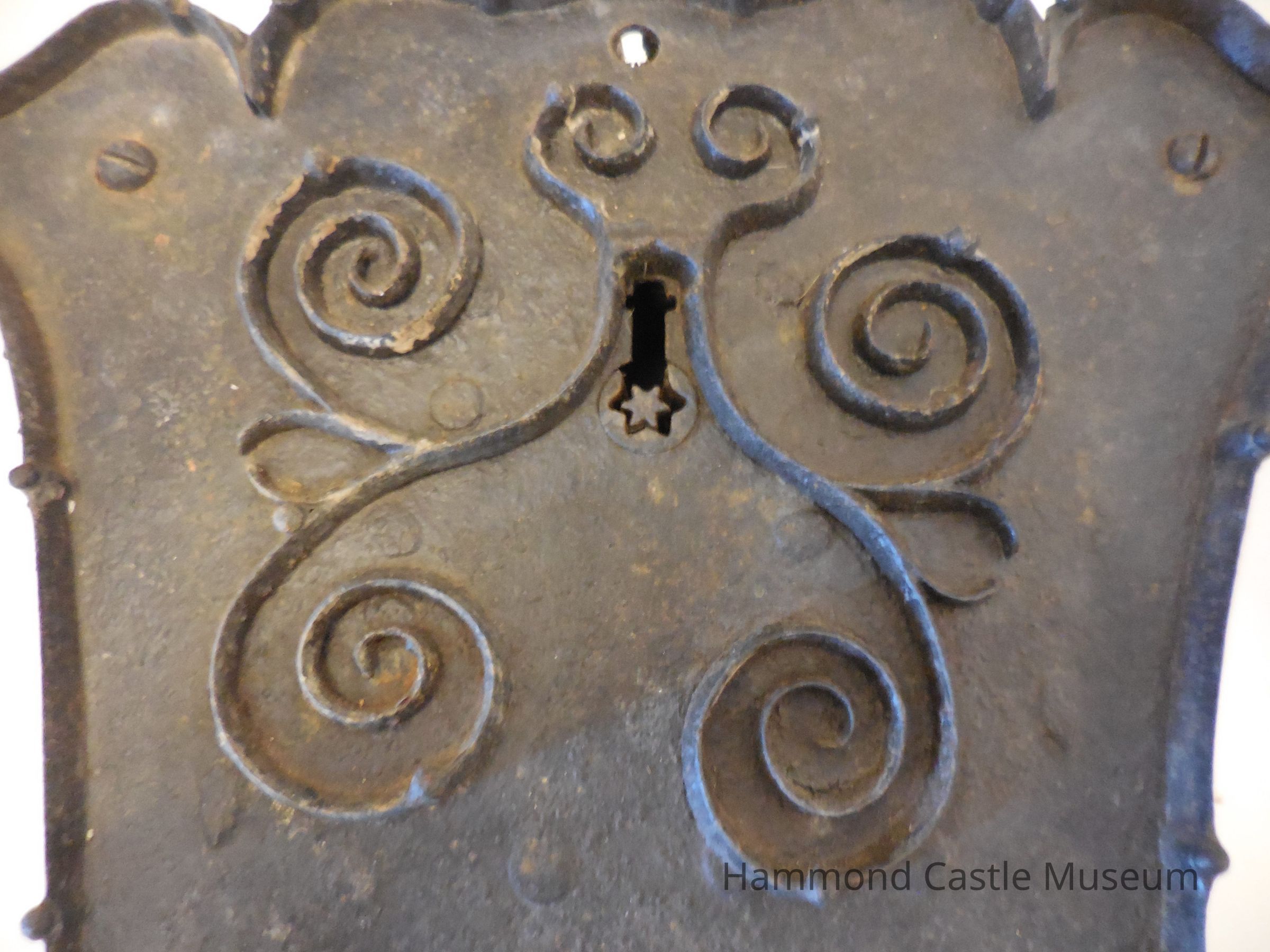 Boxy & thick star lock with enclosed mechanisms. Top is broader than the bottom, and has three "tasseled" points while the bottom is square. Unusual six-sided star cut for the bit in the keyhole. Spirals around keyhole. Lower decoration reminiscent of upside down gothic window tracery.