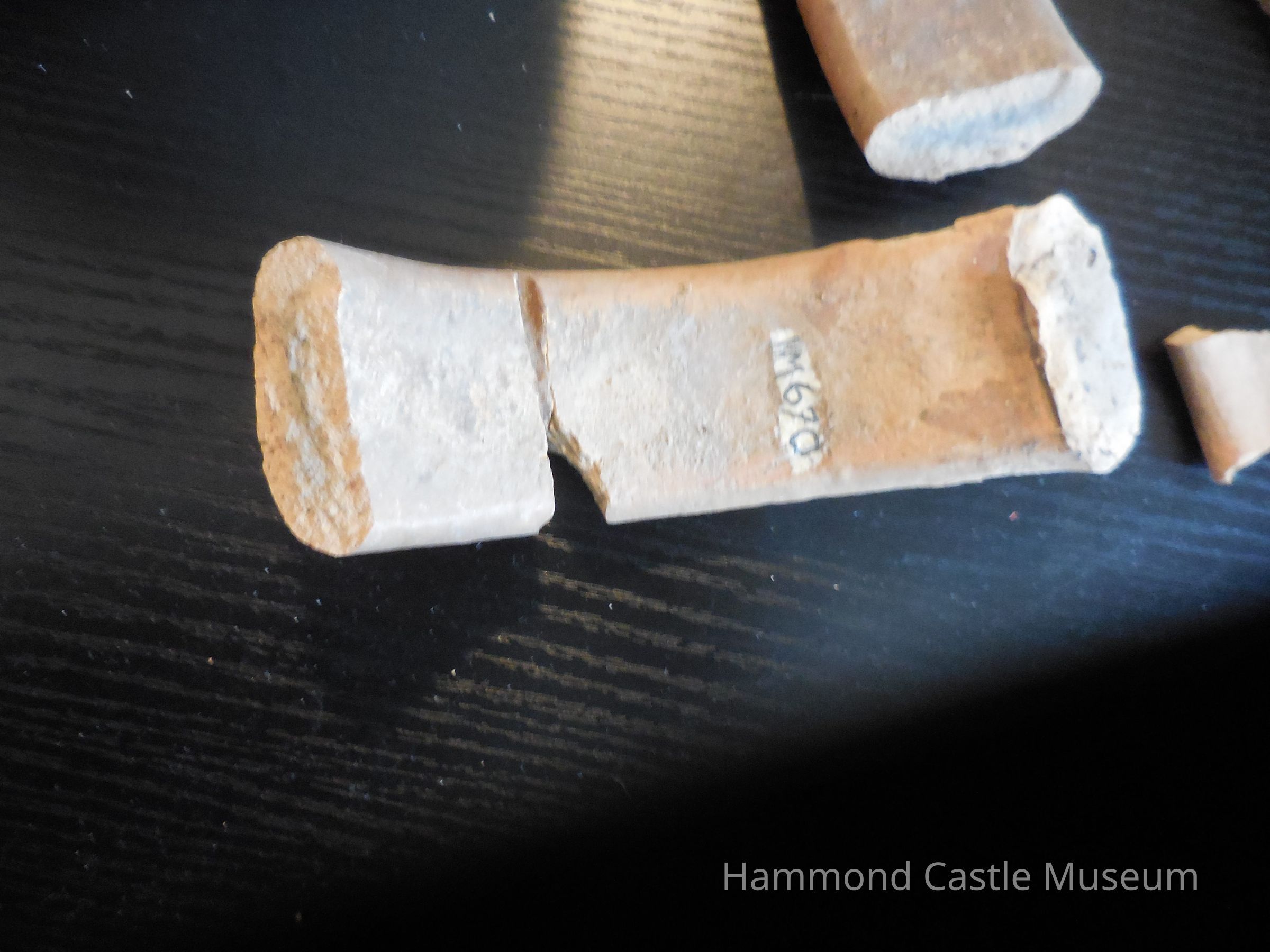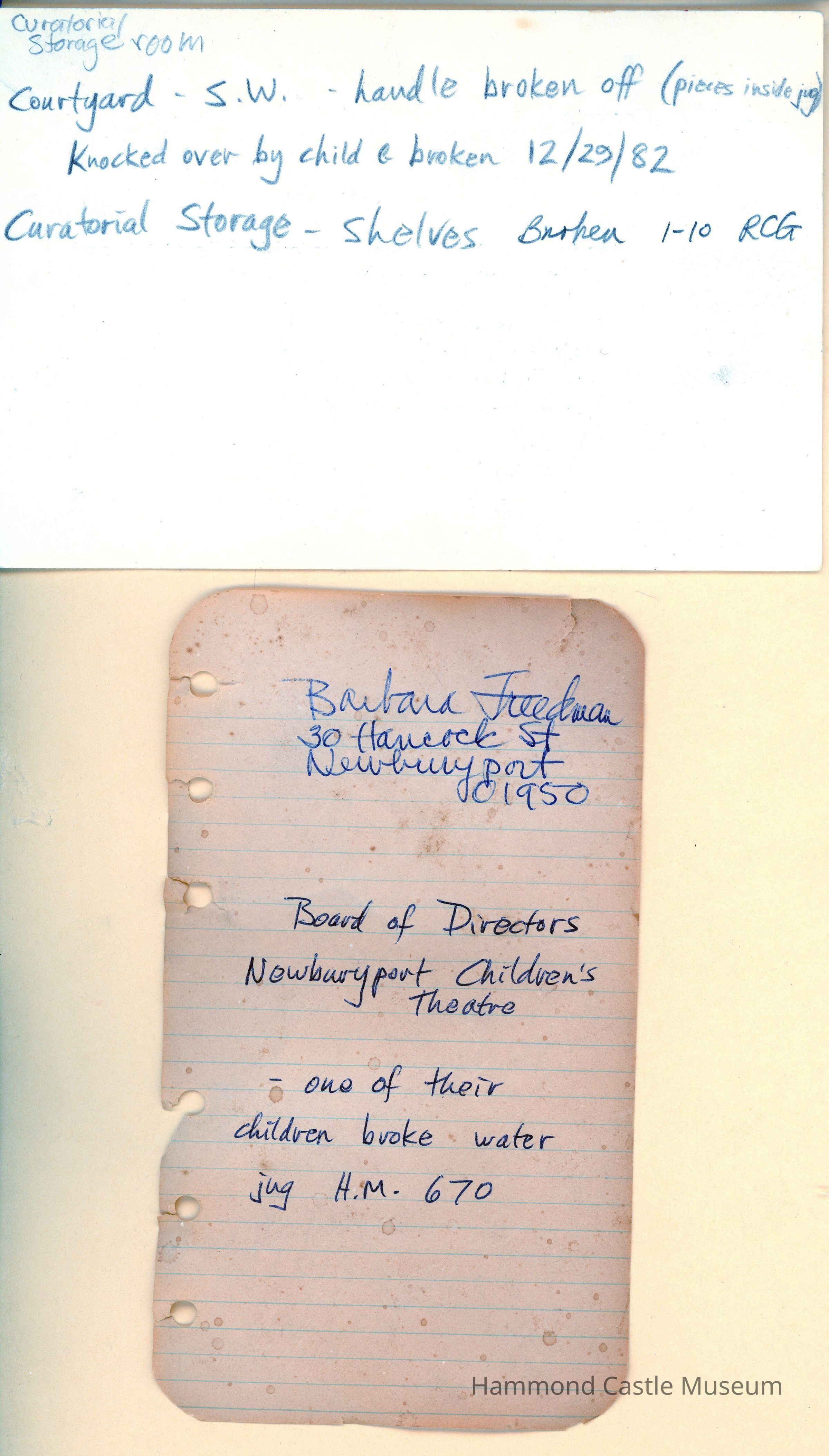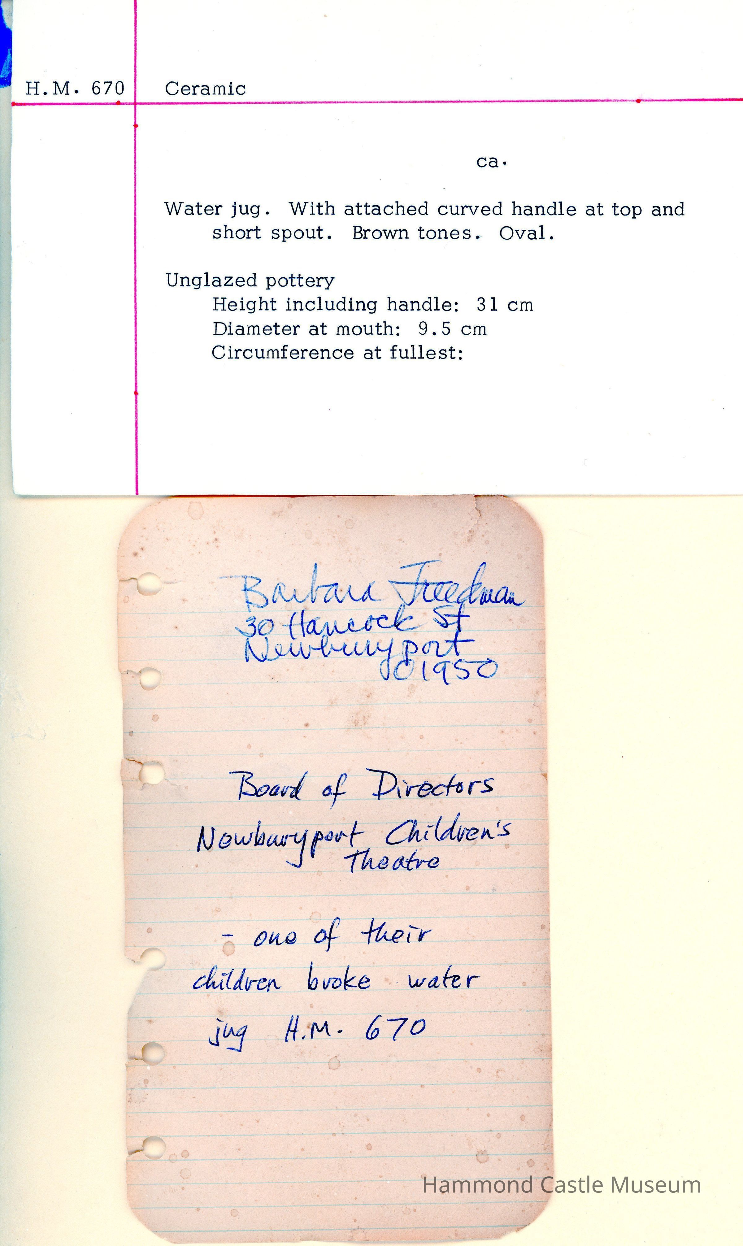 Water jug. With attached curved handle at top and short spout. Brown tones. Oval. 12/29/82 broken (see report note)