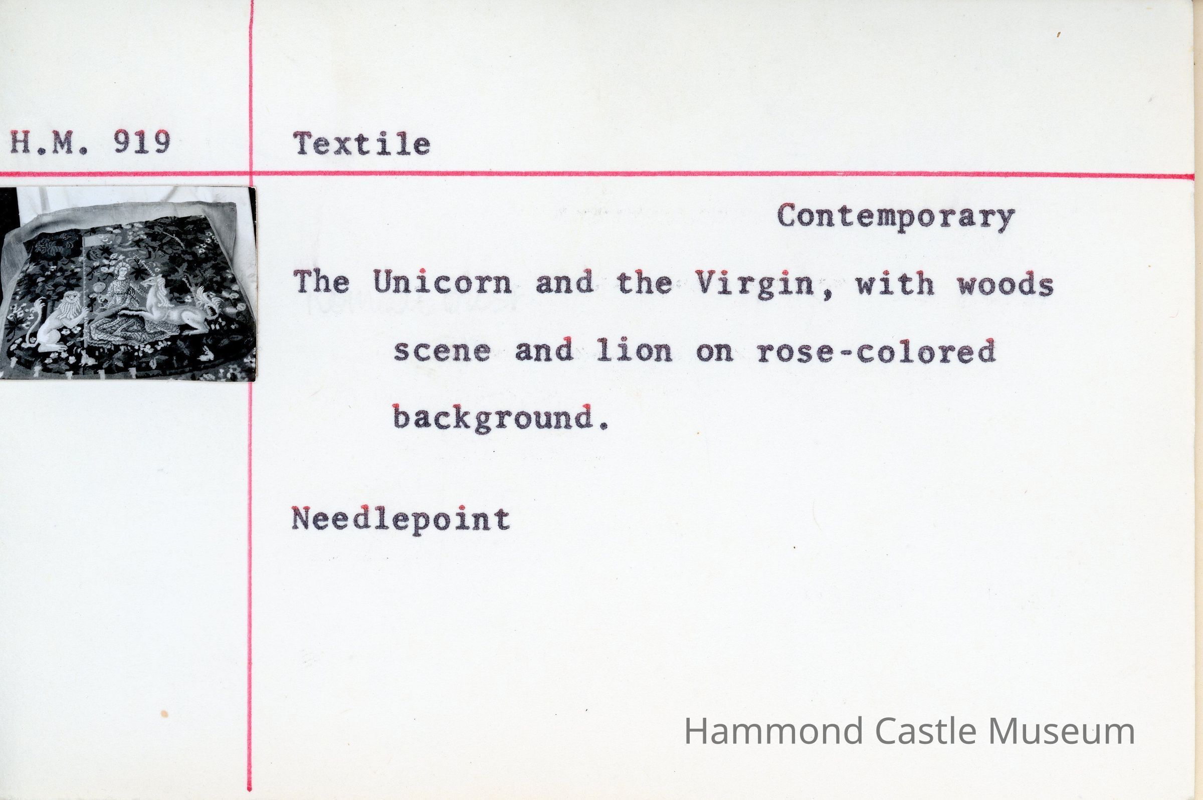 The Unicorn and the Virgin, with woods scene and lion on rose-colored background.