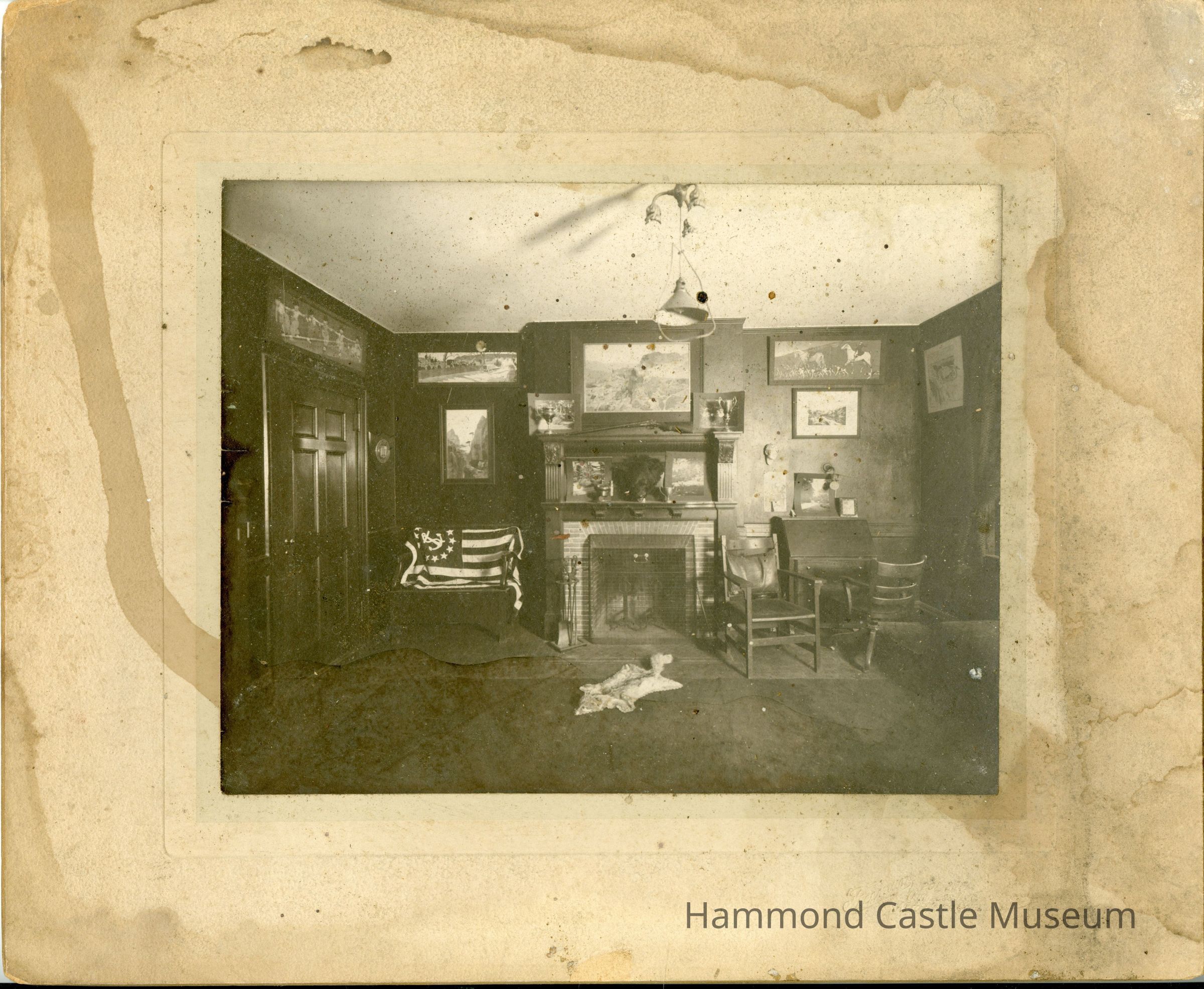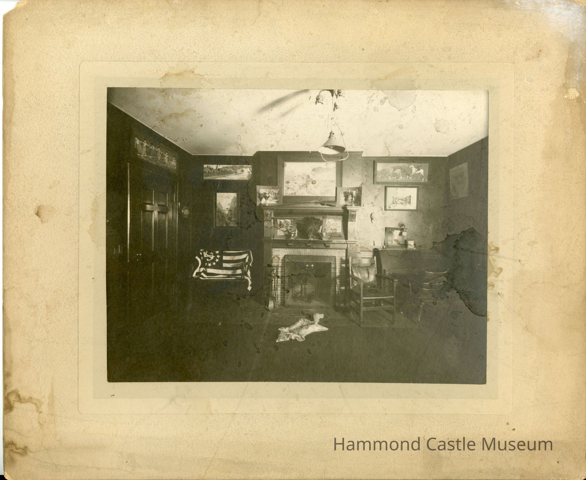 2 copies of photo of unknown room with fireplace & animal rug, possibly at Yale University
