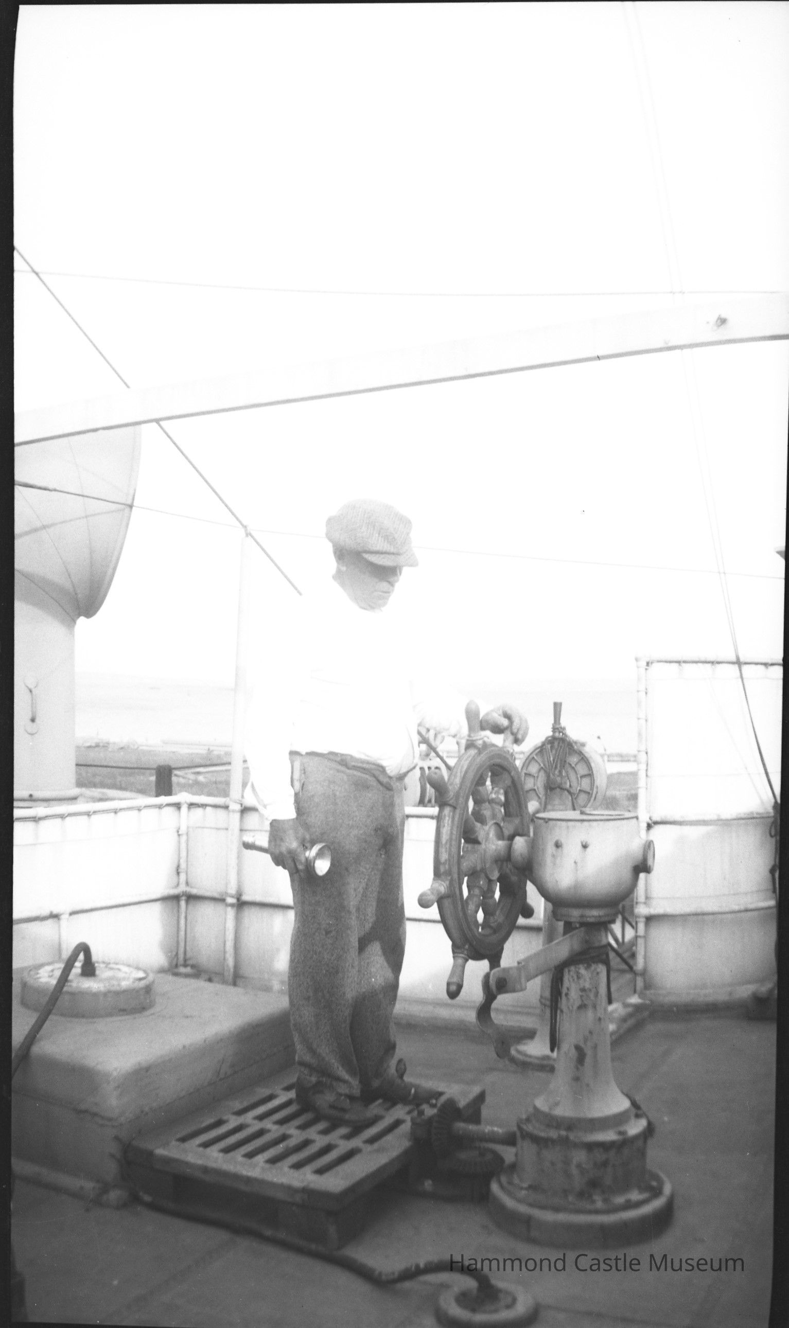 Negative of unknown vessel deck with man at the helm