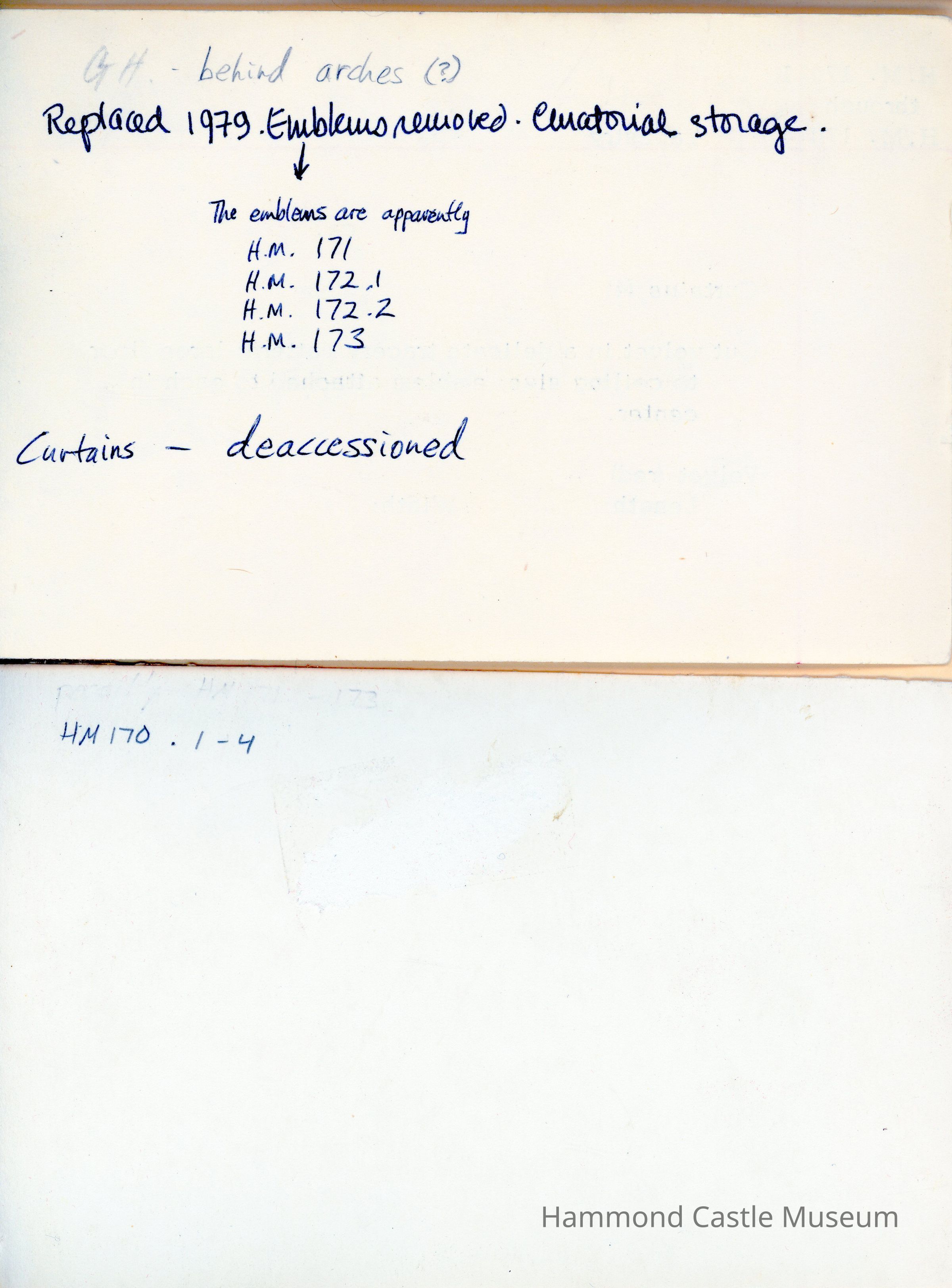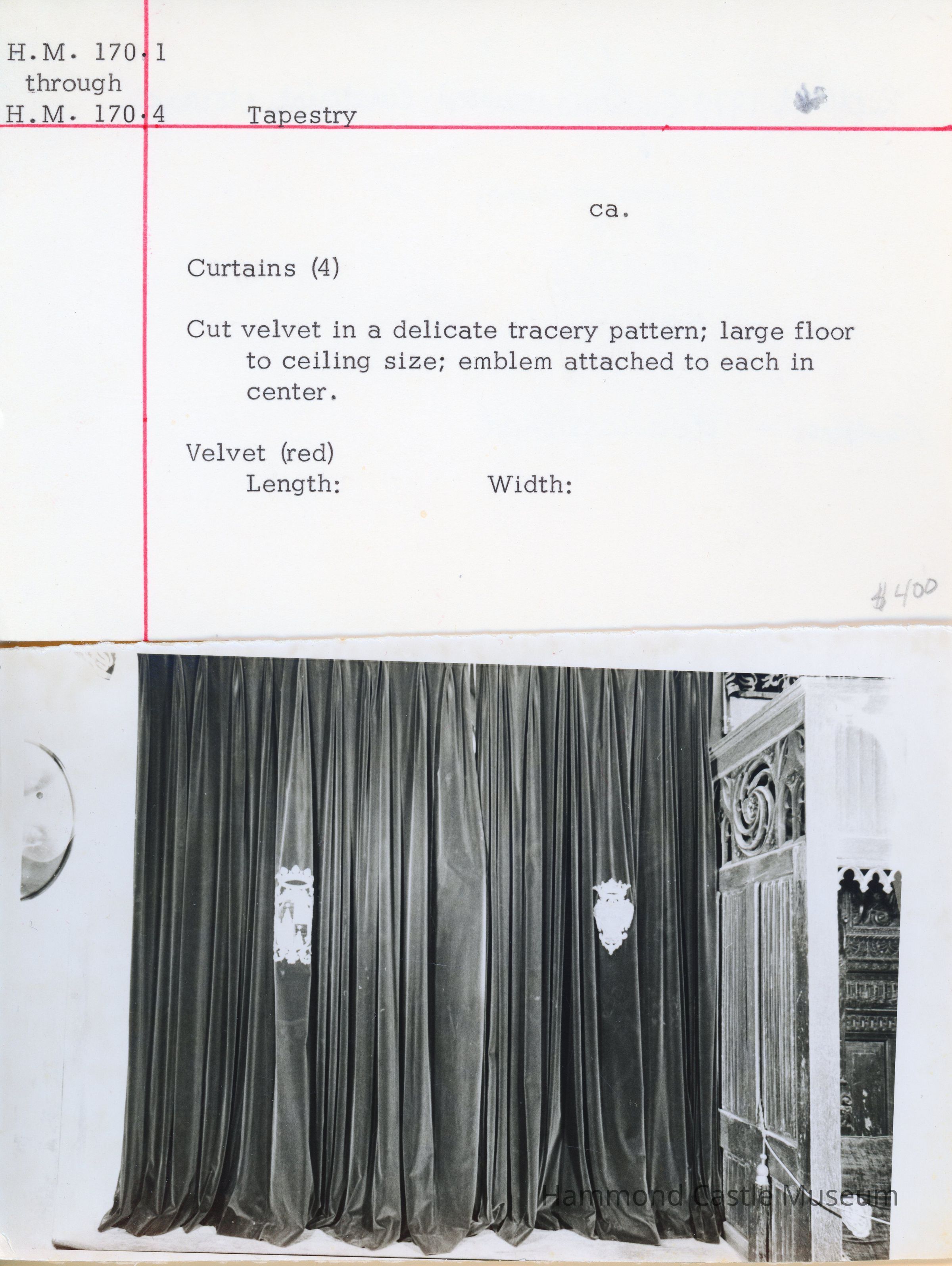 Cut velvet in a delicate tracery pattern; large floor to ceiling size; emblem attached to each in center. Emblems removed post 1980s.