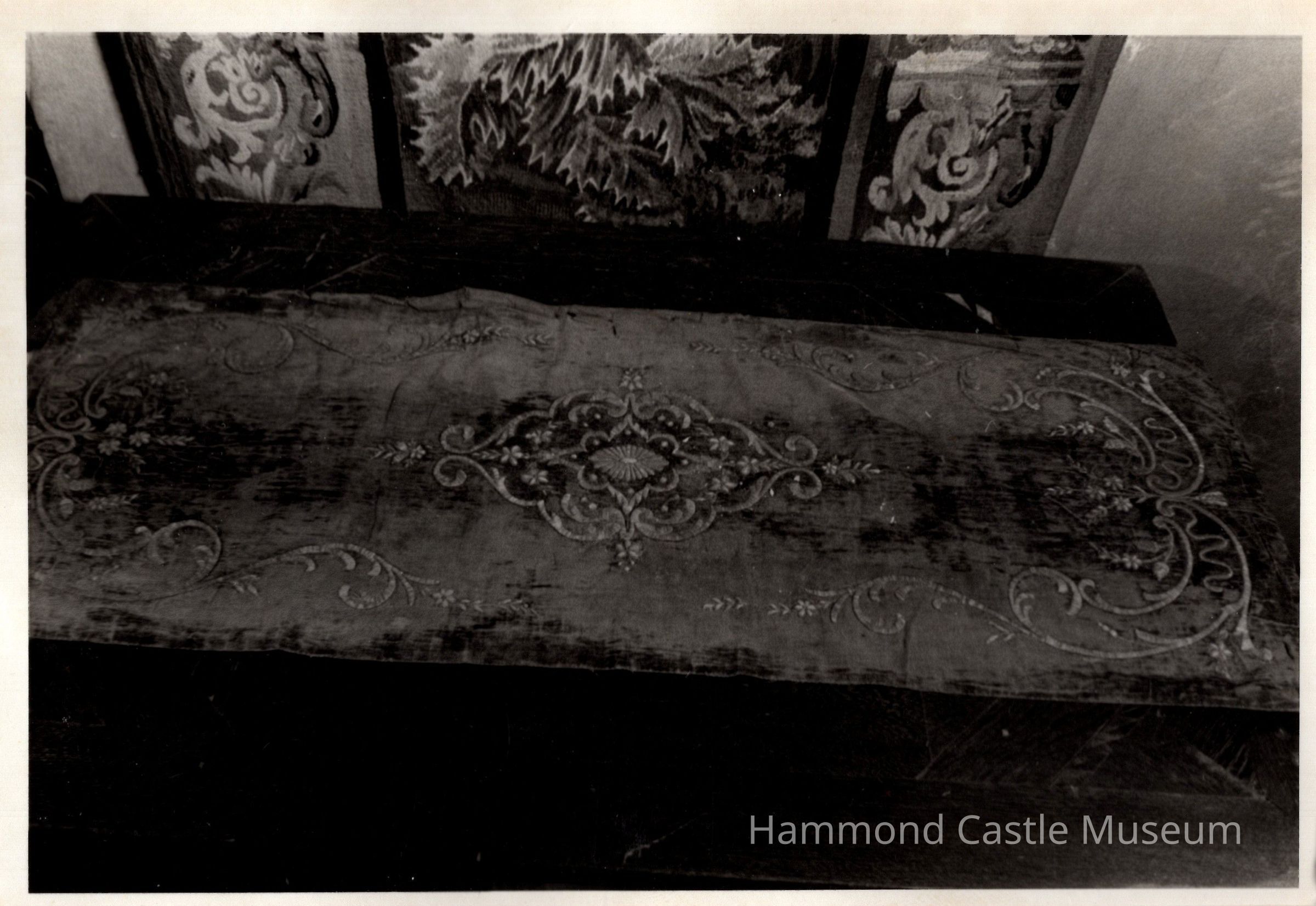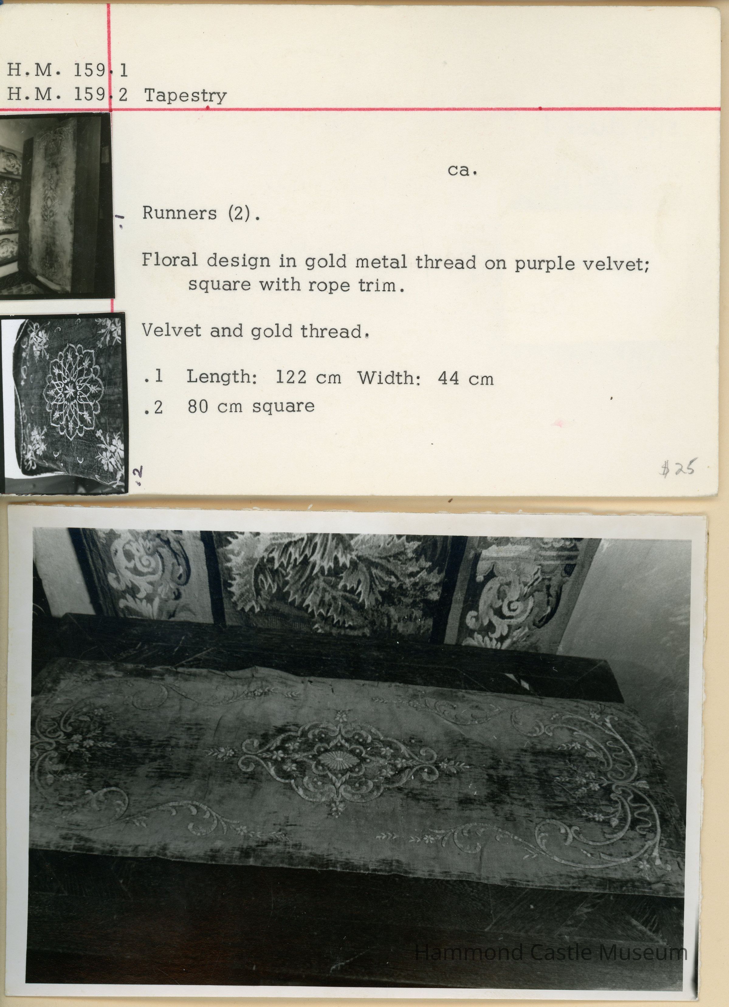 Floral design in gold metal thread on purple velvet; square with rope trim