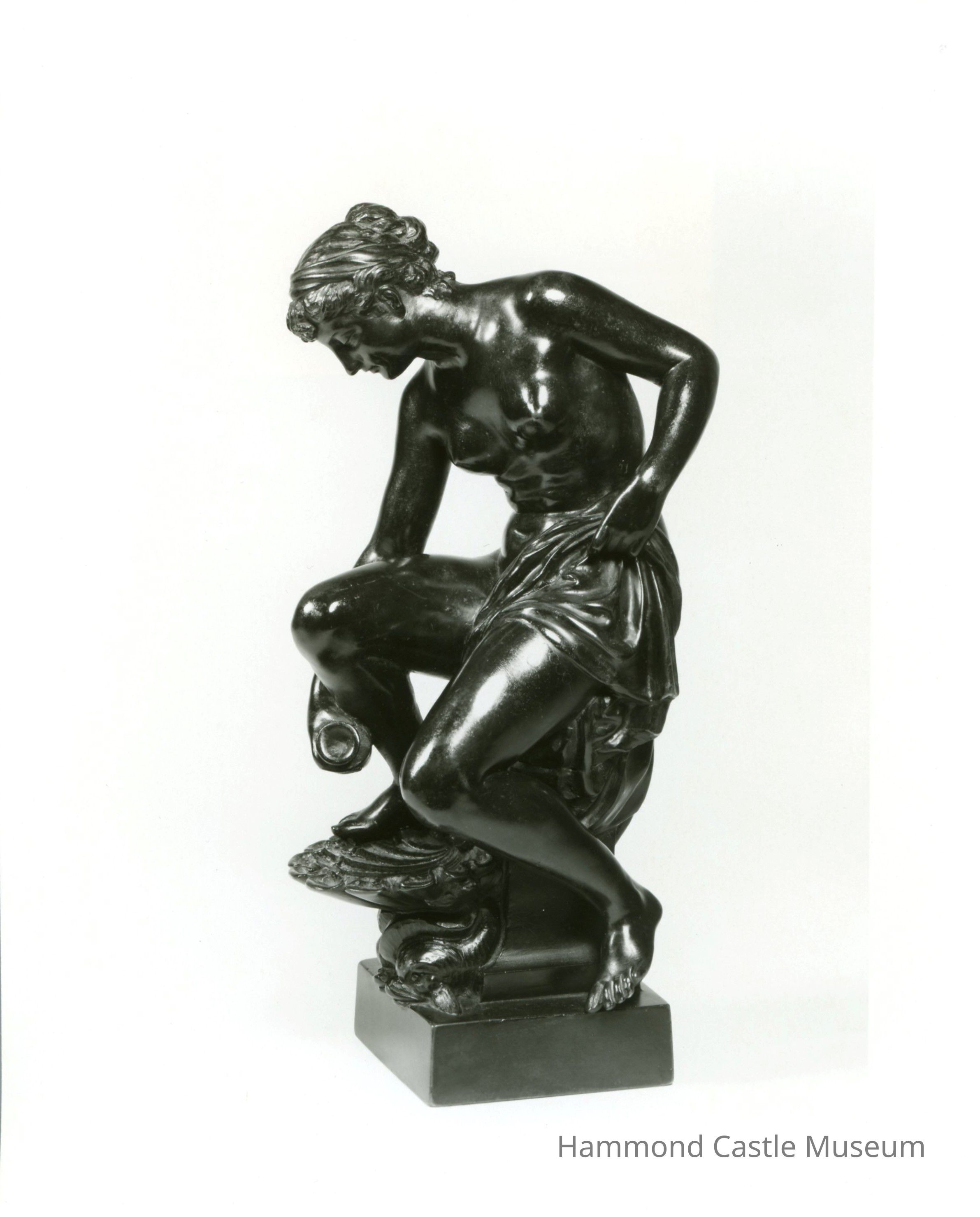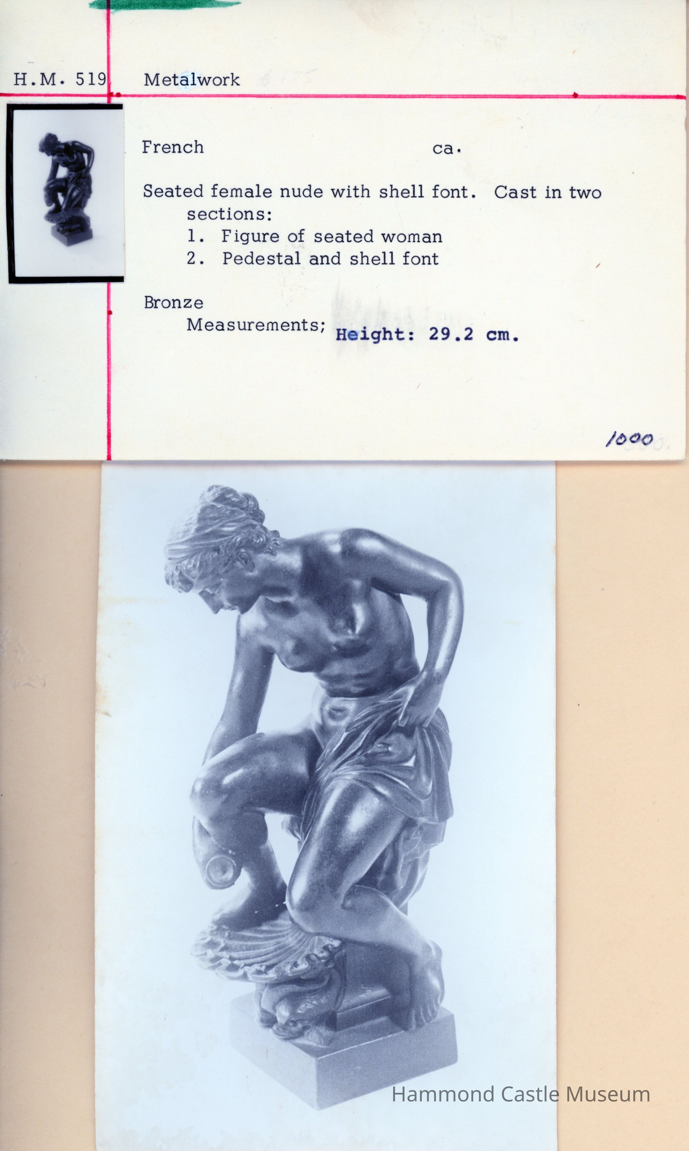 Seated female nude with shell font. Cast in two sections: 1. Figure of seated woman 2. Pedestal and shell font Possibly French