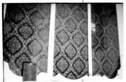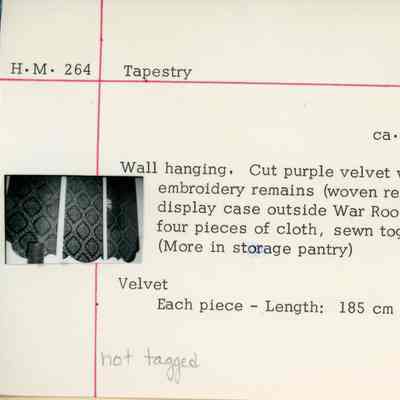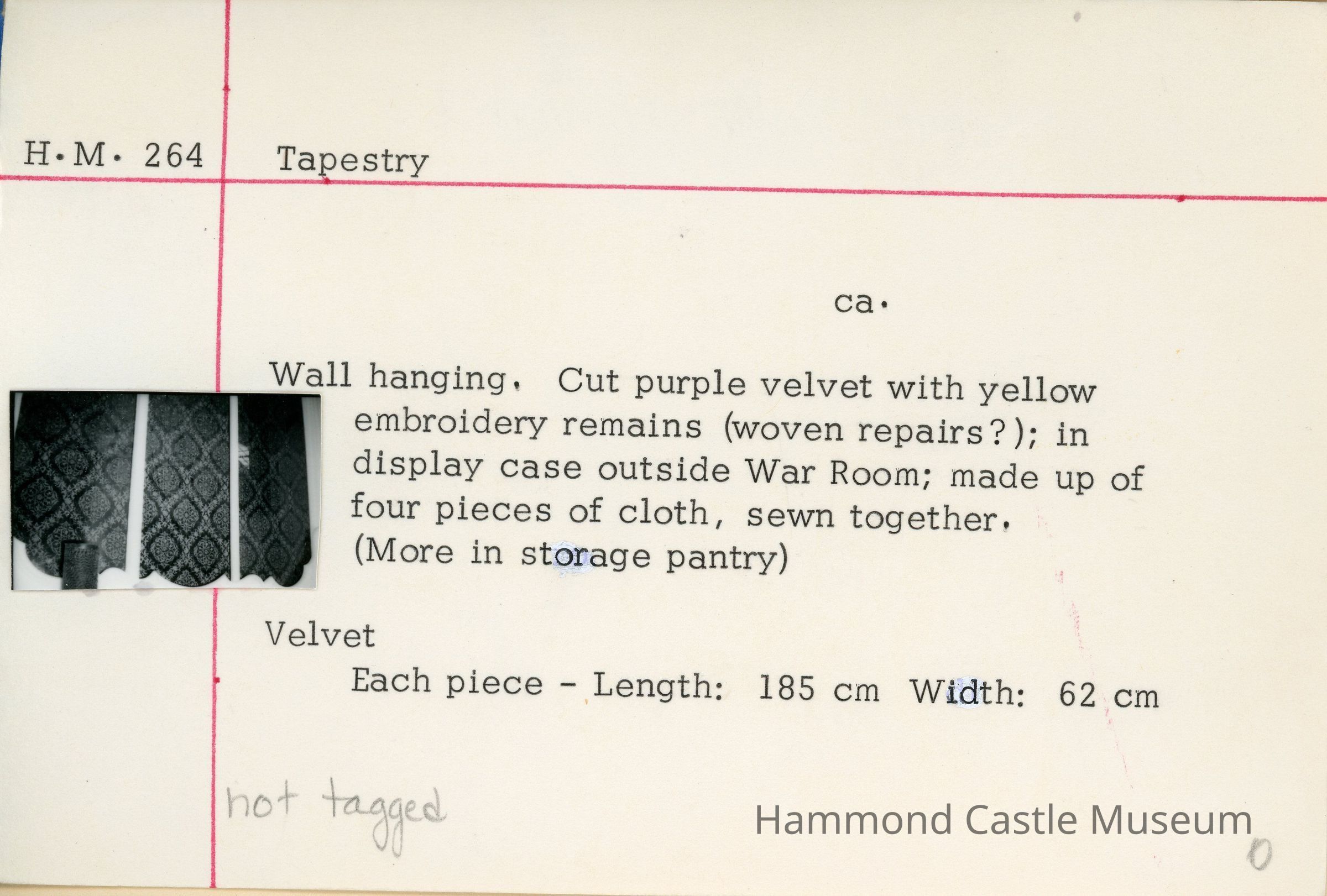 Cut purple velvet with yellow embroidery in diamond design Four separate pieces sewn together Originally in War Room/Library Staircase Display