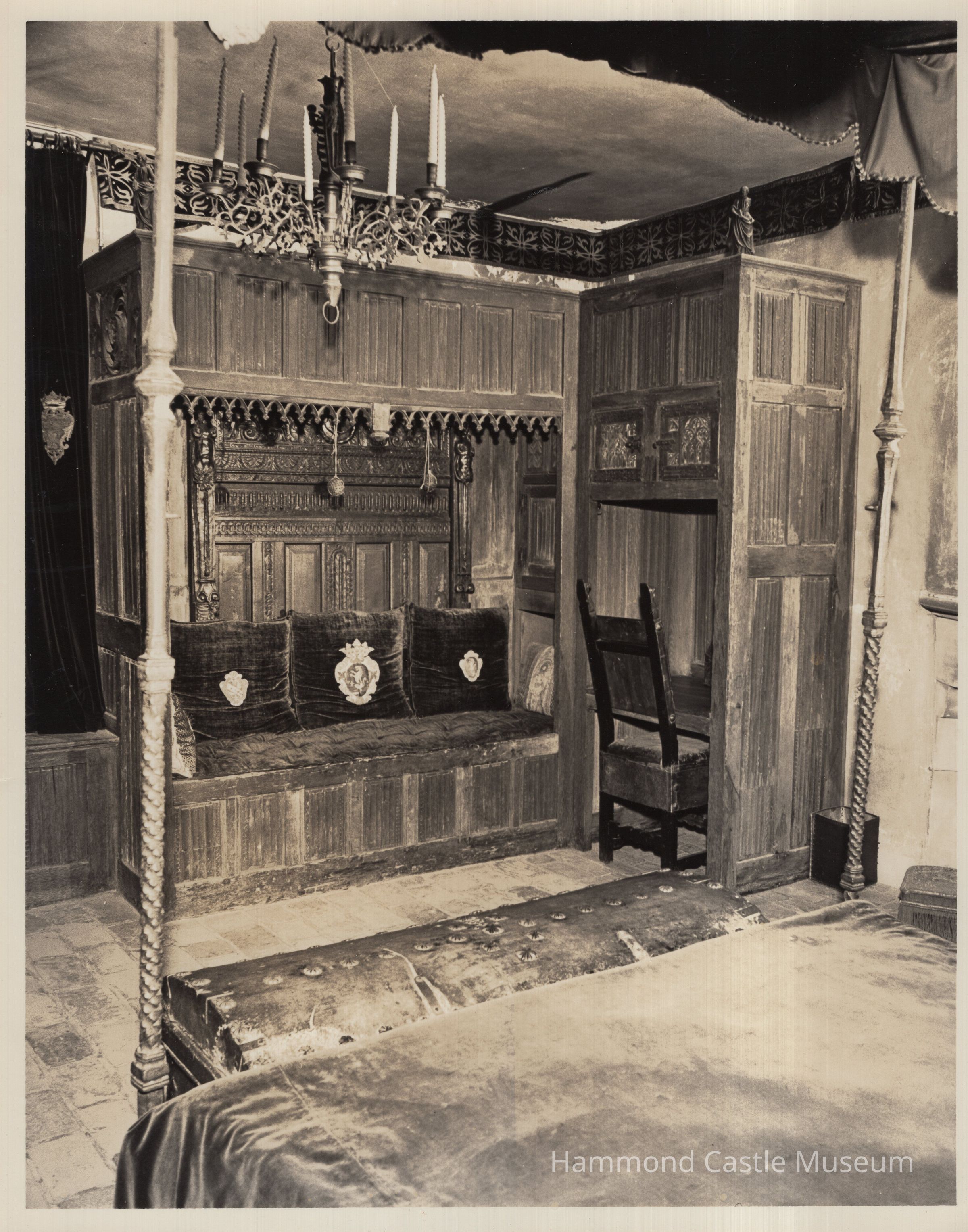 Oak carving of male saint (1 of 2), attached on top of corner bench/desk cupboard in Gothic Guestroom