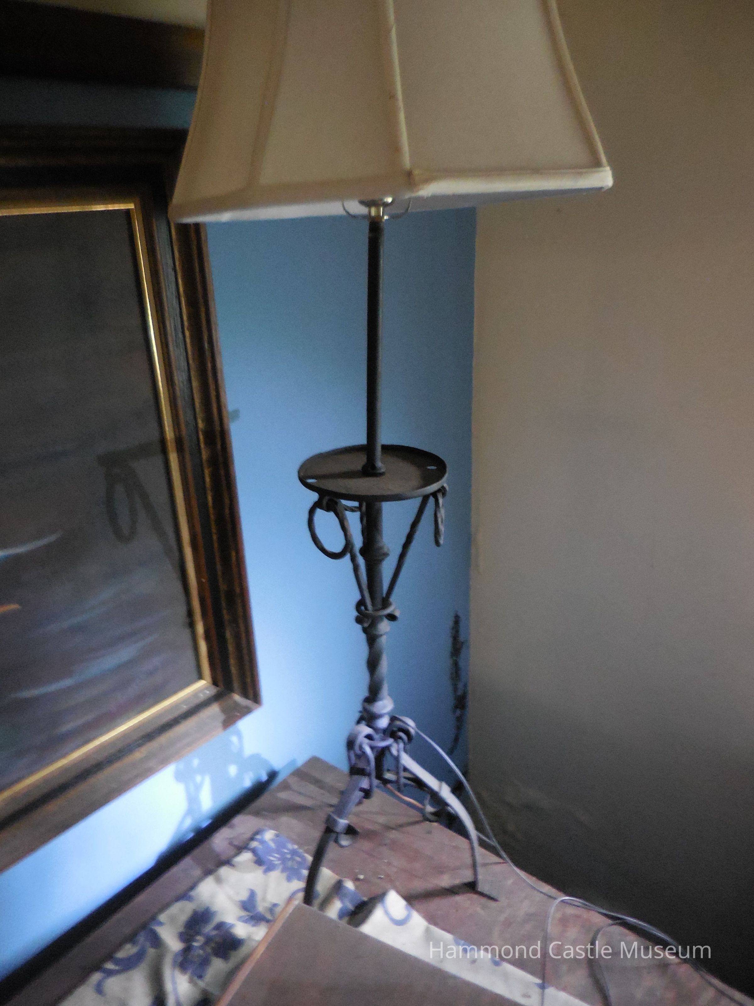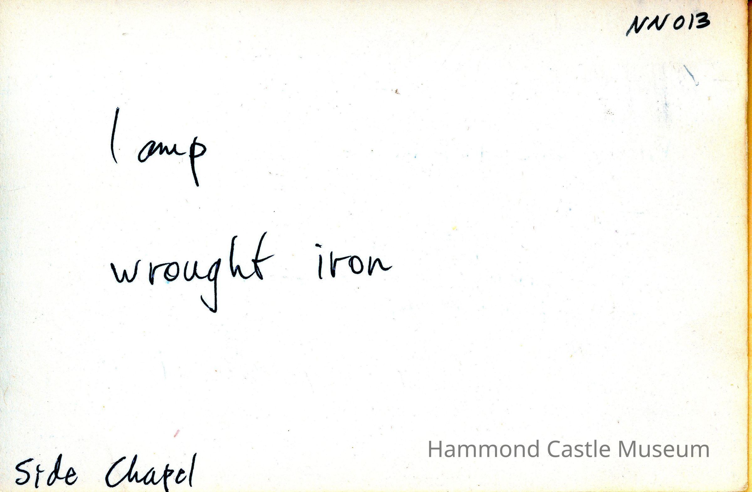 Wrought iron lamp, modernized incense lamp Shade made from 17thc Gregorian chant book (now missing)