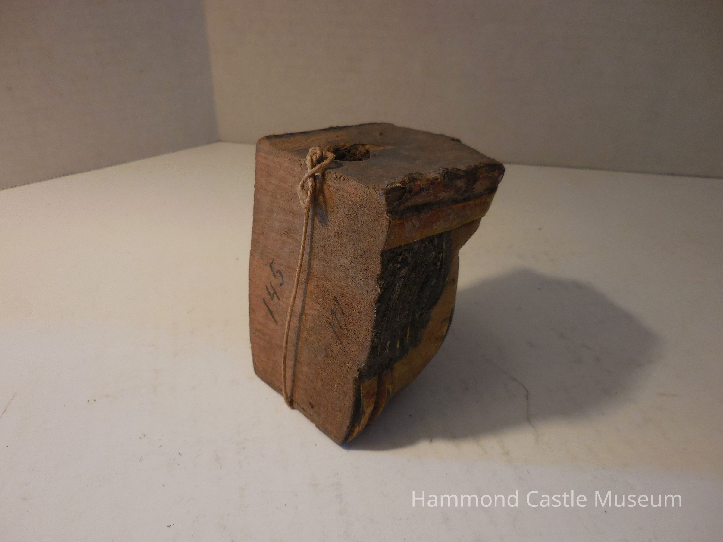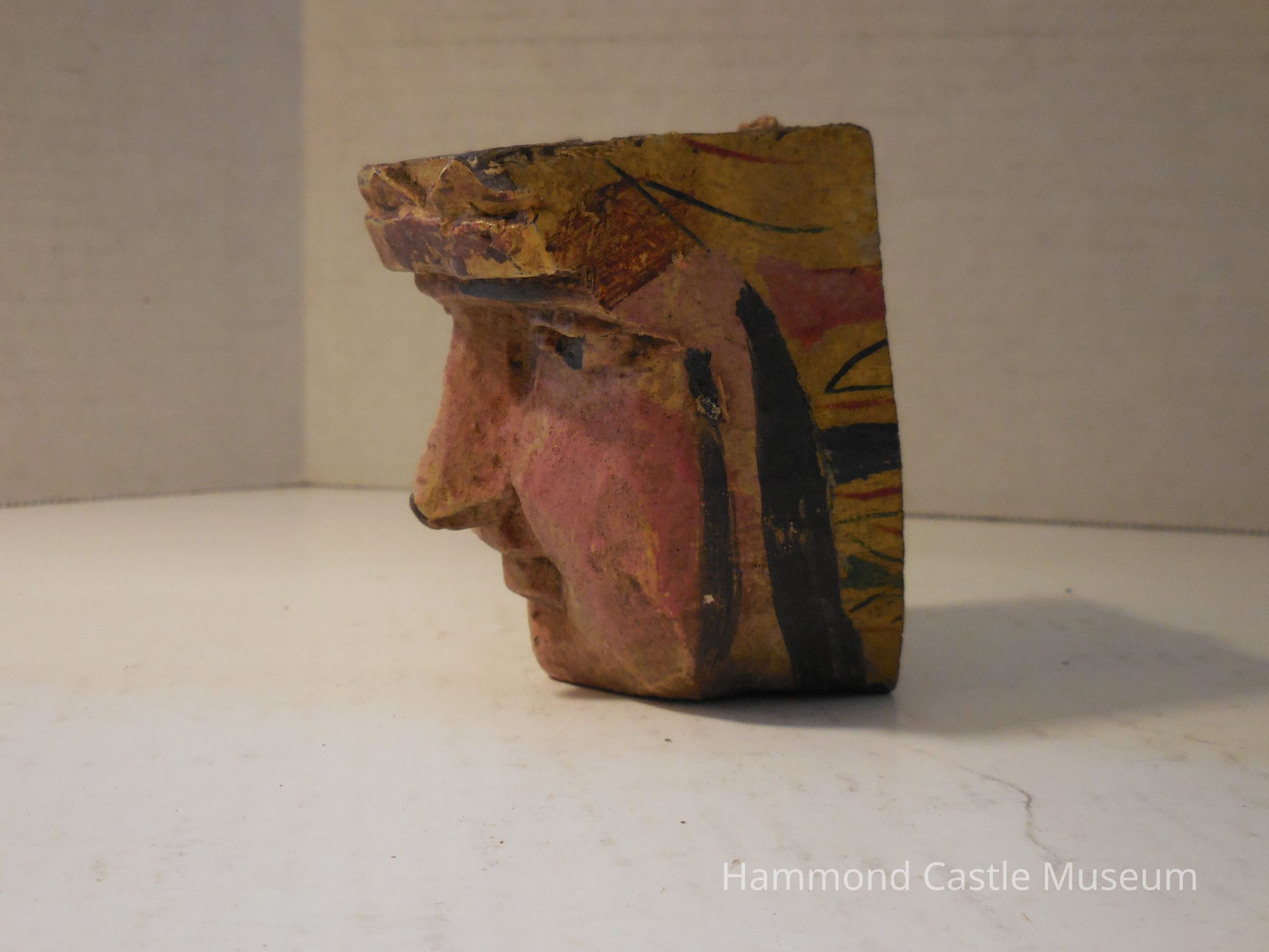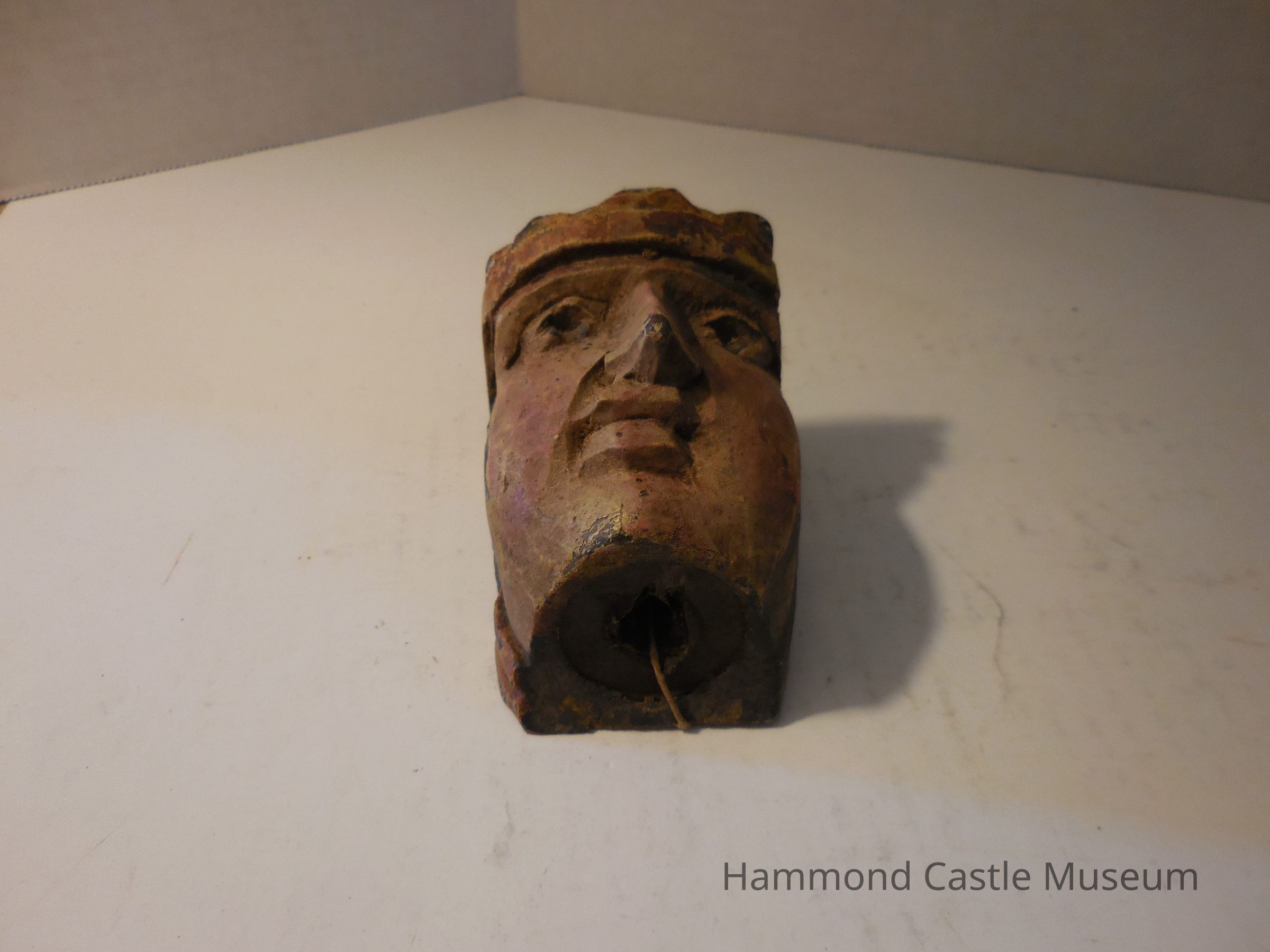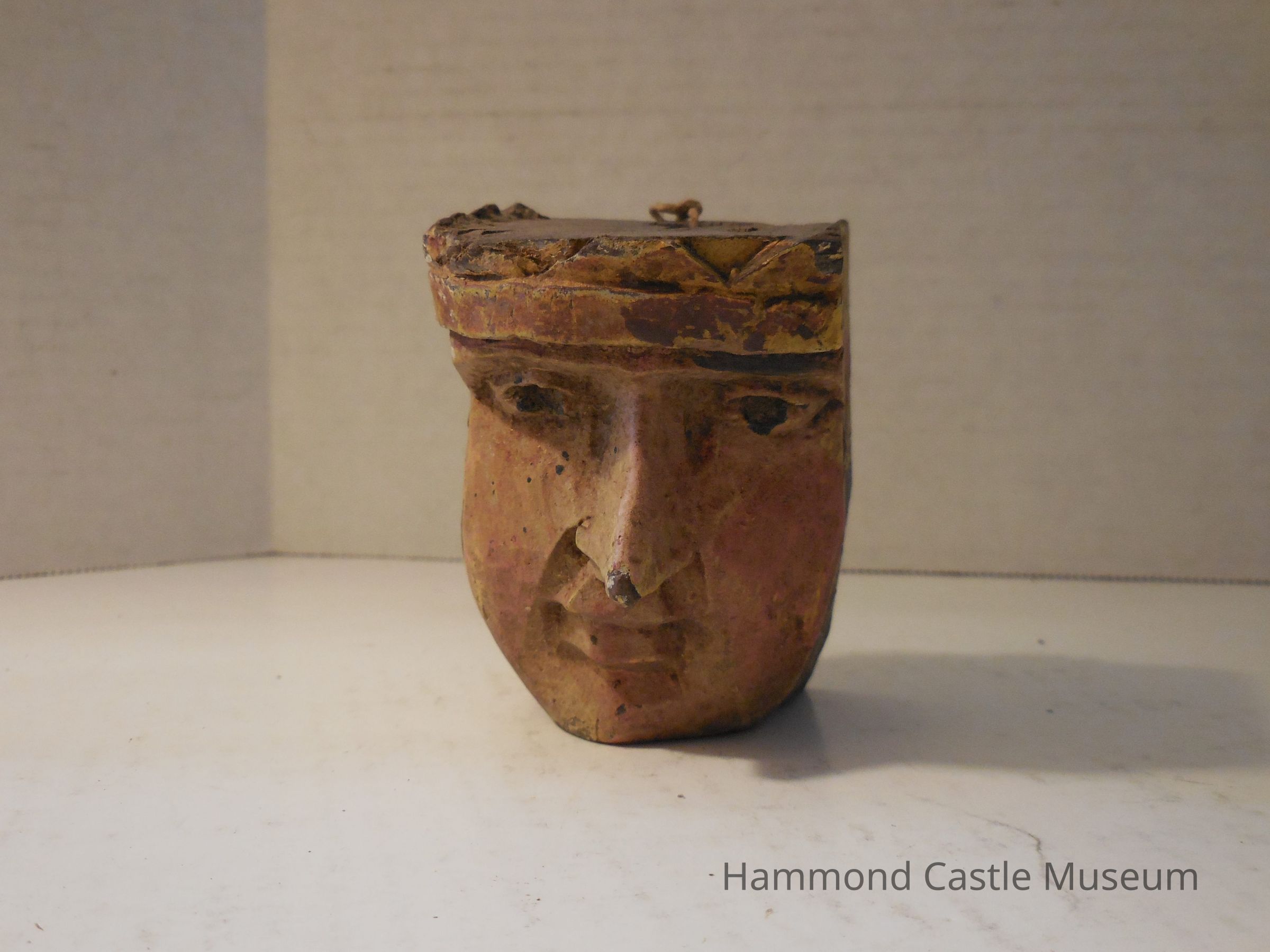 Carved wooden head painted red, brown and yellow with stripes on one side. Large mounting hole drilled from top to bottom, has a completely flat top and back.