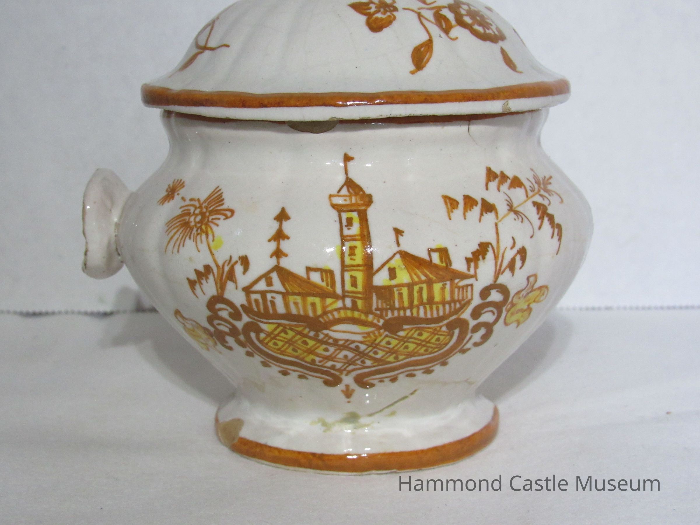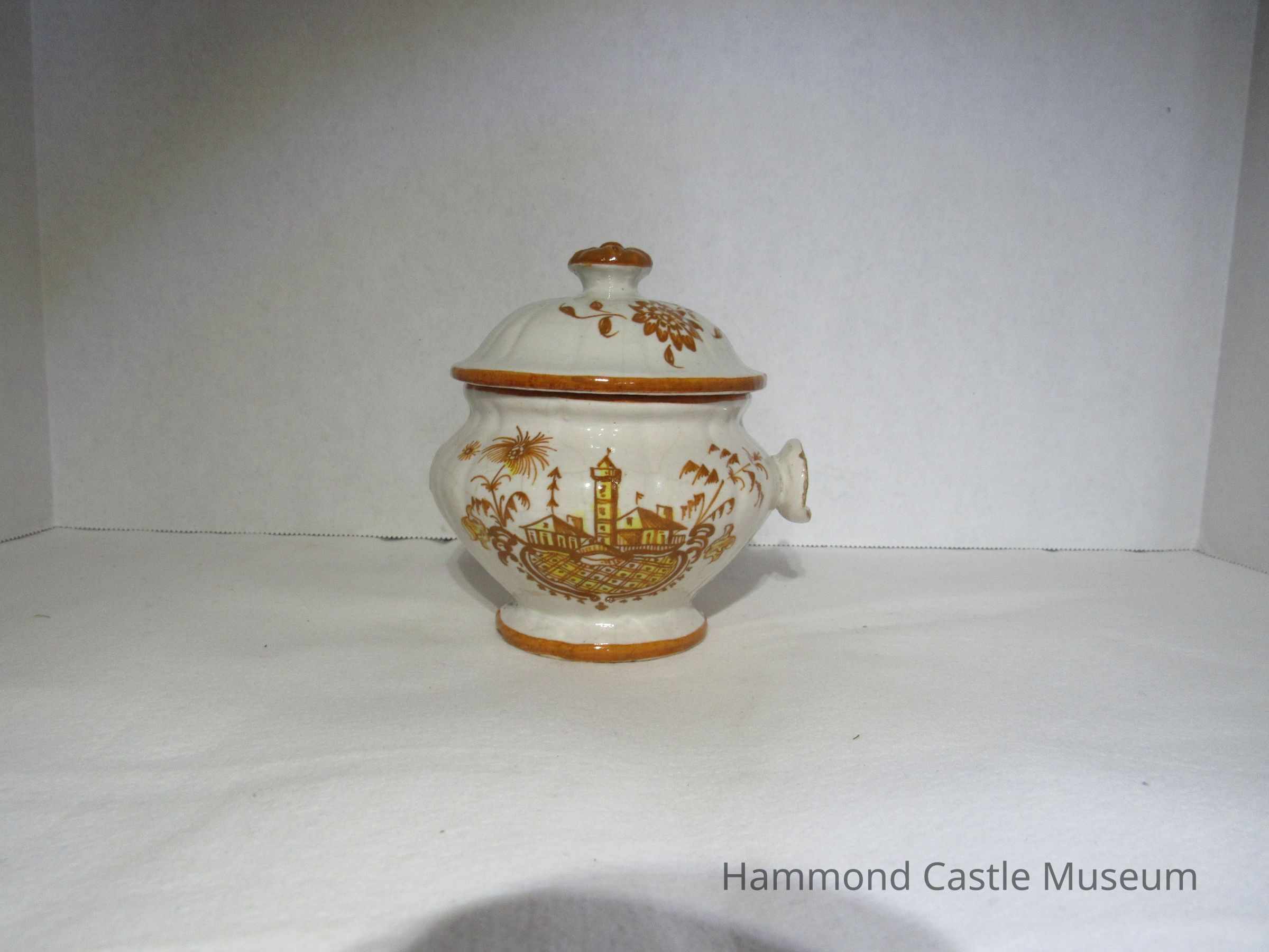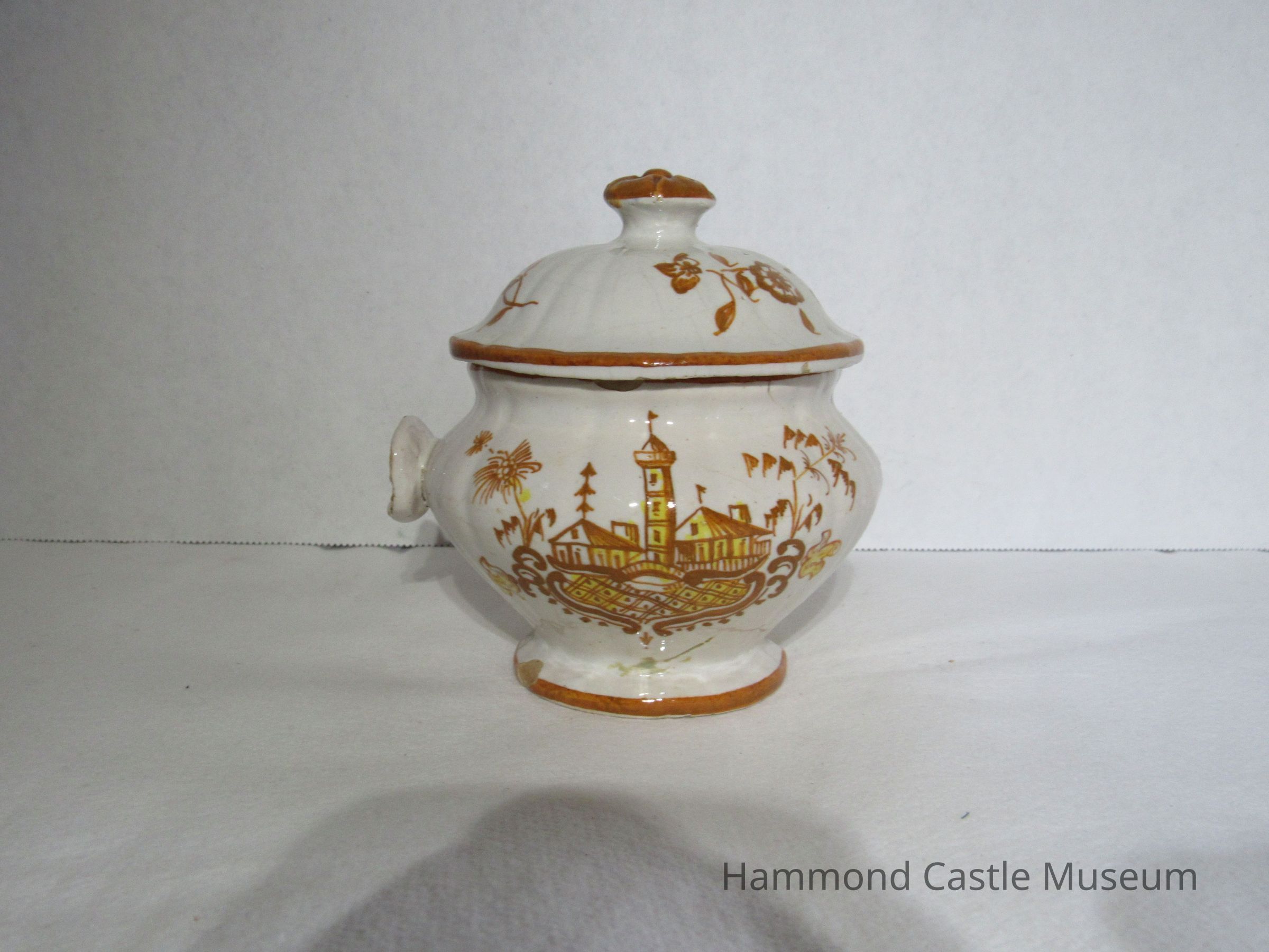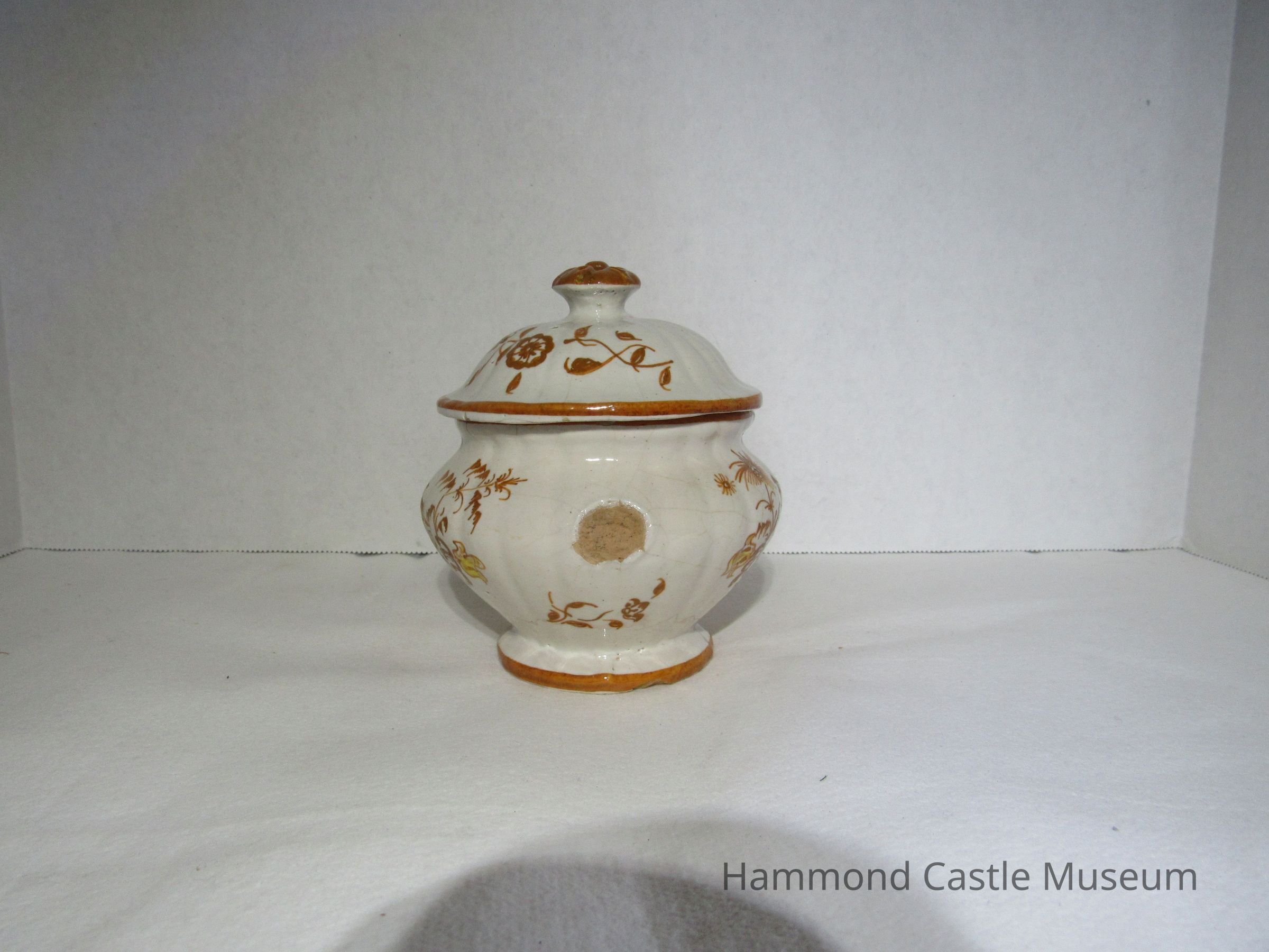 Yellow & Brown Italian Coffee Set - sugar bowl with lid Likely made by The Minardi Brothers of Faenza, Italy & purchased during Hammond's European travels Possibly referred to by Hammond as the "Capo di Monte" set