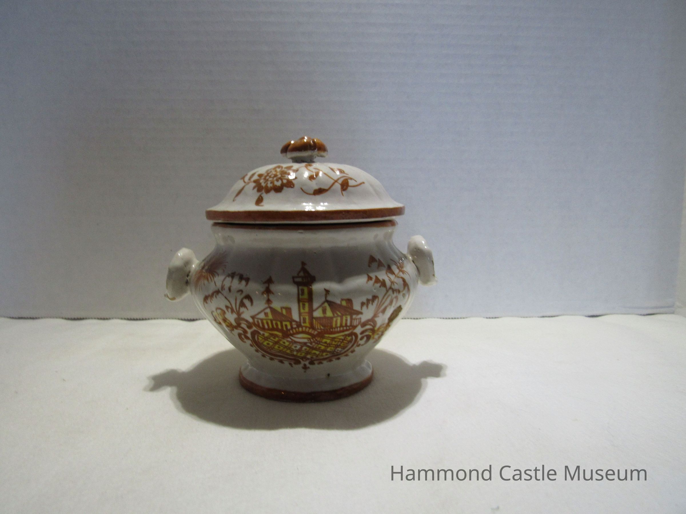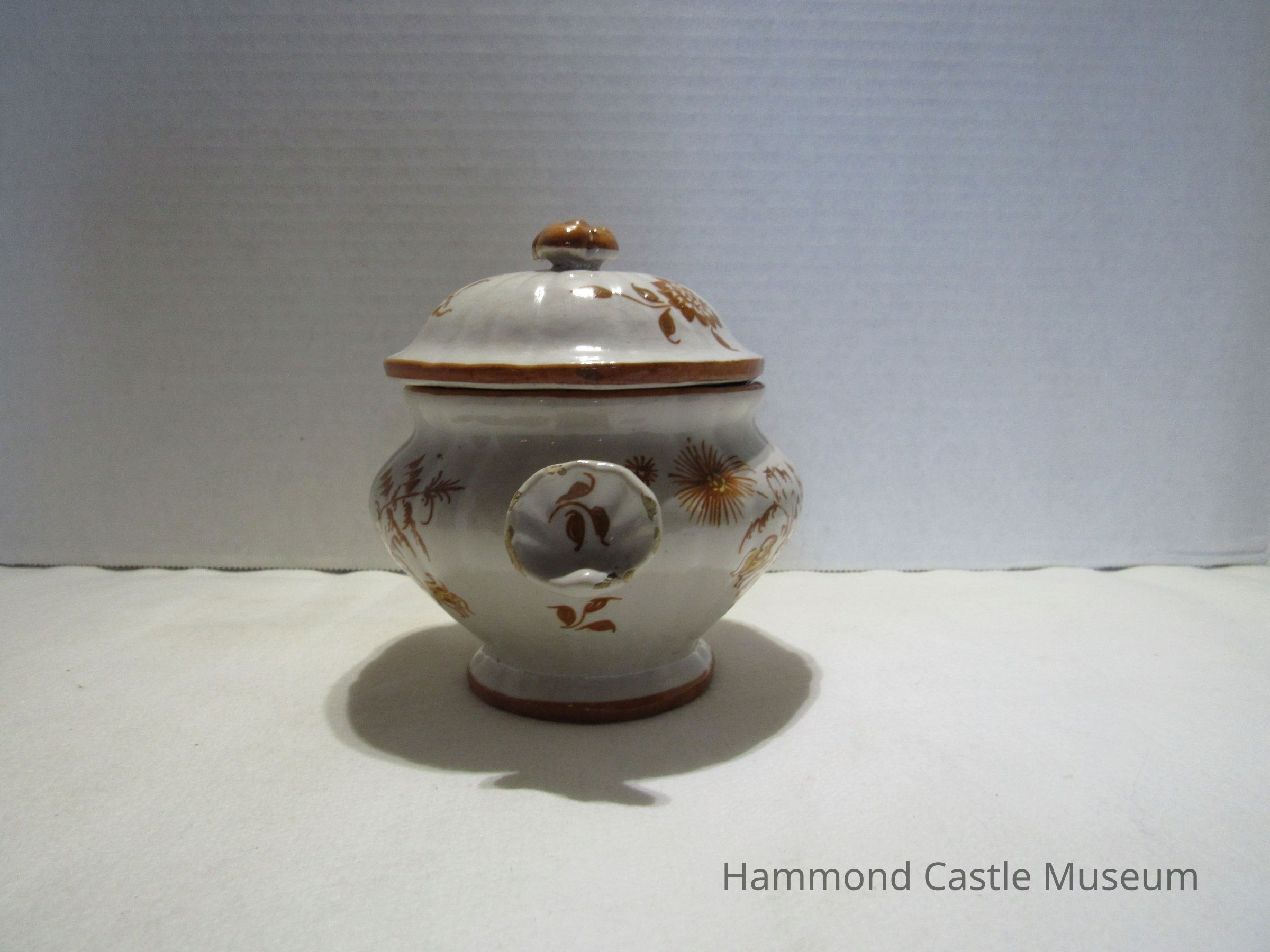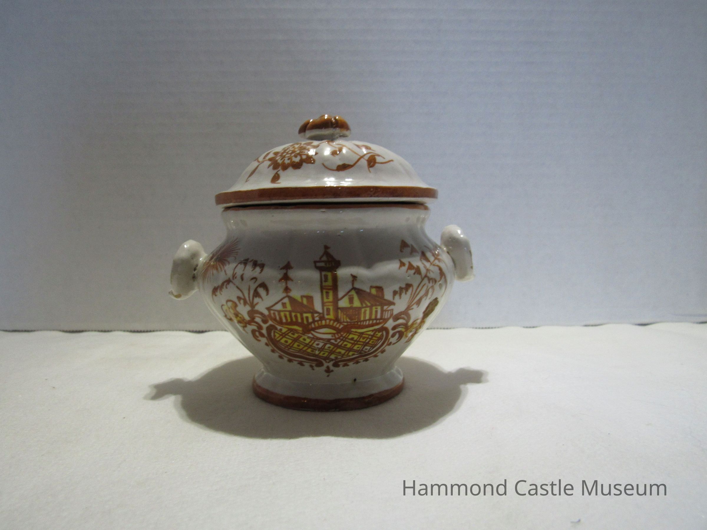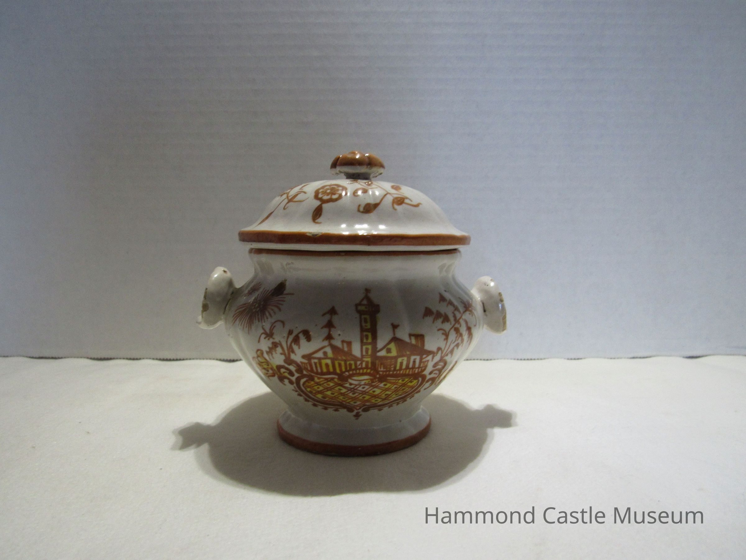 Painted ceramic Yellow & Brown Italian Coffee Set #1 a&b Sugar Bowl with Lid Likely made by The Minardi Brothers of Faenza, Italy & purchased during Hammond's European travels Possibly referred to by Hammond as the "Capo di Monte" set