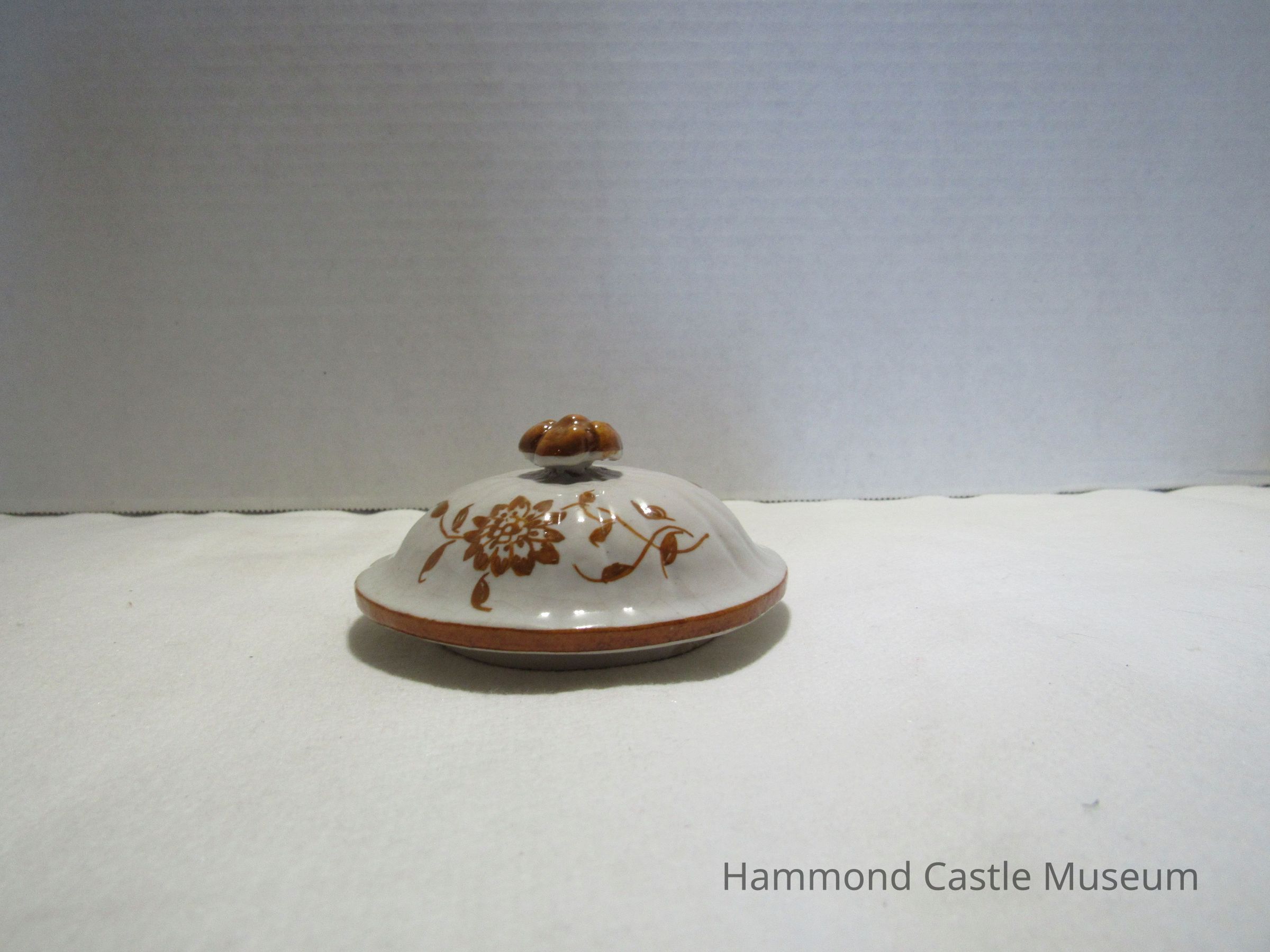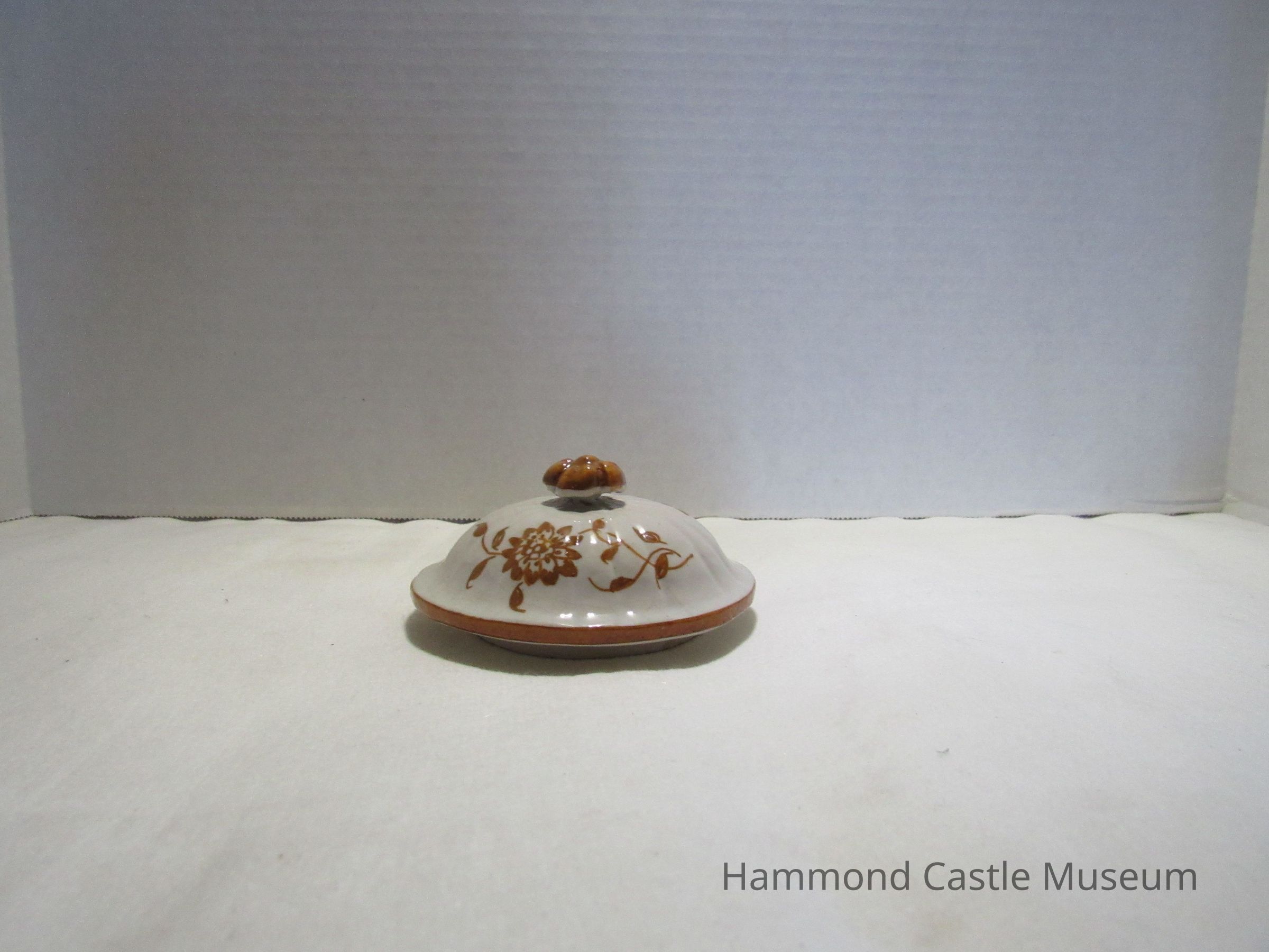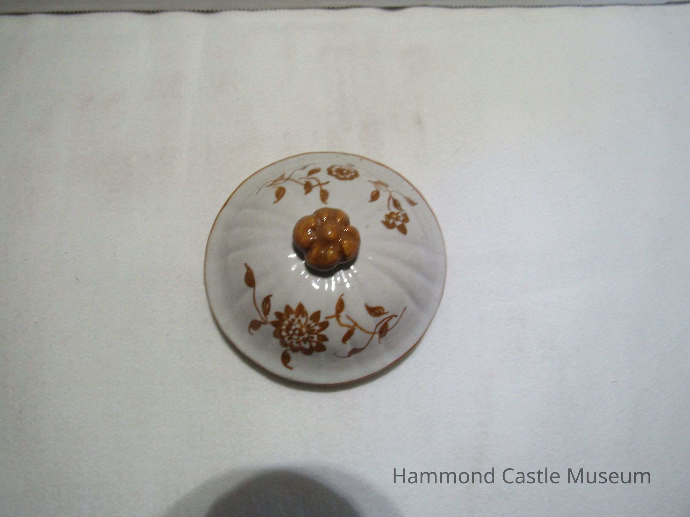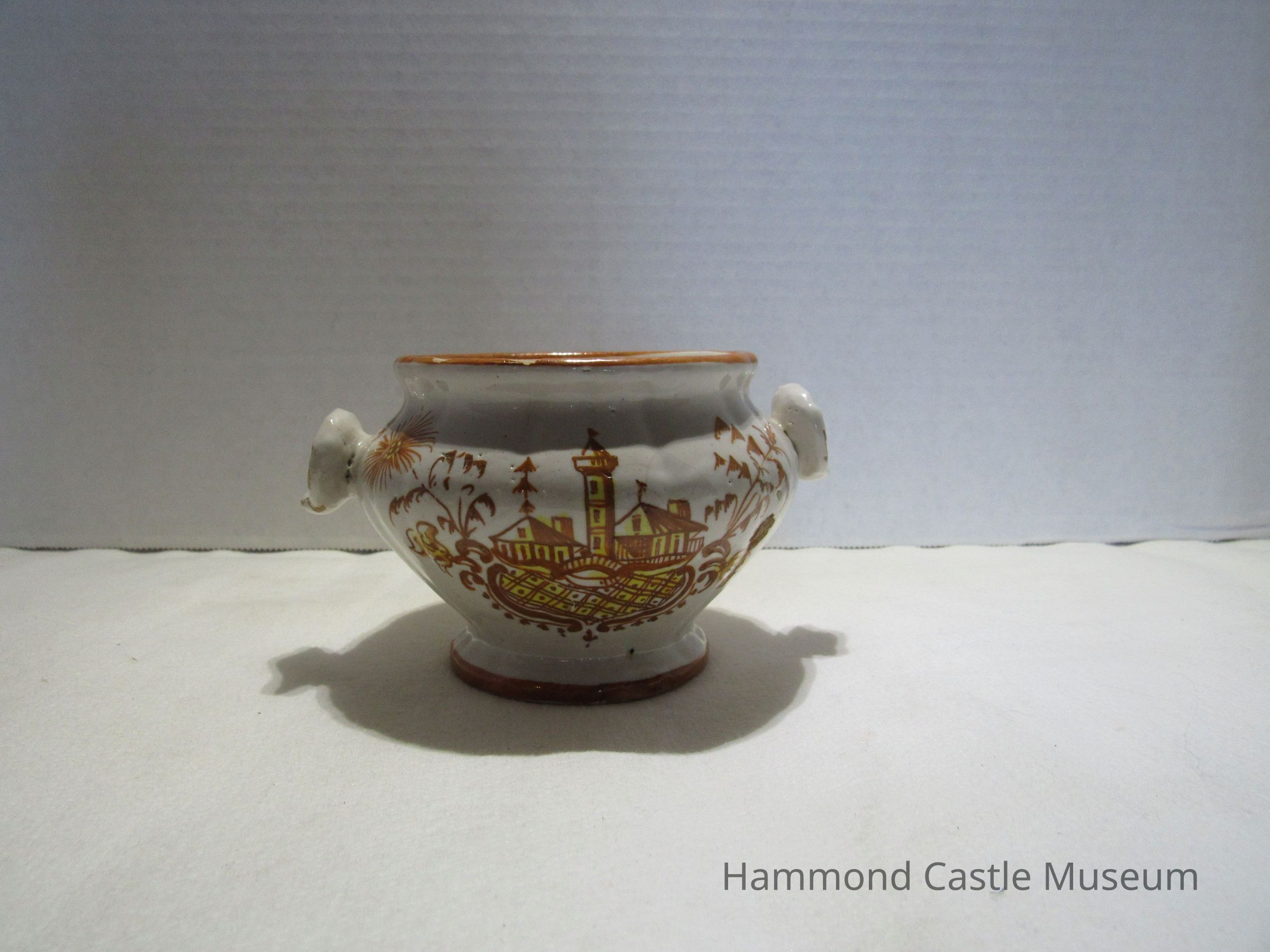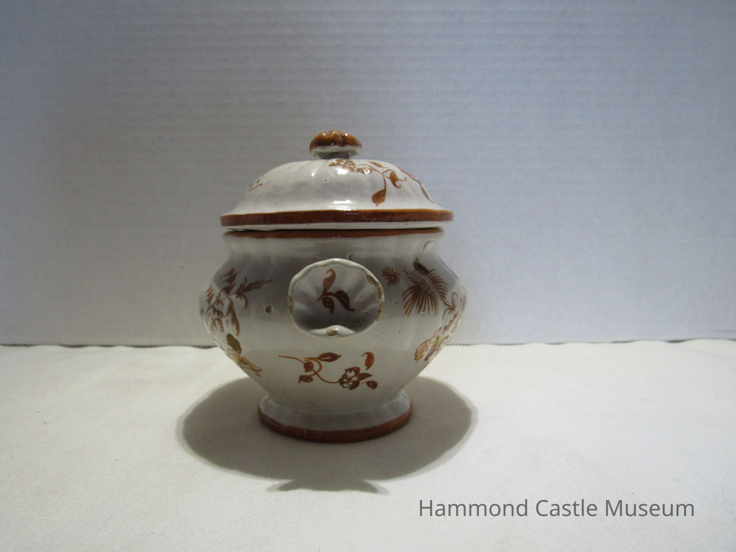 Painted ceramic Yellow & Brown Italian Coffee Set #1 a&b Sugar Bowl with Lid Likely made by The Minardi Brothers of Faenza, Italy & purchased during Hammond's European travels Possibly referred to by Hammond as the "Capo di Monte" set